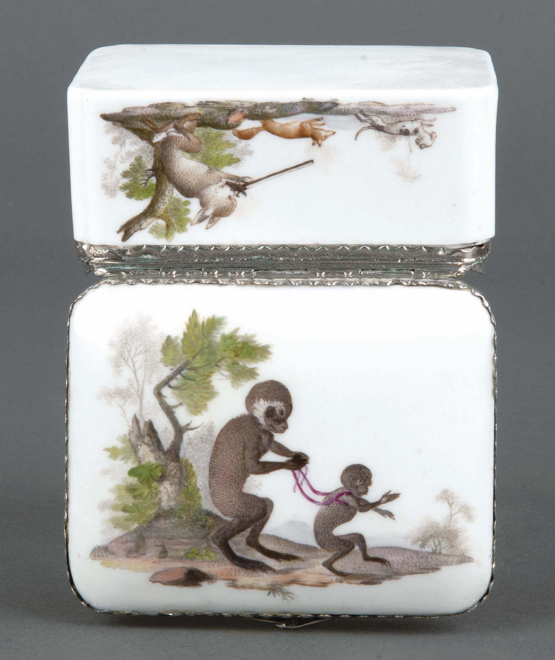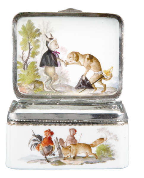 Meissen 1765 Rechteckig, mit nach oben zu öffnendem Deckel, verbunden durch ziselierte Silbermontur. Wandung, Deckel und Innendeckel bunt bemalt mit Tierfabeln in Landschaft. Porzellan, ohne Marke. Vgl. B. Beaucamp-Markowsky, S. 185, Nr. 141. H=4,9 cm, B=8,5 cm, T=7,2 cm € 4.600,- - Katalog-Nr: 27Tabatière