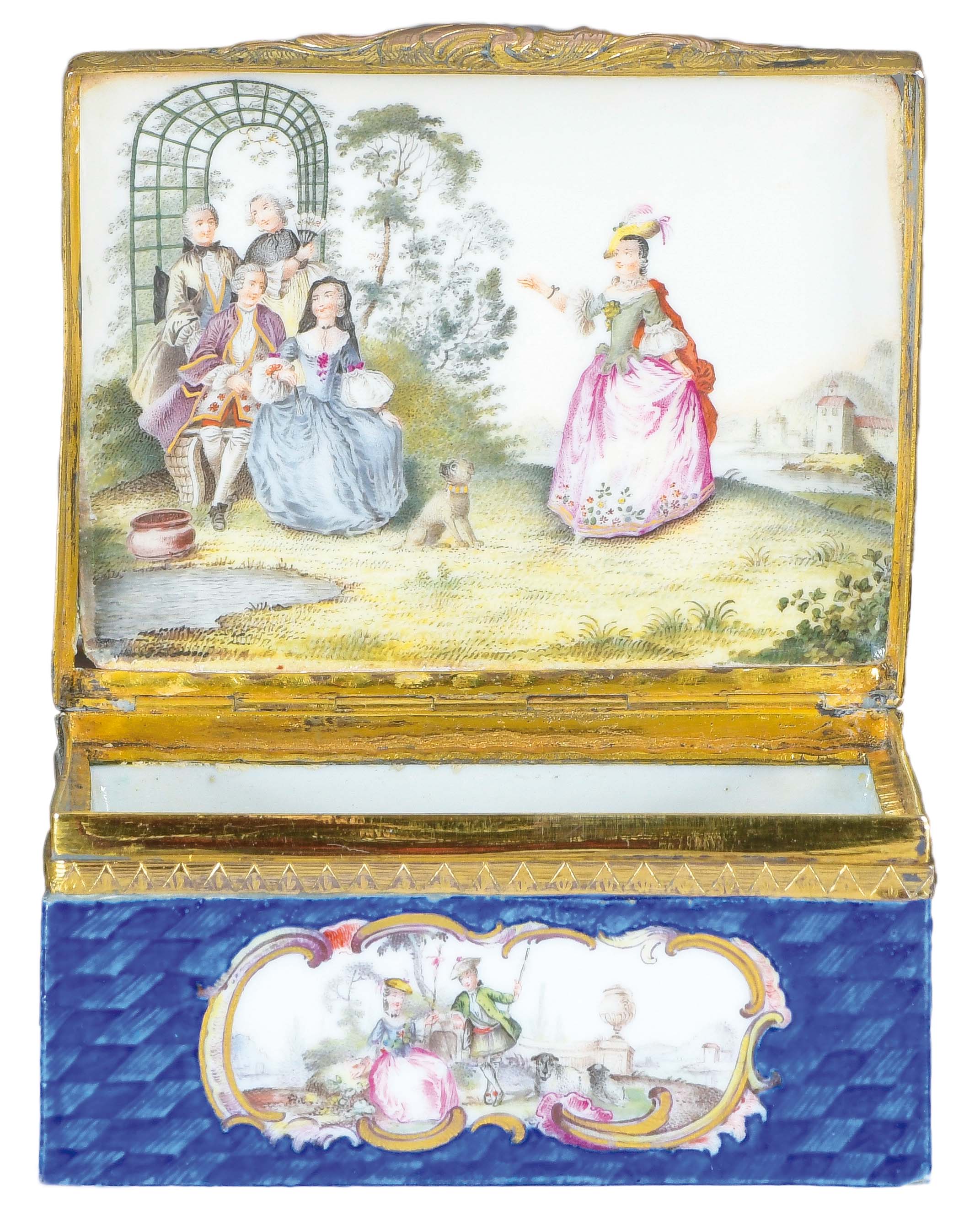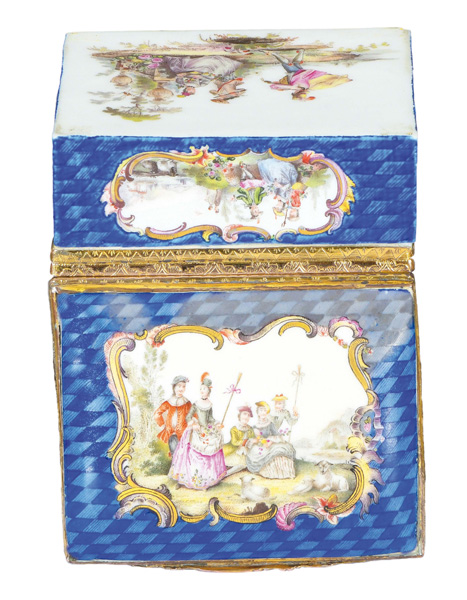Meissen 1750 Rechteckig, mit nach oben zu öffnendem Deckel, verbunden durch vergoldete Montur. Wandung und Deckel mit blauem Rautenmosaikfond und ovalen Aussparungen mit grau gesäumten Goldkartuschen. Reserven, Boden und Innendeckel bunt bemalt mit Schäfer- und Watteauszenen in Landschaft. Porzellan, ohne Marke. Vgl. B. Beaucamp-Markowsky, S. 114, Nr. 86. H=4,7 cm, B=8,7 cm, T=7,3 cm € 4.000,- - Katalog-Nr: 28Bedeutende Tabatière