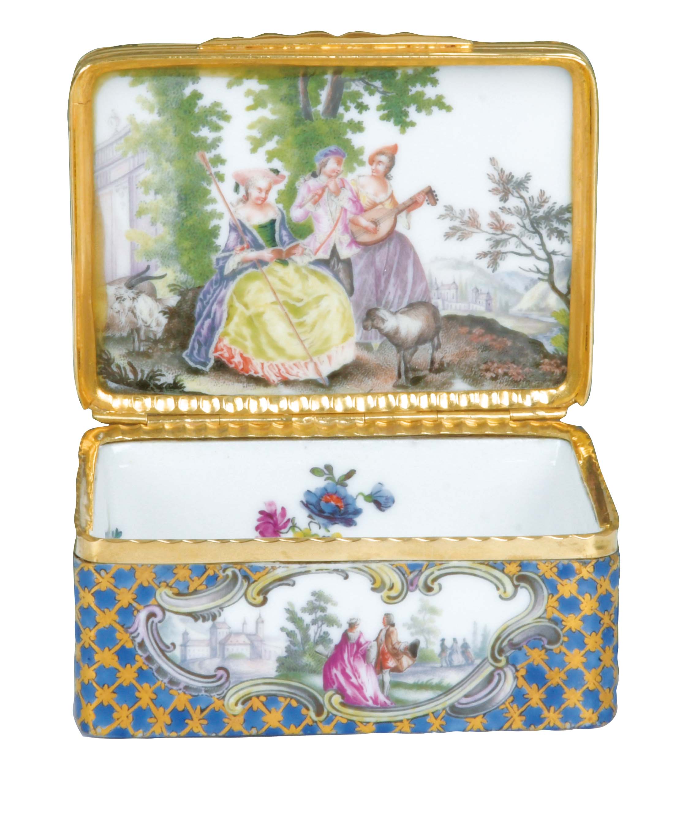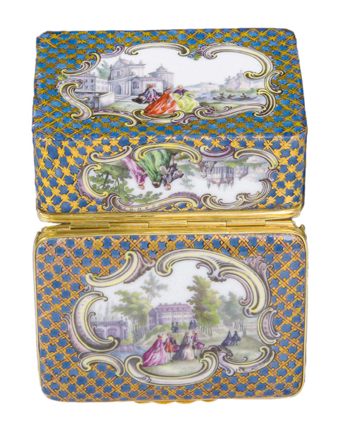 Meissen 1745-50 Rechteckig, mit nach oben zu öffnendem Deckel, verbunden durch Goldmontur. Außenflächen mit blau staffiertem Fond, überdekoriert mit gold gehöhtem Netzdekor. Aussparungen gesäumt von Rocaillekartuschen. Reserven und Innendeckel fein bunt bemalt mit Architekturen und Personenstaffage. Innenboden und -wandung bunt bemalt mit Streublumen. Porzellan, ohne Marke. Vgl. B. Beaucamp-Markowsky, S. 114, Nr. 86. H=3,6 cm, B=7,8 cm, T=6,1 cm € 5.000,- - Katalog-Nr: 29Tabatière