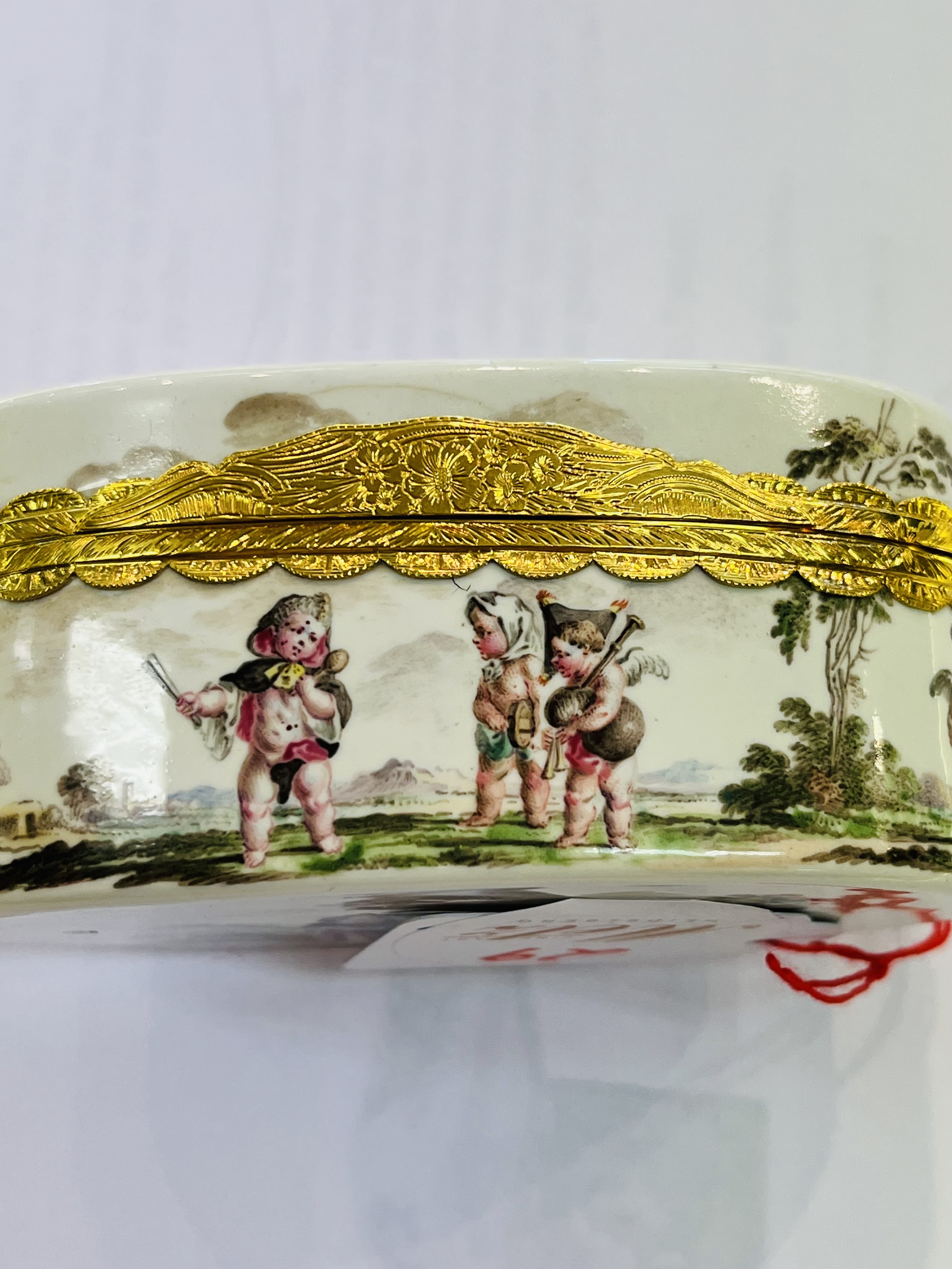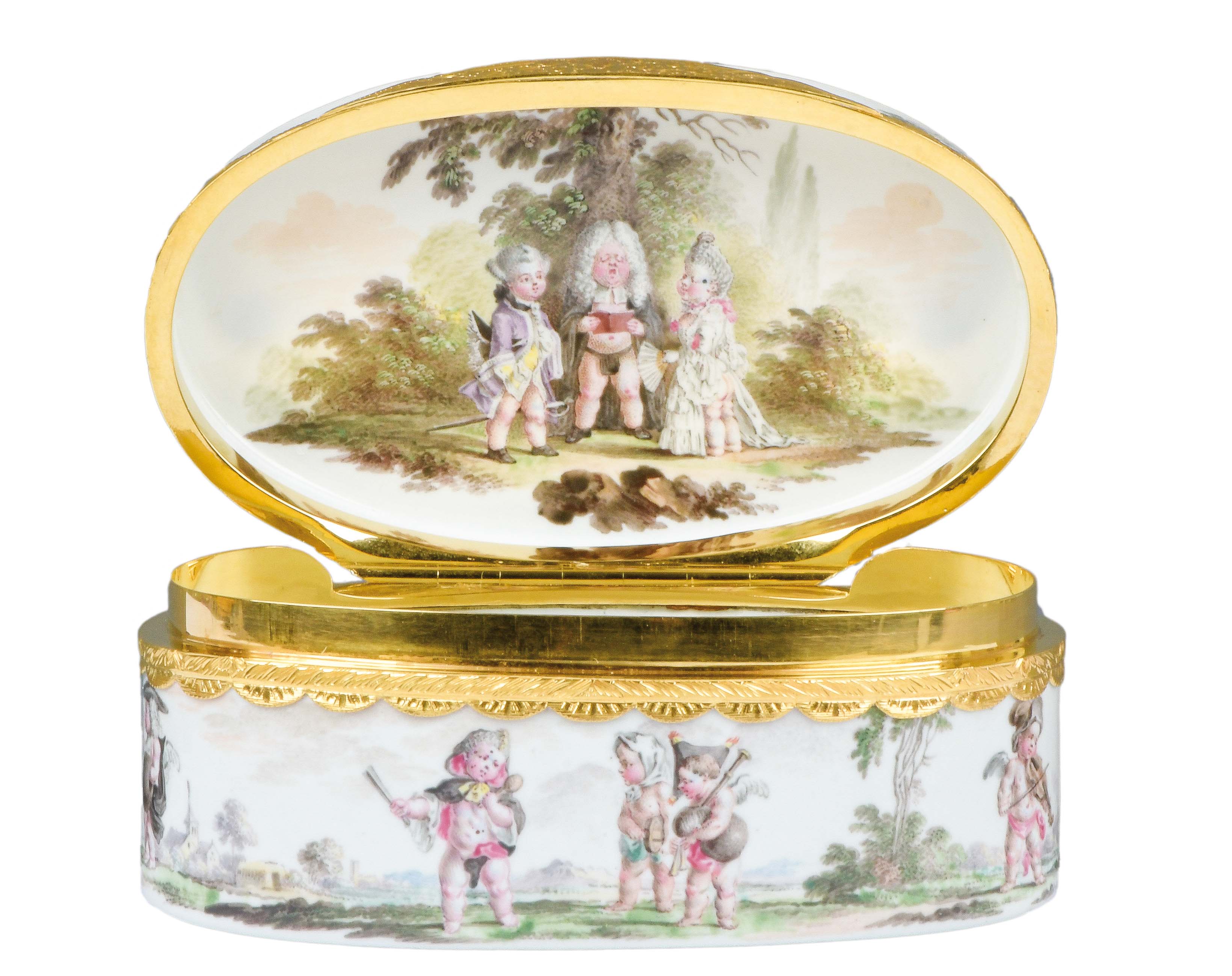 Meissen 1750 Oval, mit nach oben zu öffnendem Deckel, verbunden durch Goldmontur. Außenflächen mit rocaillereliefierten Kartuschen, floral gesäumt. Reserven und Innendeckel bunt bemalt mit auf Wolken schwebenden Putten bzw. in Landschaft. Porzellan, ohne Marke. Provenienz: Kunsthandel Röbbig, München. Vgl. B. Beaucamp-Markowsky, S. 212, Nr. 168. H=4,7 cm, B=8,2 cm, T=6,6 cm € 4.000,- - Katalog-Nr: 44Tabatière