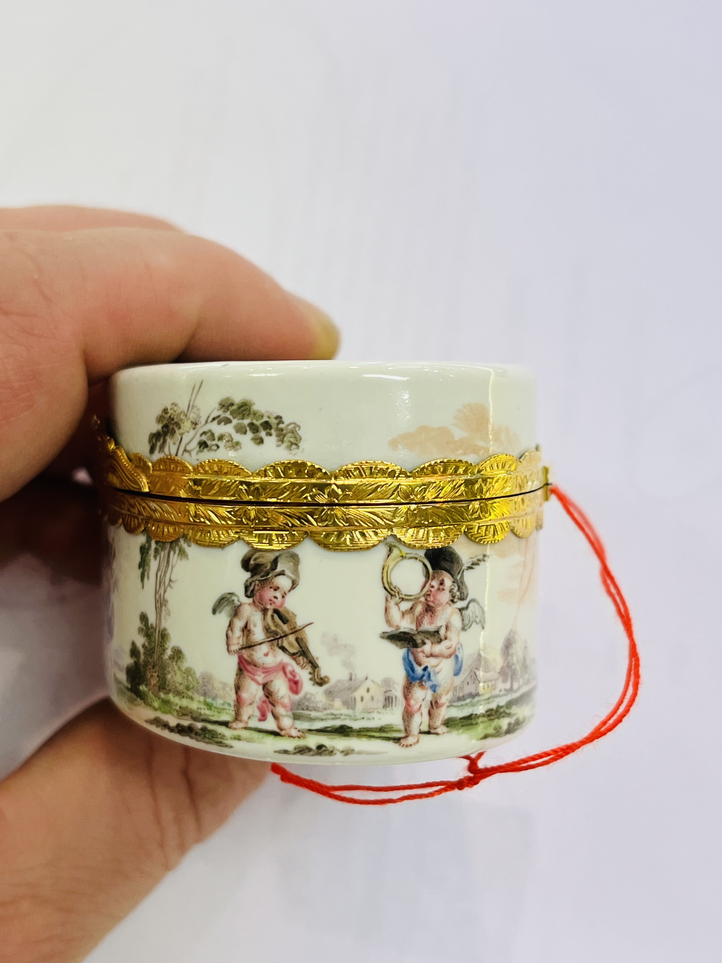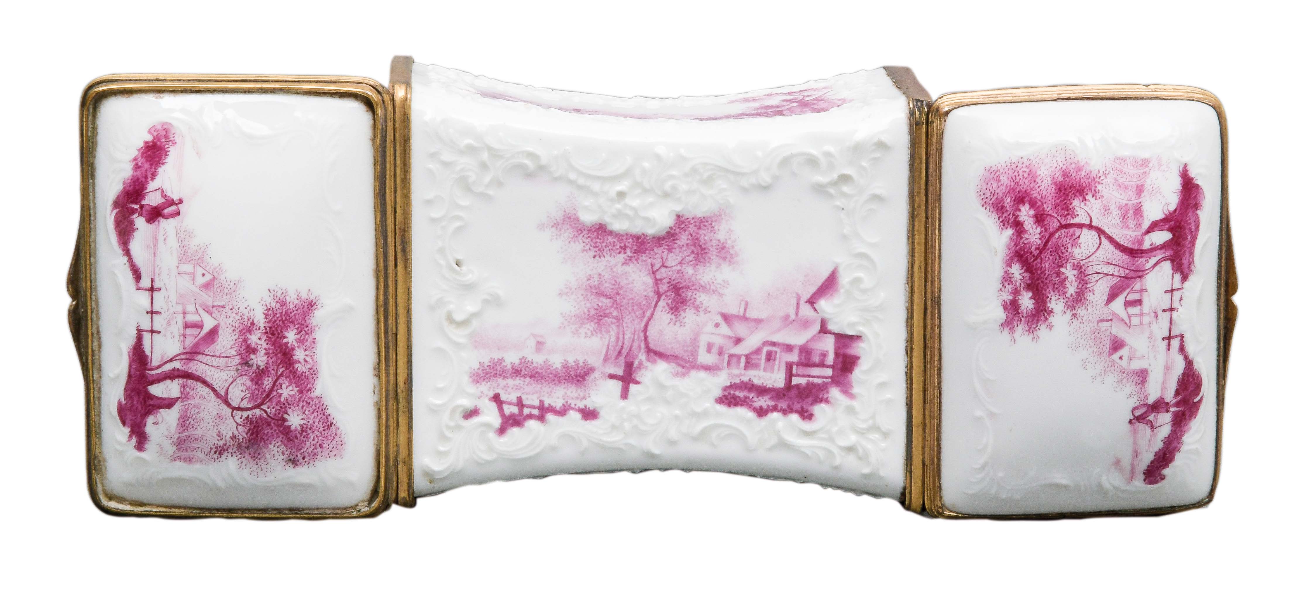 Fürstenberg 1760 Konkav, mit beidseitig an den Böden zu öffnenden Deckeln, verbunden durch reliefierte, vergoldete Montur. Wandung mit Rocaillerelief. Reserven bunt bemalt mit purpurnen Landschaften. Innendeckel bunt bemalt mit Schäferpaar in Landschaft. Porzellan, ohne Marke. Malerei von Heinrich Eisenträger. Vgl. B. Beaucamp-Markowsky, S. 301, Nr. 248. H=6,4 cm, B=9,9 cm, T=4,6 cm € 2.600,- - Katalog-Nr: 32Tabatière