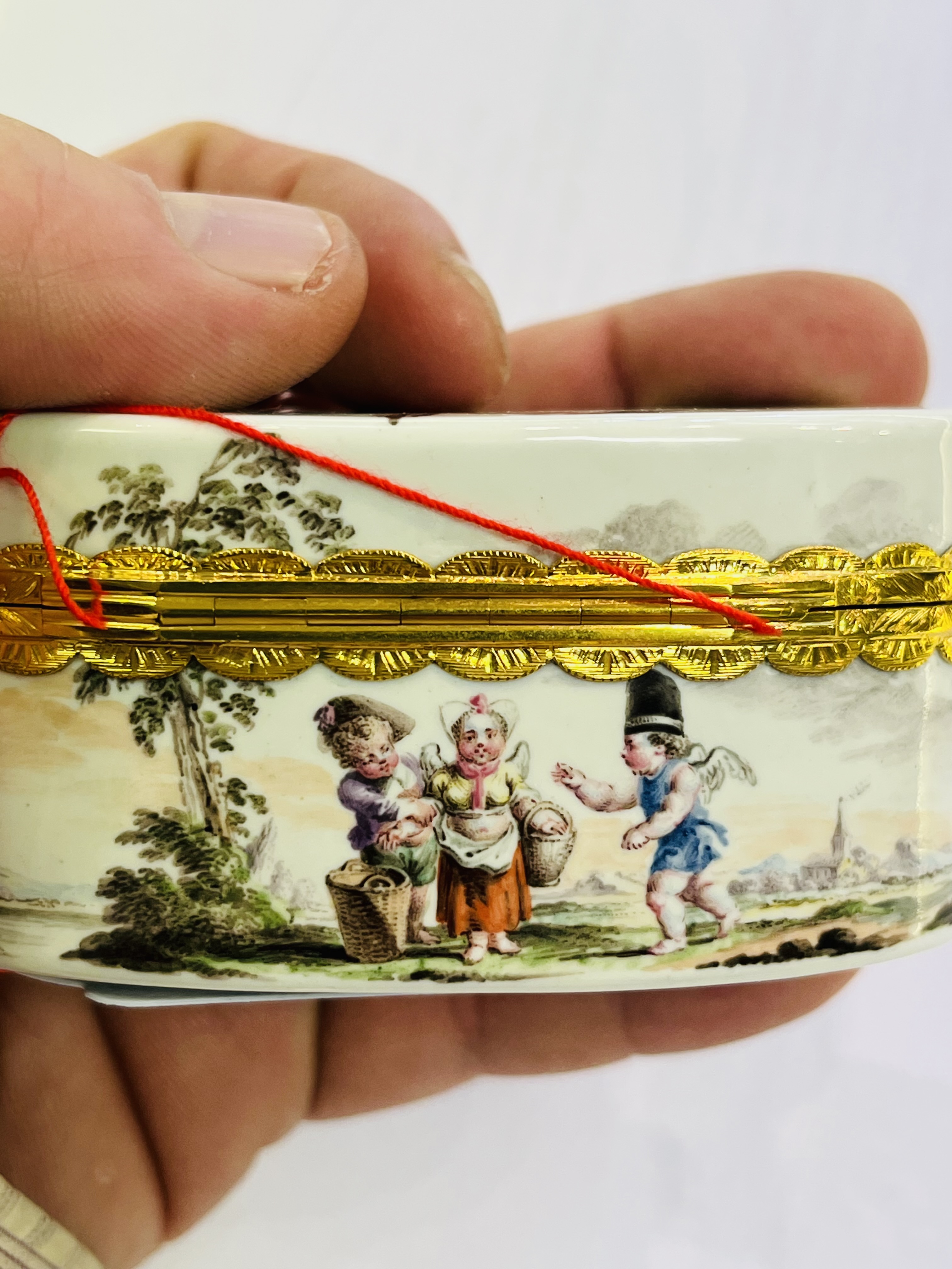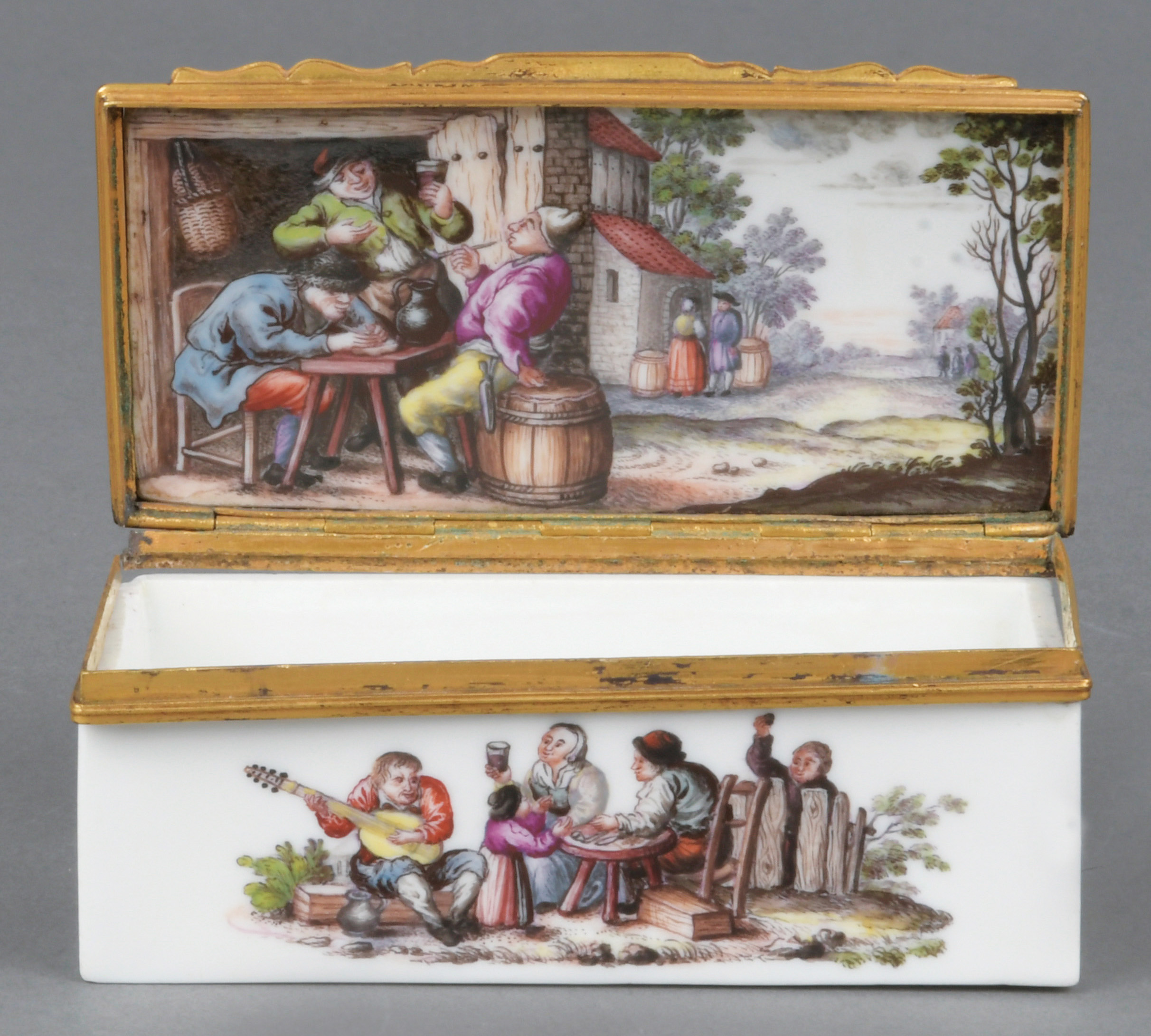 Höchst 1775 Rechteckig, mit nach oben zu öffnendem Deckel, verbunden durch vergoldete Montur. Außenflächen sowie Innendeckel bunt bemalt mit musizierenden und tanzenden Bauern in Landschaft. Porzellan, ohne Marke. Malerei wohl von Johann Heinrich Usinger. H=3,9 cm, B=10,6 cm, T=5,6 cm € 2.500,- - Katalog-Nr: 39Tabatière