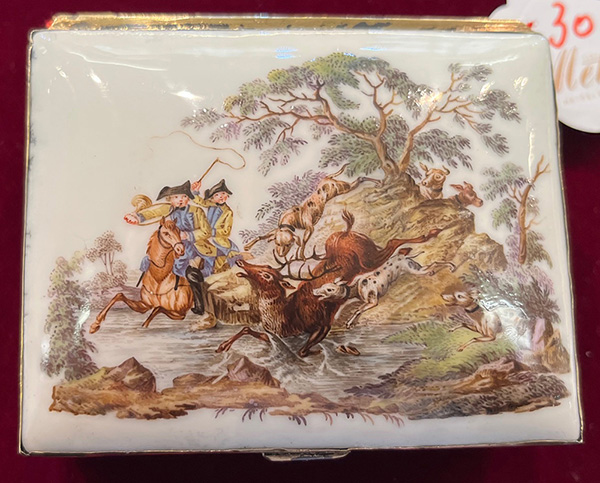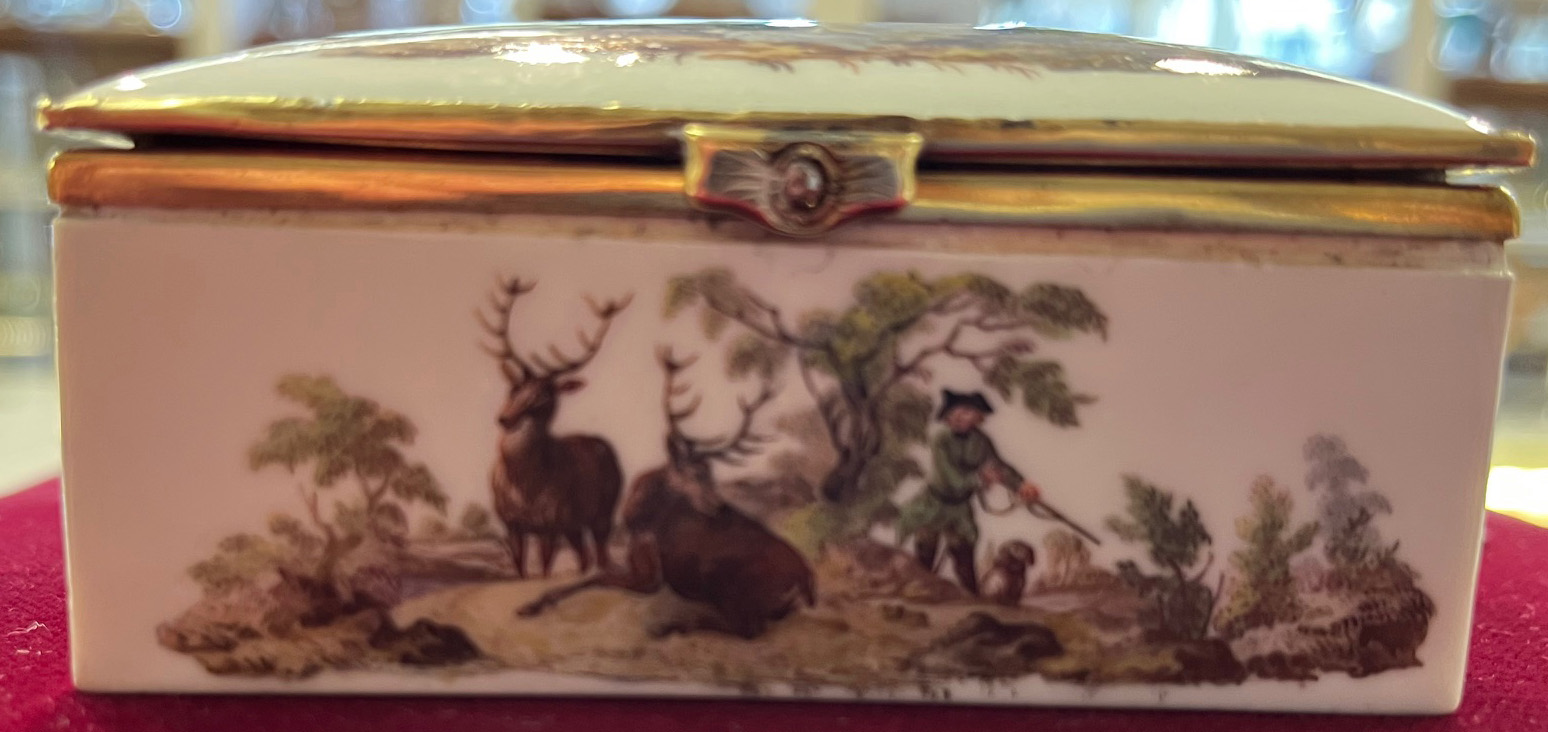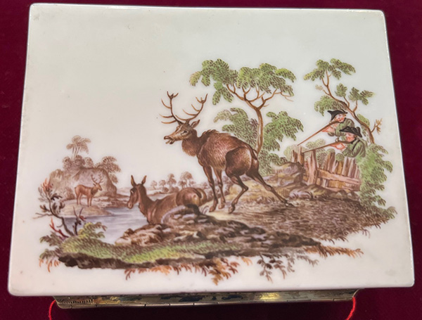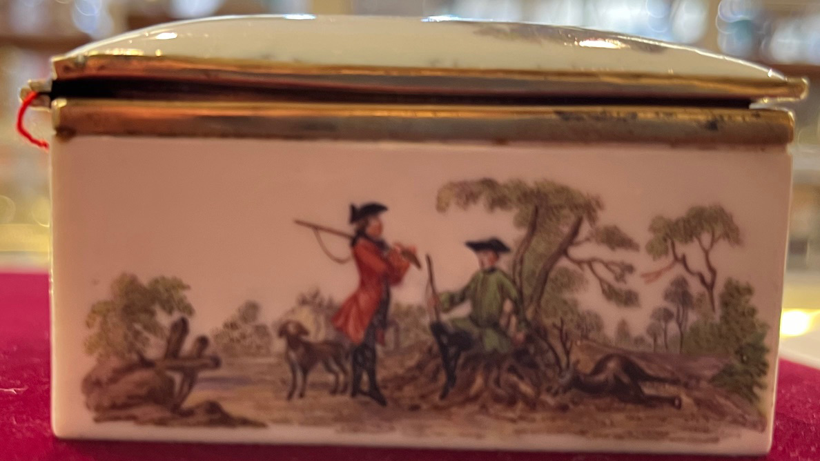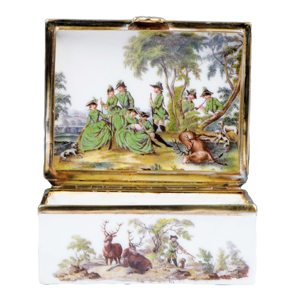 Meissen um 1750 Rechteckig, mit nach oben zu öffnendem Deckel, verbunden durch vergoldete Montur. Außenflächen und Innendeckel fein bunt bemalt mit sächsischen Parforcejagdreitern, Jagdlivree, Piqueure und Hundeführer. Porzellan, ohne Marke. Malerei von Christian Friedrich Kühnel. (an einer Ecke min. nicht sichtbar rest.) H=4 cm, B=8,4 cm, T=7,2 cm € 2.800,- - Katalog-Nr: 31Doppeldeckel-Tabatière