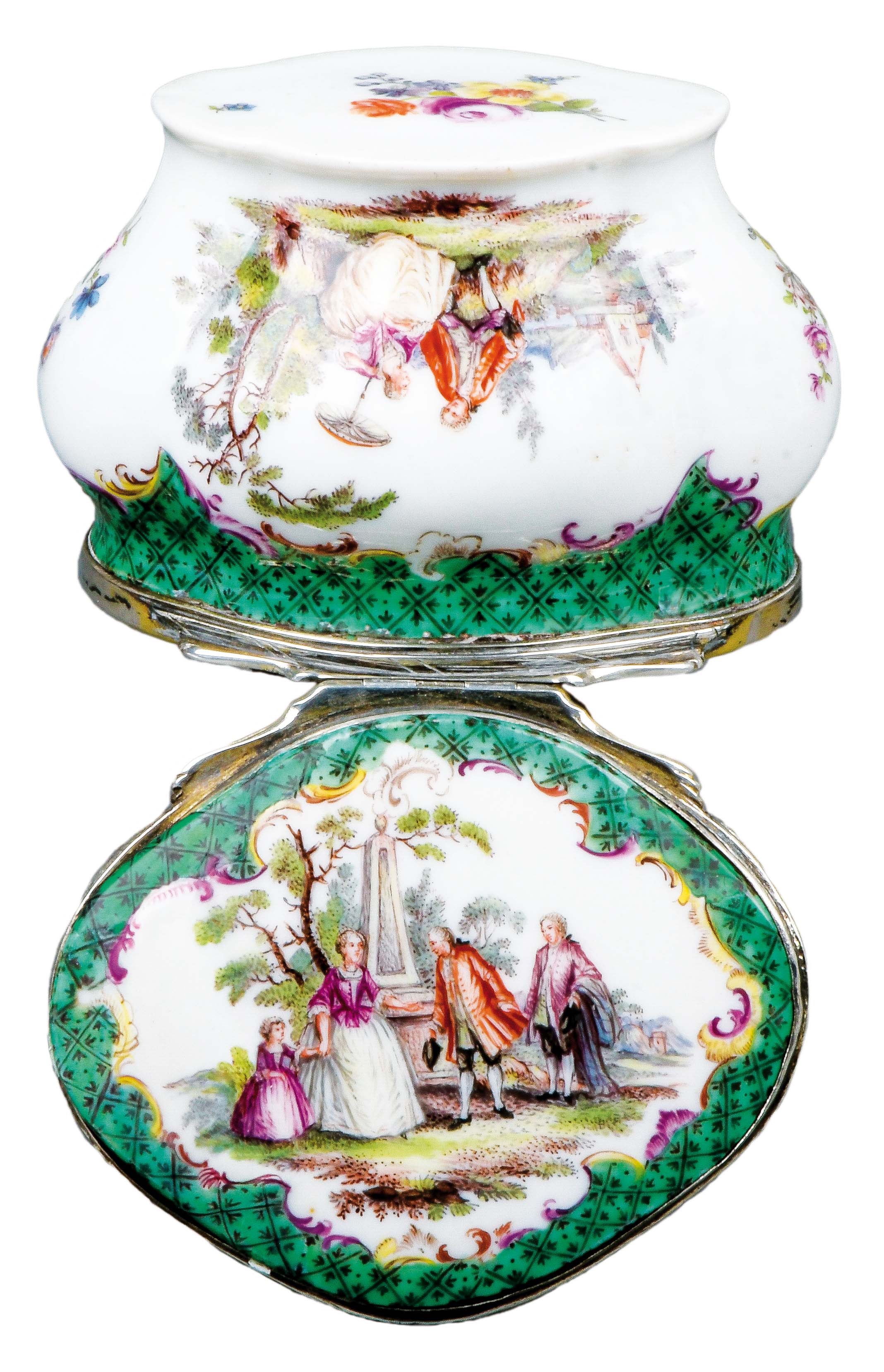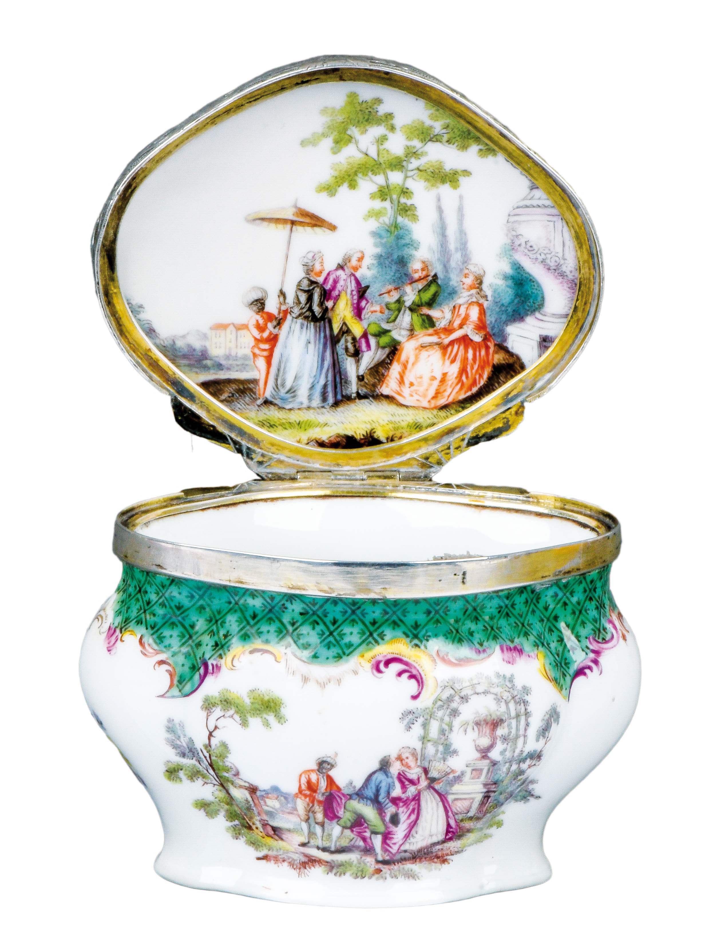 Meissen 1750 Vierpassig, mit nach oben zu öffnendem Deckel, verbunden durch Silbermontur. Wandung und Deckel beidseitig bunt bemalt mit Watteauszenen und Mohren in Parklandschaft. Umlaufend mit breiter kupfergrüner und purpur gesäumter Bordüre. Am Boden bunt bemalt mit Blumenbouquet. Porzellan, ohne Marke. H=5 cm, B=6,7 cm, T=5,3 cm € 3.600,- - Katalog-Nr: 33Tabatière