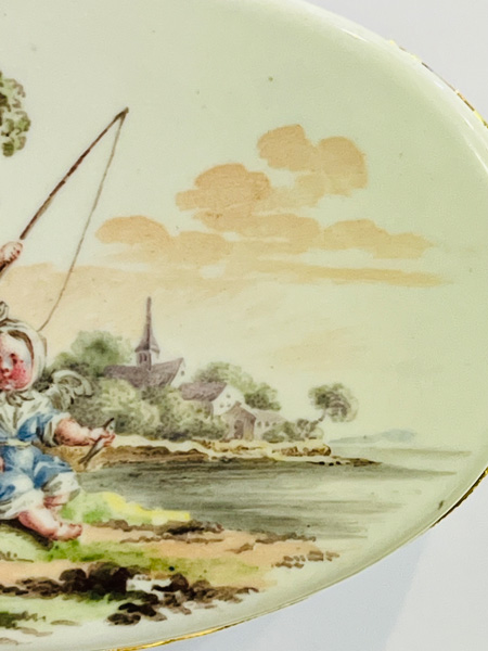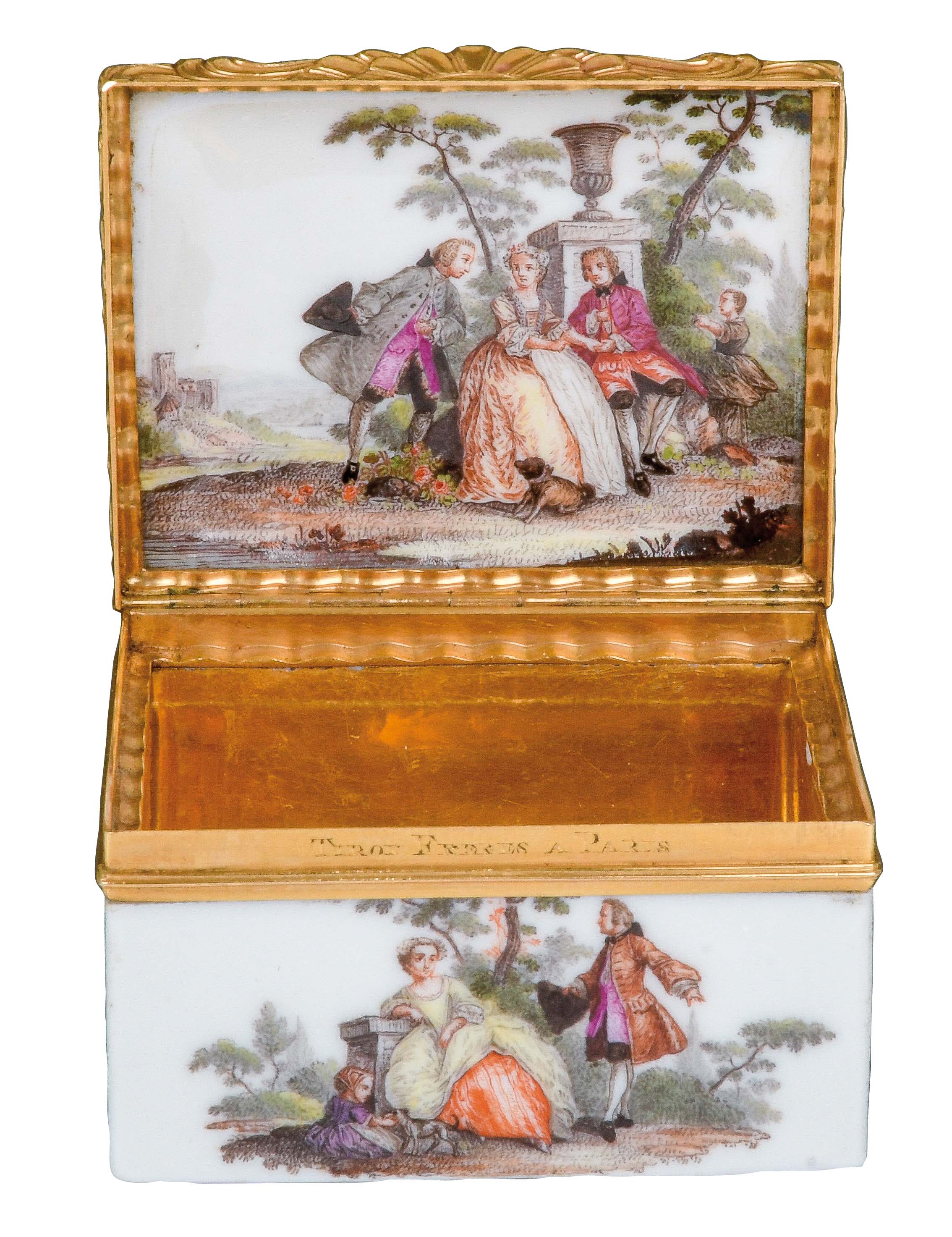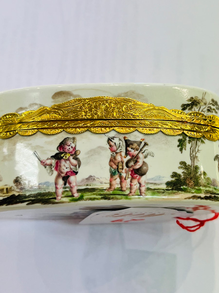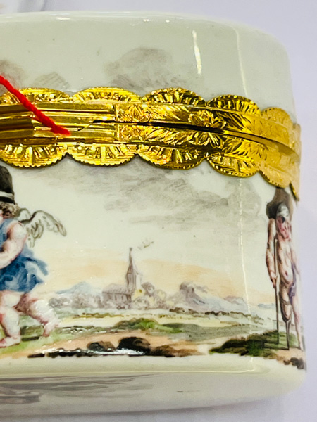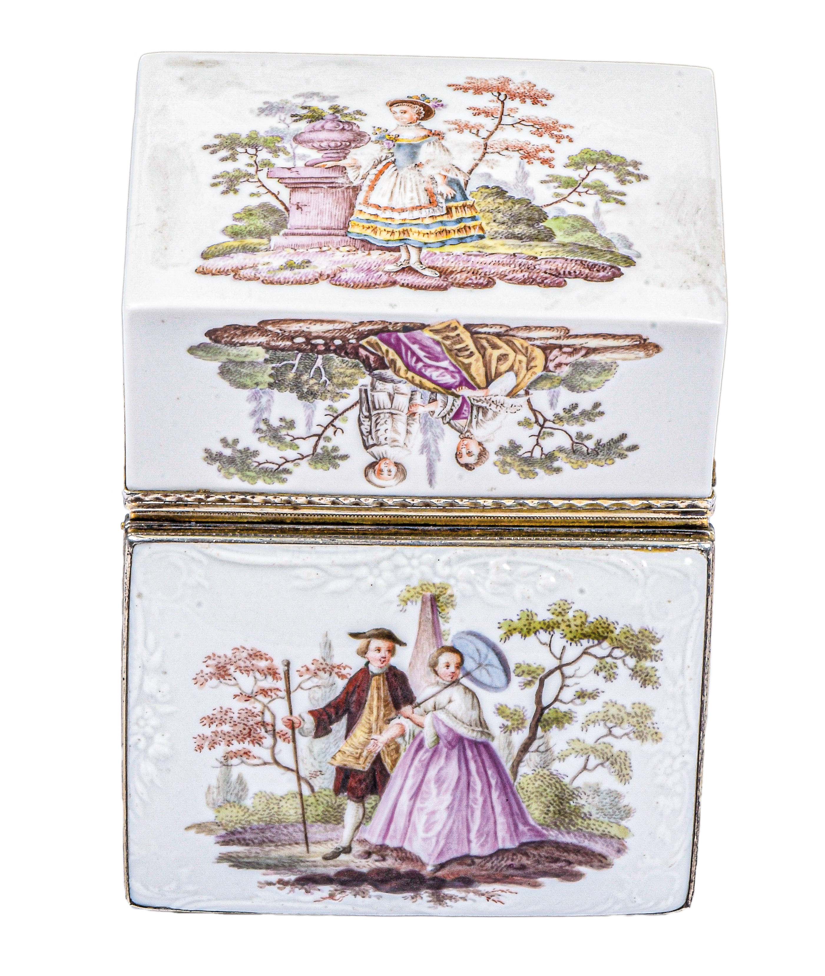 Fürstenberg 1760 Rechteckig, mit nach oben zu öffnendem Deckel, verbunden durch vergoldete, ziselierte Montur. Außenflächen bunt bemalt mit galanten bzw. Komödienszenen. Innendeckel bunt bemalt mit zwei Offizieren, zwei Marketenderinnen sowie einem Zeltlager mit Soldaten im Hintergrund. Porzellan, ohne Marke. Malerei wohl von Louis Victor Gerverot. H=4,8 cm, B=7,8 cm, T=5,8 cm € 3.600,- - Katalog-Nr: 42Tabatière
