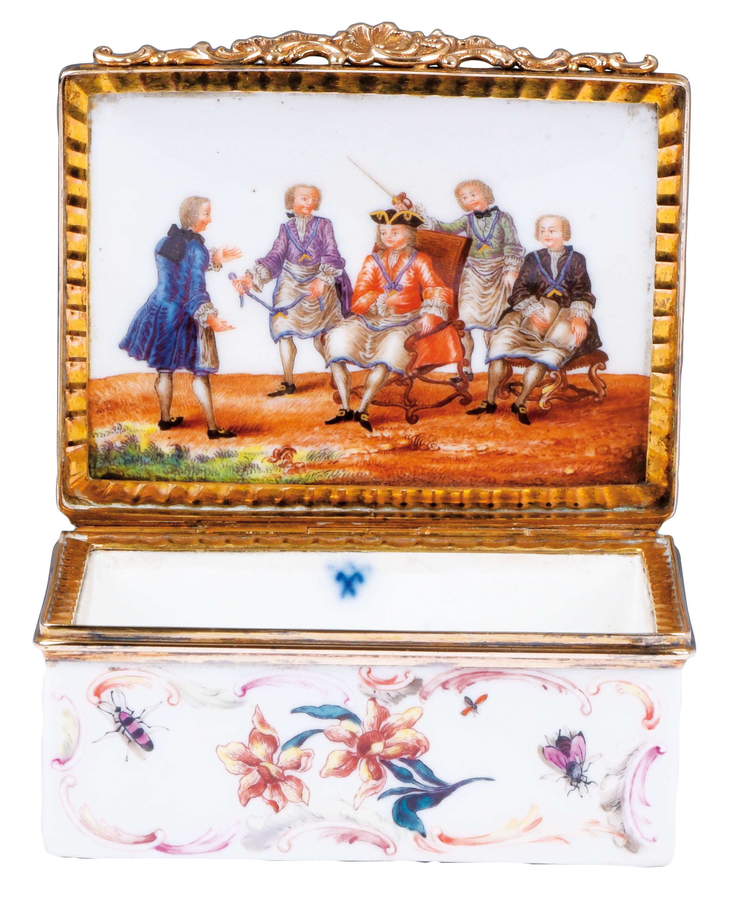 Meissen 1745-50 Rechteckig, mit nach oben zu öffnendem Deckel, verbunden durch vergoldete Montur. Außenflächen mit zart modellierten Rocaillekartuschen, rosé, gelb und purpur gesäumt. Reserven fein bunt bemalt Holzschnittblumen und Insekten. Innendeckel bunt bemalt mit Szene der Johannisloge mit Personenstaffage. Porzellan, an der Innenwandung unterglasurblaue Schwertermarke. H=3,5 cm, B=7,1 cm, T=5,9 cm € 8.500,- - Katalog-Nr: 35Tabatière „Freimaurer“