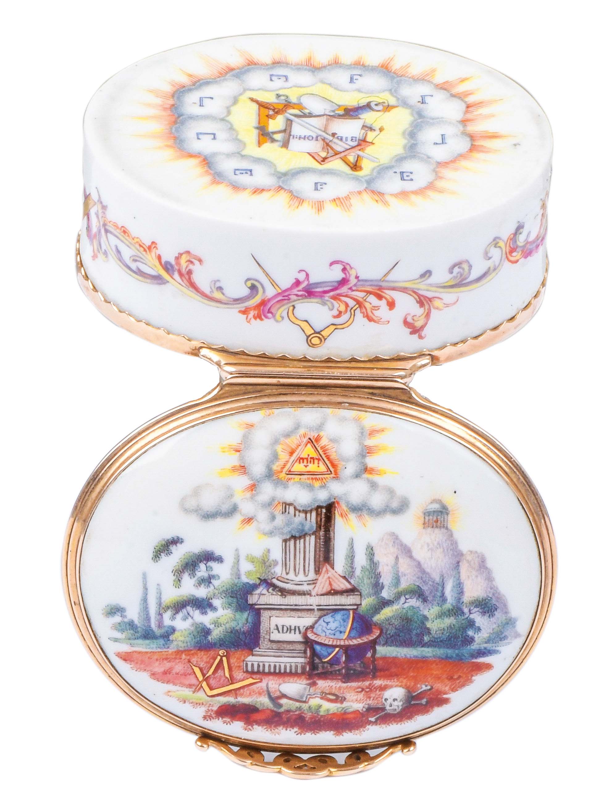 Meissen 1750-60 Oval, mit nach oben zu öffnendem Deckel, verbunden durch Goldmontur. Außenflächen bunt bemalt mit Freimaurersymbolden und Beschriftung. Innendeckel bunt bemalt mit Szene der Johannisloge: Mitglieder er drei Graden-Lehrling-Geselle-Meister arbeitenden Johannisloge. Am Boden mit der Darstellung und den Hinweis auf die Bibel mit der Offenbarung des Johannes. Porzellan, ohne Marke. Provenienz: Slg. C.W. Harris, Isle of Man. Vgl. B. Beaucamp-Markowsky, S. 136, Nr. 101 (id. Abb.). H=2,7 cm, B=5,8 cm, T=4,9 cm € 8.000,- - Katalog-Nr: 36Tabatière