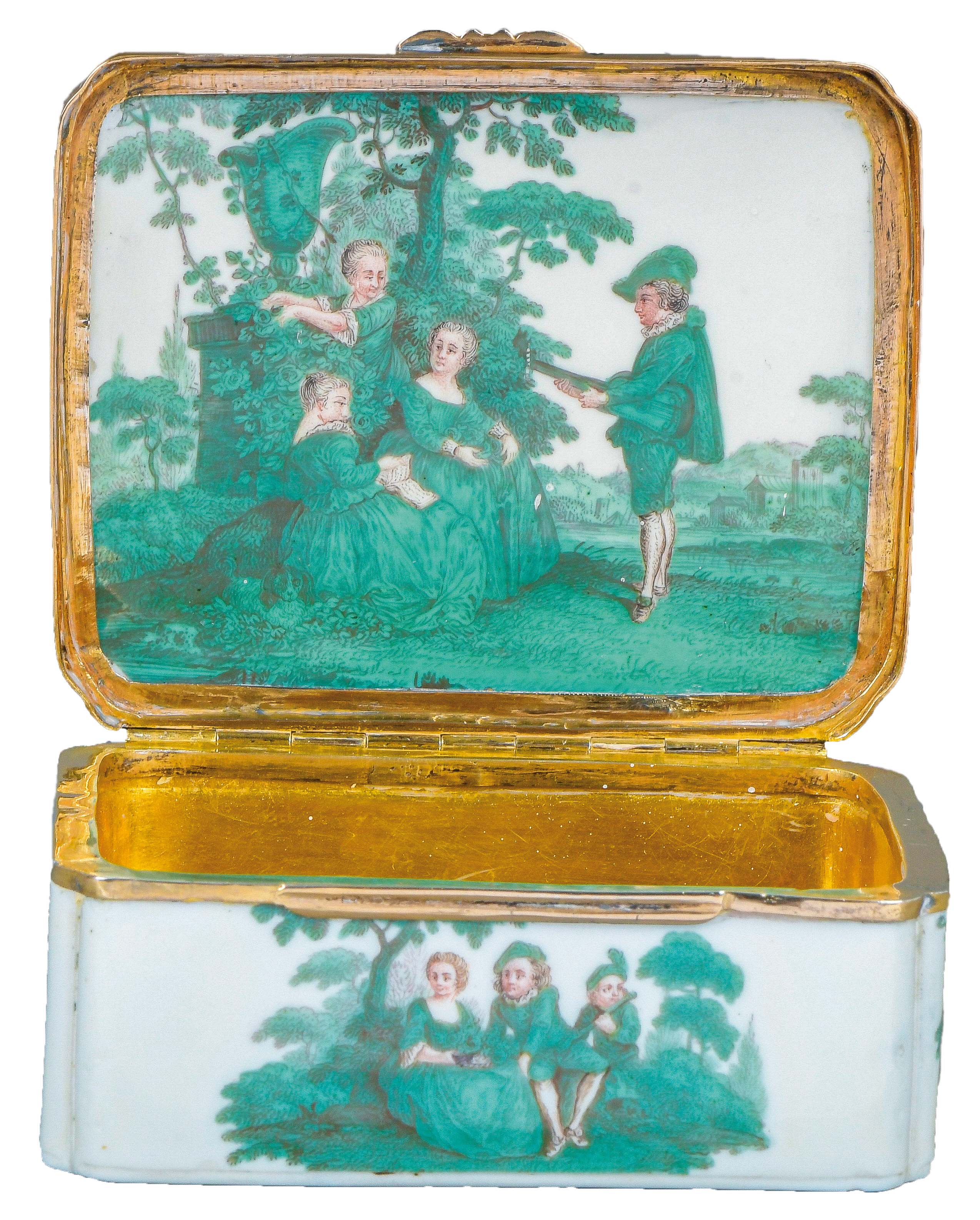 Meissen 1745-50 Rechteckig, mit nach oben zu öffnendem Deckel, verbunden durch vergoldete Montur. Außenflächen und Innendeckel kupfergrün bemalt mit Watteauszenen, Gesichter und Arme fleischfarben bemalt, Innenboden gold gehöht. Porzellan, ohne Marke. Vgl. Barbara Beaucamp-Markowsky, S. 128, Nr. 97 (für das Modell) und S. 94, Nr. 65 (für die Malerei). H=3,8 cm, B=8,7 cm, T=7,3 cm € 4.000,- - Katalog-Nr: 38Tabatière