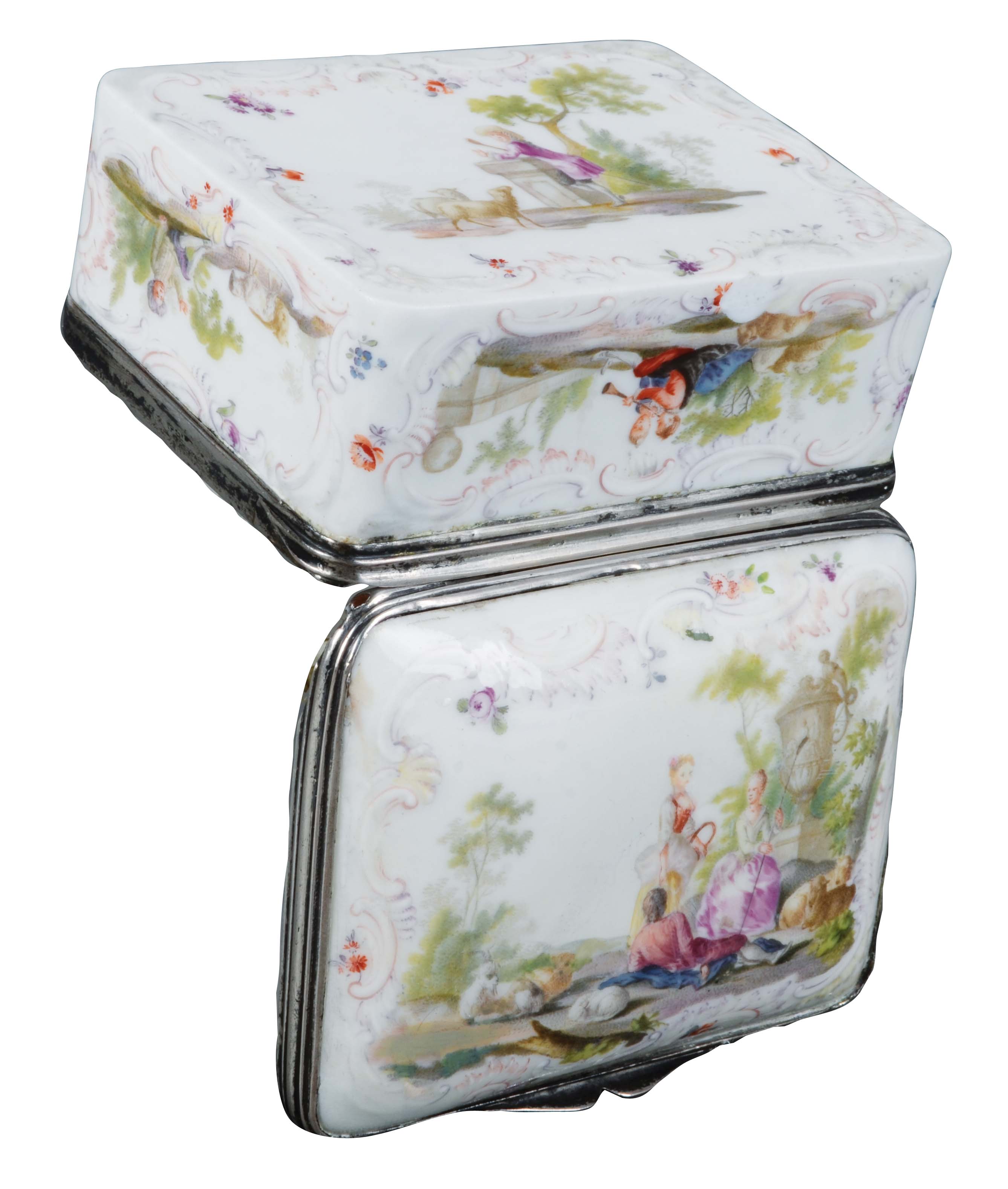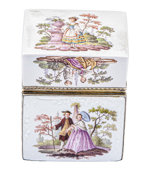 Meissen 1740 Rechteckig, mit nach oben zu öffnendem Deckel, verbunden durch Silbermontur. Außenflächen mit Rocaillekartuschen, zartrosa gesäumt. Reserven bunt bemalt mit Schäferszenen in Landschaft. Innendeckel mit aufwendigem Goldrahmen, floral gesäumt und teilweise radiert. Reserve bunt bemalt mit sitzender Dame beim Kaffeegenuss bzw. beim Kaltpusten des Kaffees in Unterschale. Porzellan, ohne Marke. Vgl. B. Beaucamp-Markowsky, S. 137, Nr. 102. H=4,4 cm, B=9 cm, T=7 cm € 3.000,- - Katalog-Nr: 40Tabatière