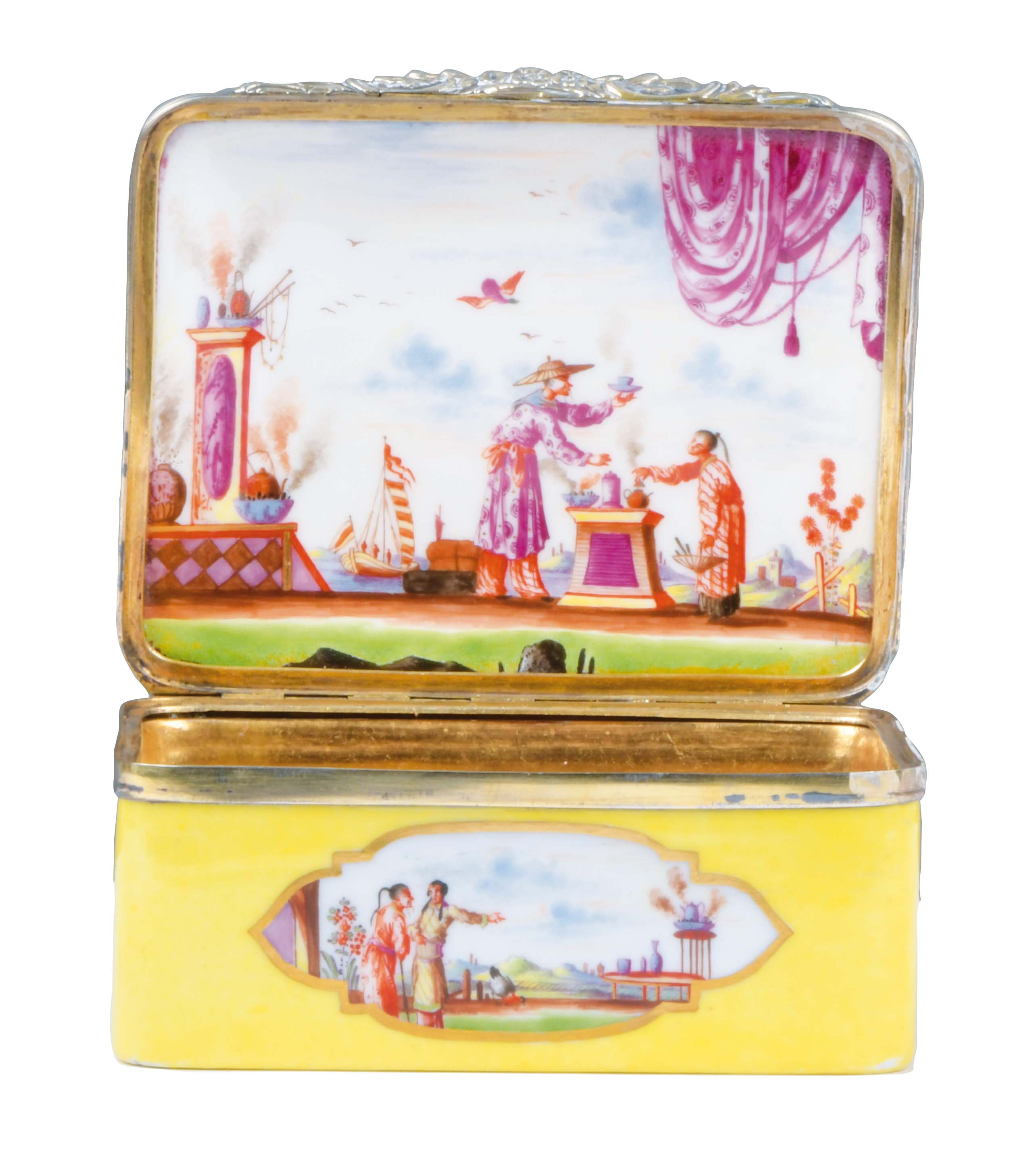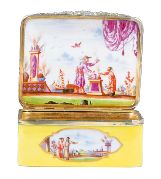 Meissen um 1735 Rechteckig, mit nach oben zu öffnendem Deckel, verbunden durch vergoldete Silbermontur. Außenflächen mit zitronengelbem Fond und mehrpassigen, gold gesäumten Aussparungen. Reserven und Innendeckel bunt bemalt mit Chinoiserien. Innenwandung und Boden des Unterteils gold gehöht. Porzellan, ohne Marke. Malerei von Johann Gregorius Hoeroldt. Vgl. Schulz-Codex, Taf. 84; Vgl. B. Beaucamp-Markowsky, S. 51, Nr. 22. H=4,4 cm, B=9,4 cm, T=7,8 cm € 8.000,- - Katalog-Nr: 43Tabatière