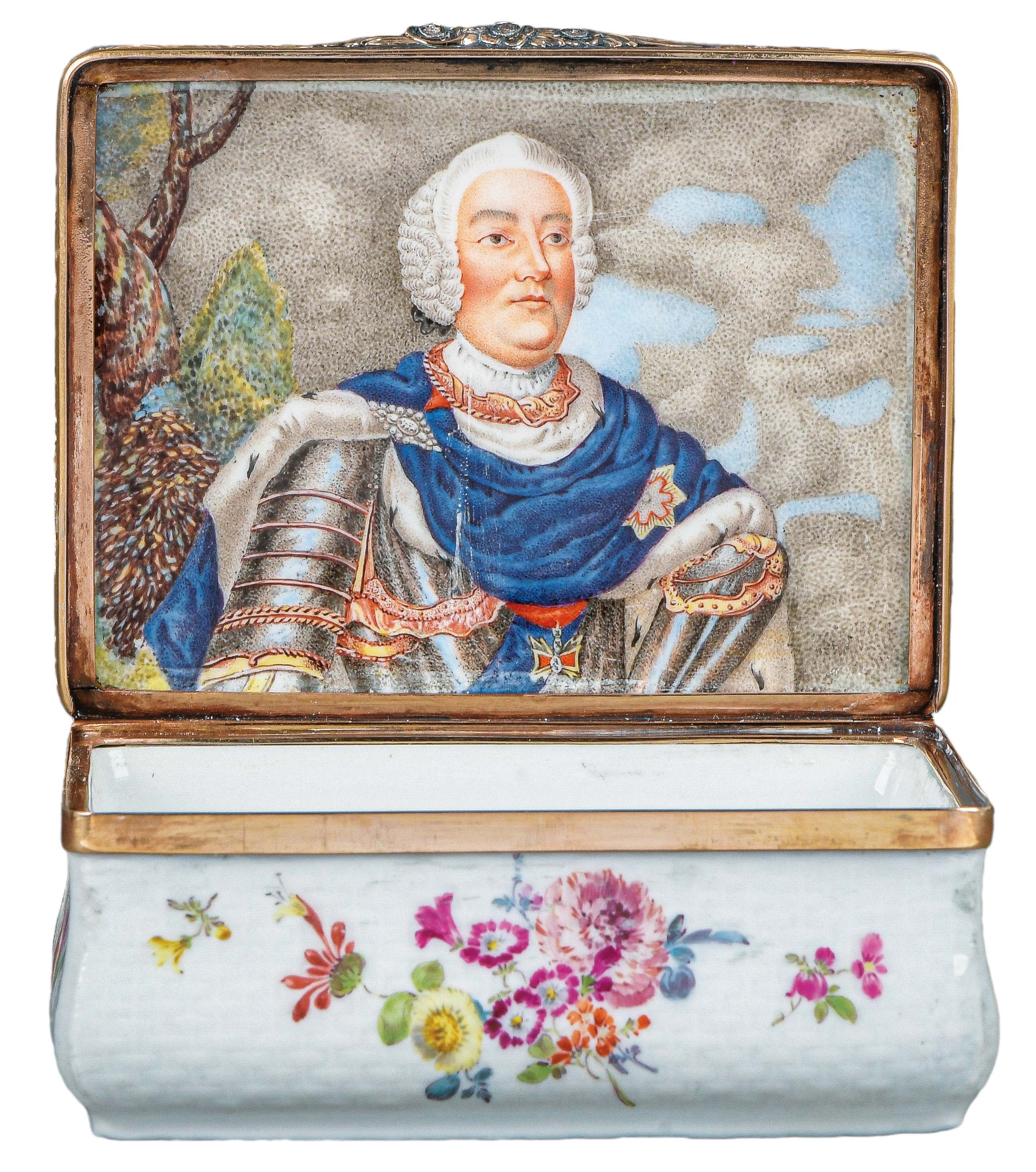 Meissen 1735 Rechteckig, mit nach oben zu öffnendem Deckel, verbunden durch Goldmontur, teilweise ziseliert. Außenflächen mit Korbflechtrelief und bunt bemalt mit Floraldekor. Innendeckel exzellent bunt bemalt mit dem Porträt August III. Porzellan, ohne Marke. Malerei von Johann Heinrich Heinrici. (feiner Haarriss im Deckel). H=3,5 cm, B=8,3 cm, T=6,6 cm € 6.000,- - Katalog-Nr: 45Tabatière