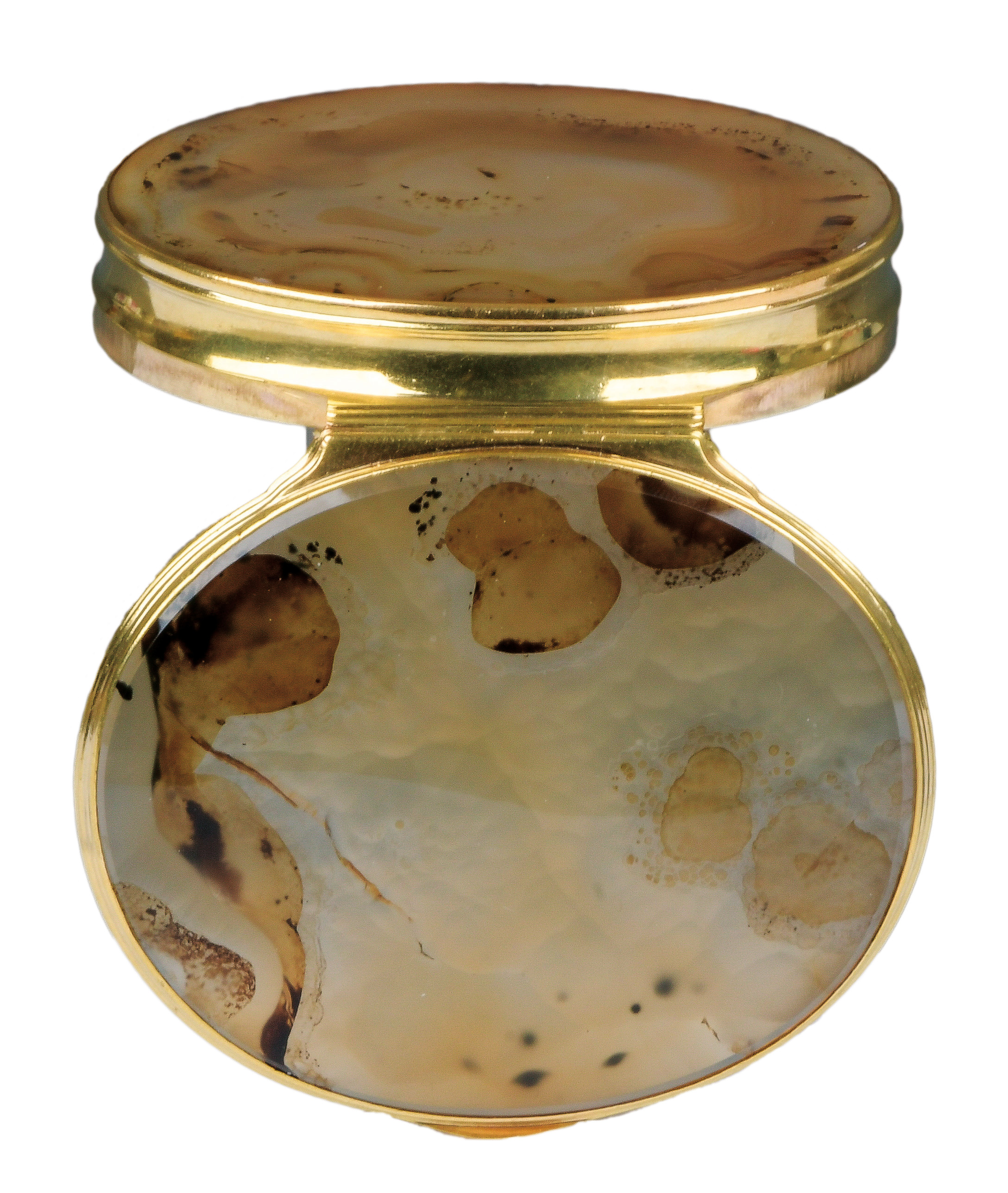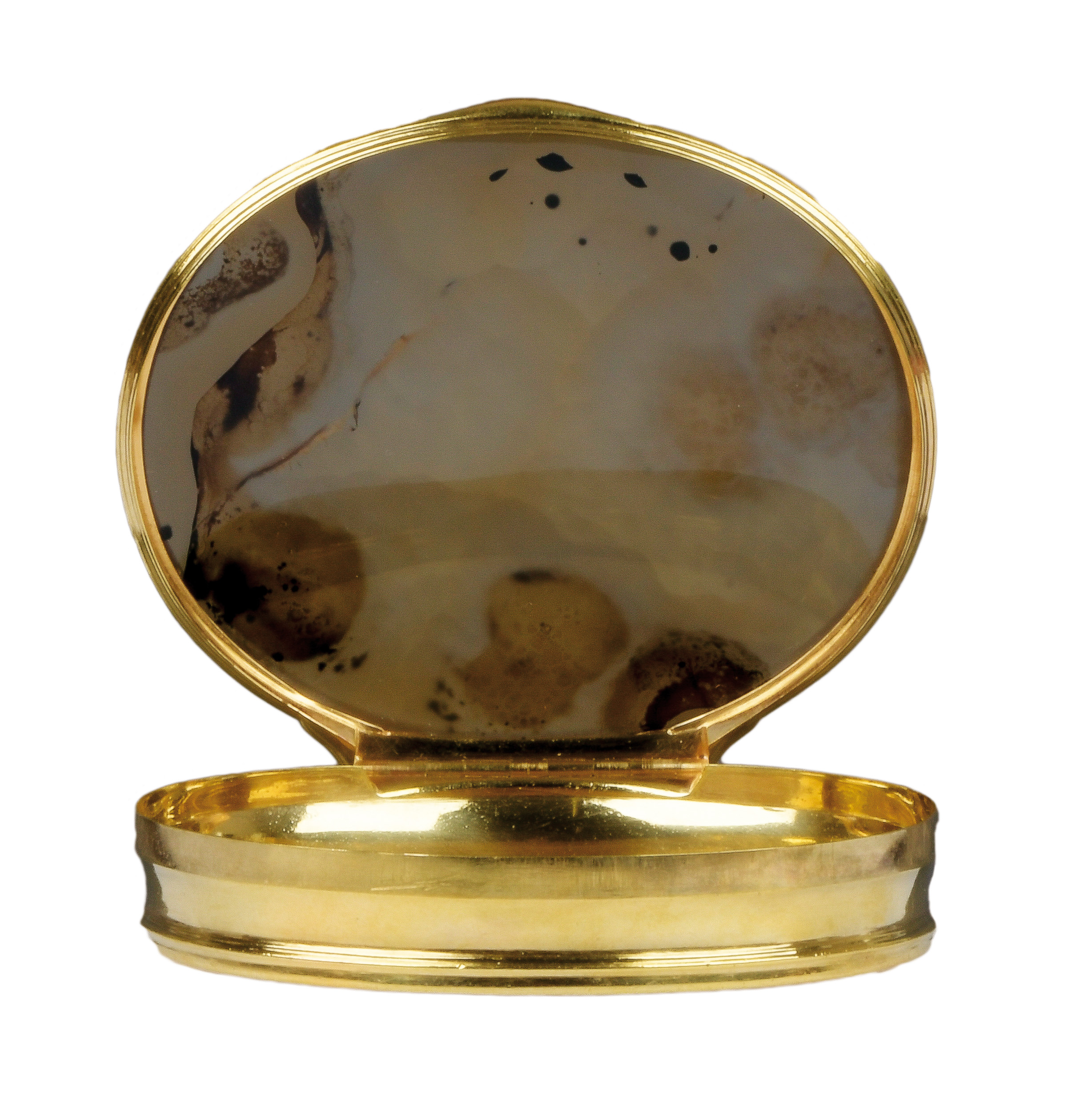 England 1730 Oval, mit nach oben zu öffnendem Deckel, verbunden durch Goldmontur. Deckel und Boden aus poliertem Achat. H=1,9 cm, B=7,8 cm, T=6,7 cm € 3.000,- - Katalog-Nr: 49Bedeutende Prunknähschatulle