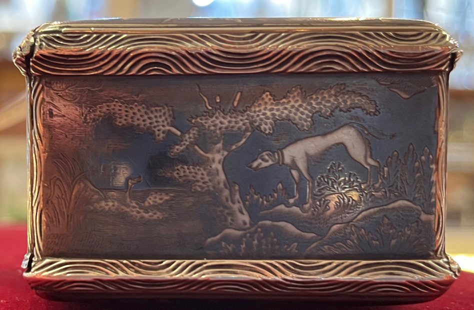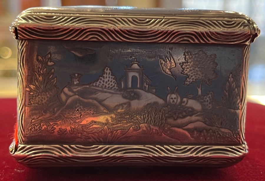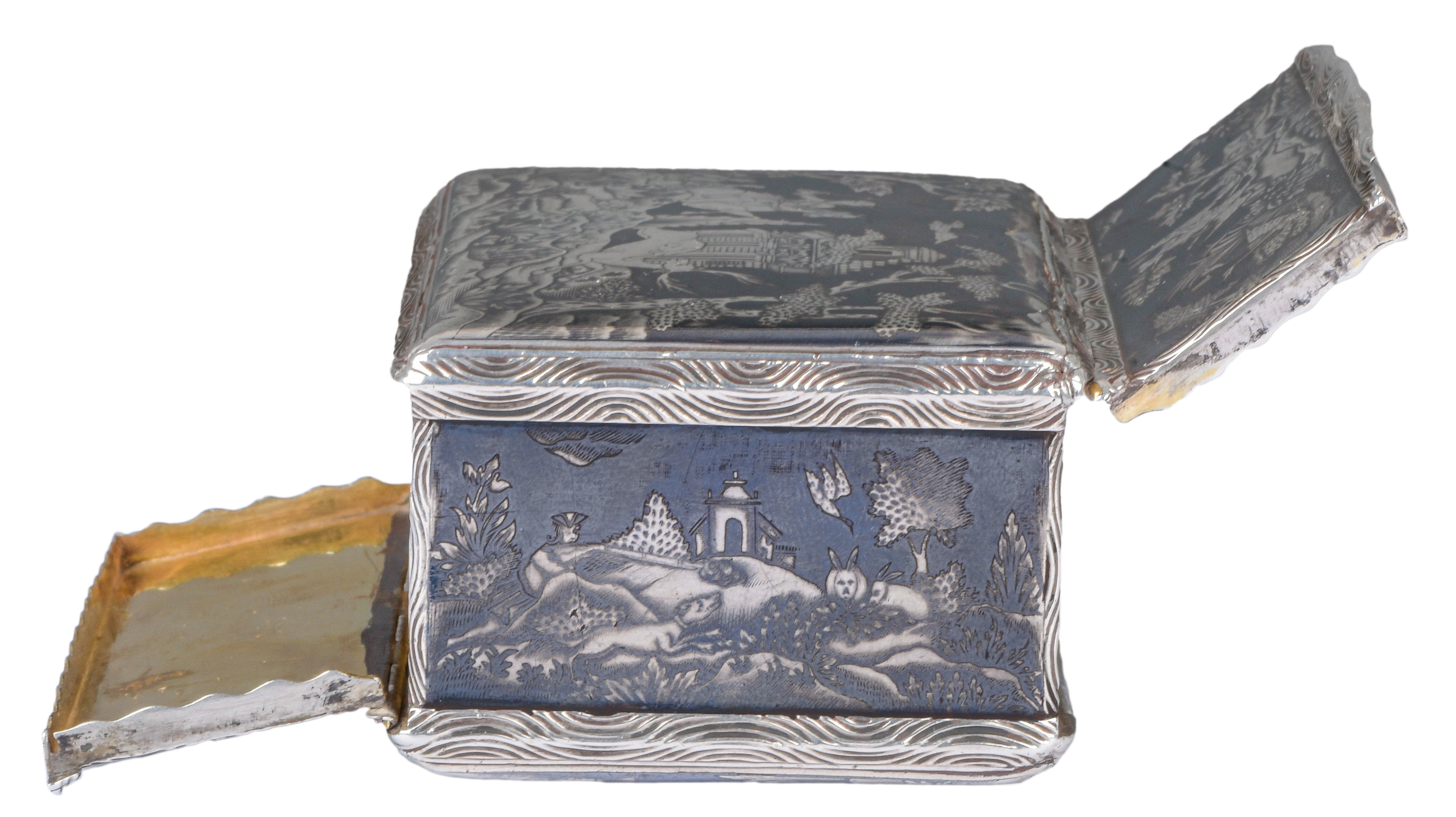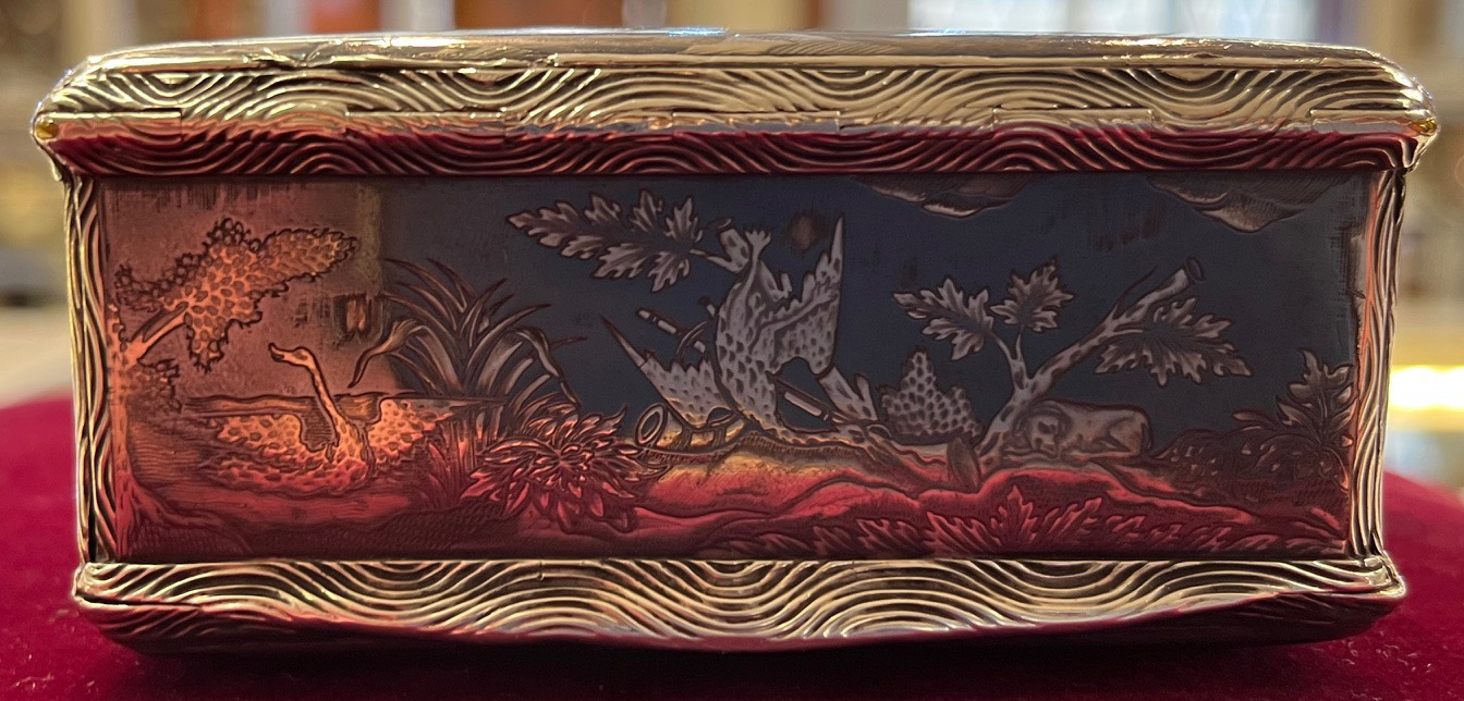 Wohl Augsburg um 1740 Rechteckig, mit aufklappbarer Vorder- und Rückseite. Silber, ca. 196 g, museal ziseliert und graviert mit Jagdszenen nach Johann Elias Riedinger in Niellotechnik; innen vergoldet und mit Trennwand versehen. H=4,4 cm, B=9 cm, T=6,4 cm € 5.000,-