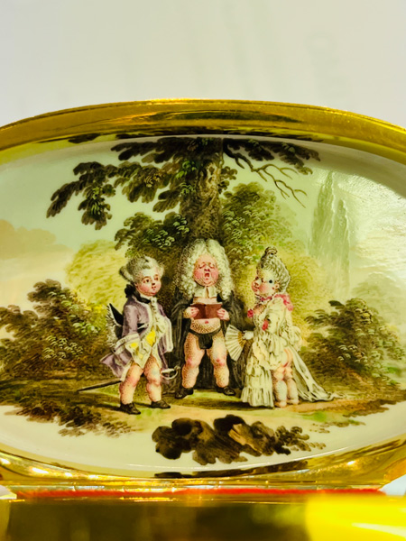 Berlin, Pierre Fromery um 1750 Oval, mit nach oben zu öffnendem Deckel, verbunden durch ziselierte und gravierte Goldmontur. Kupferkern, emailliert und farbig bemalt mit Kindern, als Erwachsene verkleidet, in Landschaft. Malerei von Daniel Chodowicki (1726-1801) nach Stichvorlagen von Aubert. H=3,9 cm, B=8,4 cm, T=4,9 cm € 3.000,- - Katalog-Nr: 30Tabatière