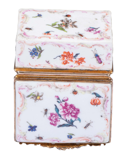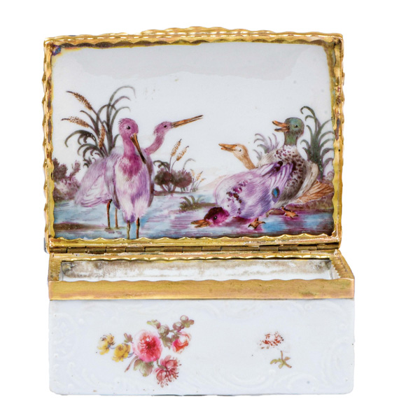Frankenthal 1770 Rechteckig, mit nach oben zu öffnendem Deckel, verbunden durch vergoldete Montur. Außenflächen rocaillereliefiert mit Reserven, diese bunt bemalt mit Floraldekor. Innendeckel bunt bemalt mit Wasservögeln. Porzellan, ohne Marke. Vgl. B. Beaucamp-Markowsky, S. 364, Nr. 297. H=3,3 cm, B=7 cm, T=5,5 cm € 3.600,- - Katalog-Nr: 41Tabatière