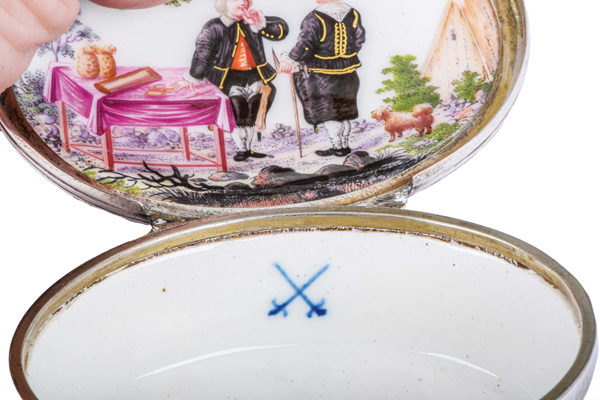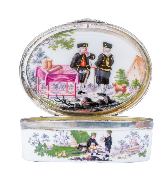Meissen 1740-45 Oval, mit nach oben zu öffnendem Deckel, verbunden durch Silbermontur. Außenflächen und Innendeckel bunt bemalt mit Bergmannszenen in Landschaft. Porzellan, an der Innenwandung unterglasurblaue Schwertermarke. Malerei von Bonaventura Gottlieb Häuer. Provenienz: Christie's, London 1978; davor Slg. E. Pinkus, New York Mai 1966. Vgl. R. Slotta / G. Lehmann / U. Pietsch, „Ein fein bergmanning Porcelan“, Essen 1999, S. 338 (id. Abb.). H=3,6 cm, B=8 cm, T=6,4 cm € 6.000,- - Katalog-Nr: 37Tabatière