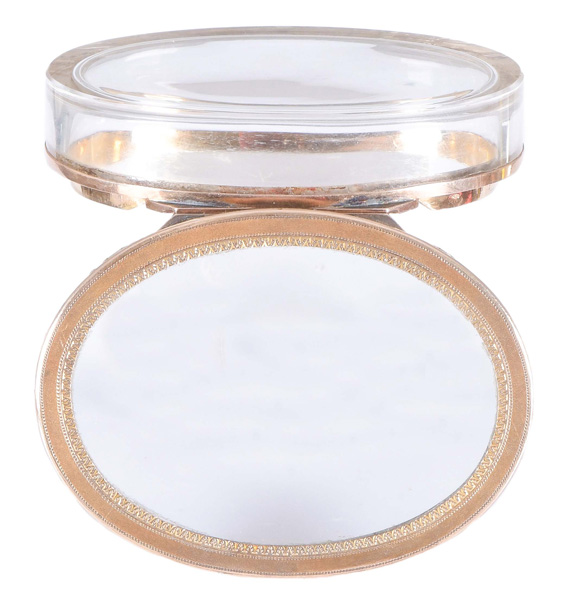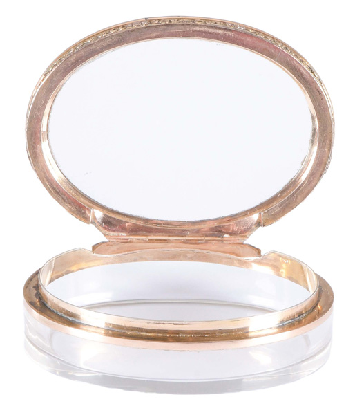 Paris um 1780-1800 Oval, mit nach oben zu öffnendem Deckel, verbunden durch Goldmontur. Transparentes Glas, teilweise geschliffen. Provenienz: Christie's, 29. Nov. 1982. H=2 cm, B=7,2 cm, T=5,4 cm € 1.400,- - Katalog-Nr: 48Tabatière