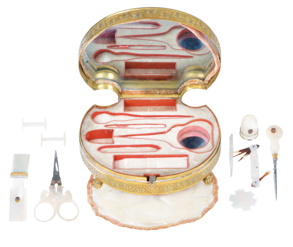 Wien 1820 Ovaler vergoldeter Messingkorpus auf Prankenfüßen. Wandung umlaufend mit Palmettblattrelief und teilw. ziseliert. Der nach oben zu öffnende Deckel mit eingefasster, polierter und gravierter Muschel an der Außenseite und Spiegel an der Innenseite. Das Innenleben mit originaler Einteilung und Zubehör, bestehend aus: Eine Schere (8,6 x 4,3 cm), ein Spitzbohrer (L=9 cm), ein Einfädler (L=5,2 cm), ein Paar Garnrollen (H=2,3 cm, D=1,4 cm), eine Garnspule (D=2,2 cm), ein Fingerhut (H=2,3 cm), eine Nadelbüchse (H=6,4 cm, B=1,6 cm), drei Zahnstocher und ein Ohrlöffel. Alle Teile aus poliertem Perlmutt mit Goldmanschette und Medaillon. Mit Original-Schutzkissen. H=4,8 cm, B=12,8 cm, T=10,3 cm € 1.400,- - Katalog-Nr: 50Jagdtabatière