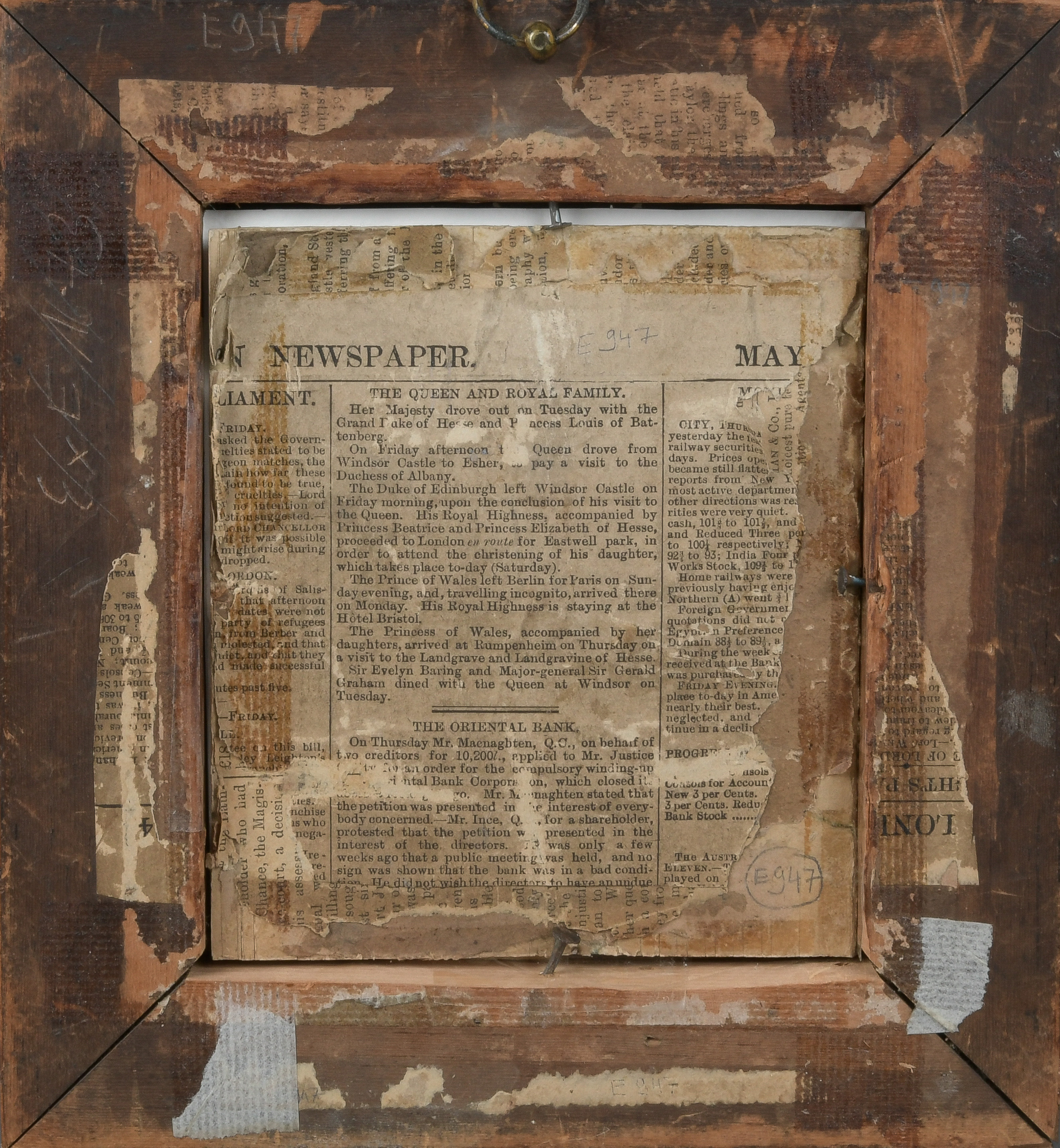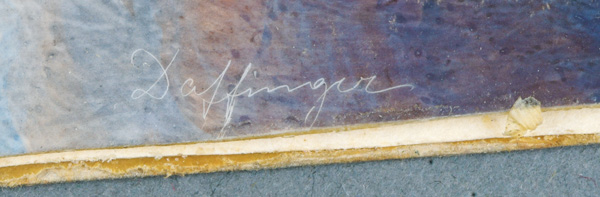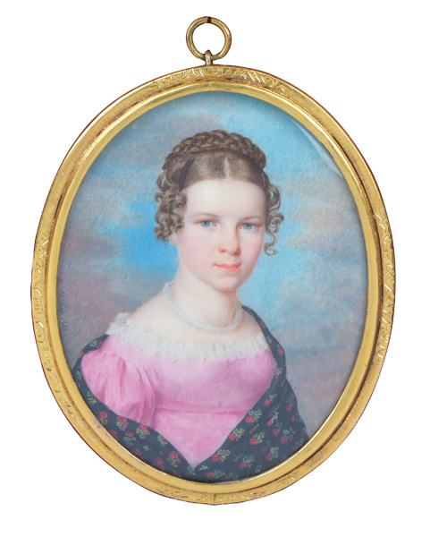 Porträt der Tochter des Künstlers. Bunt gemalt in Puderfarben und aquarelliert auf Elfenbeinplatte, hi./Gl. in breitem Holzrahmen mit Goldleisten. Provenienz: Christie's, London 13. Dez. 1983. Elfenbein-Gutachten und EU-Verkaufsgenehmigung liegen vor und können für EUR 150,00 erworben werden.