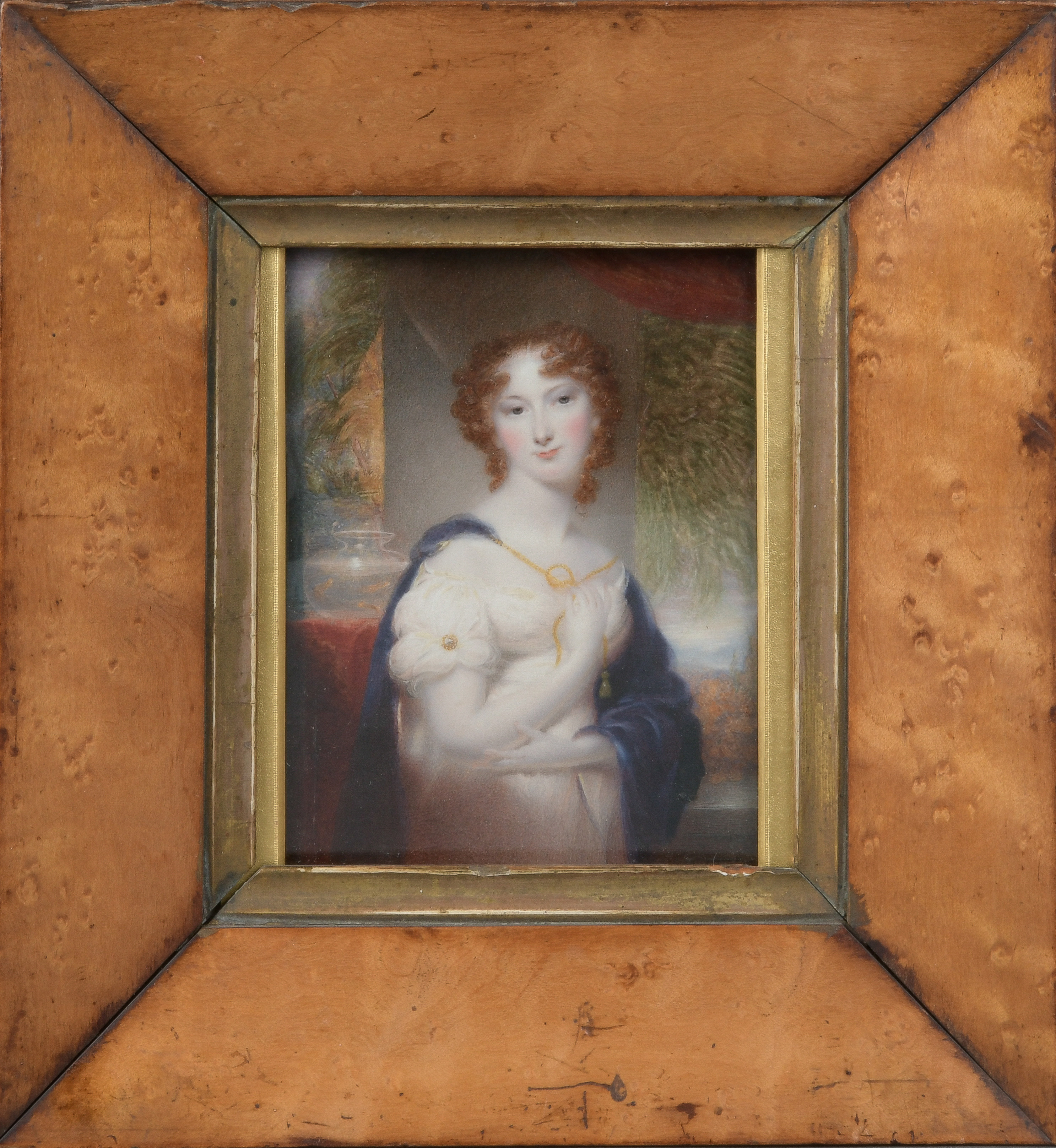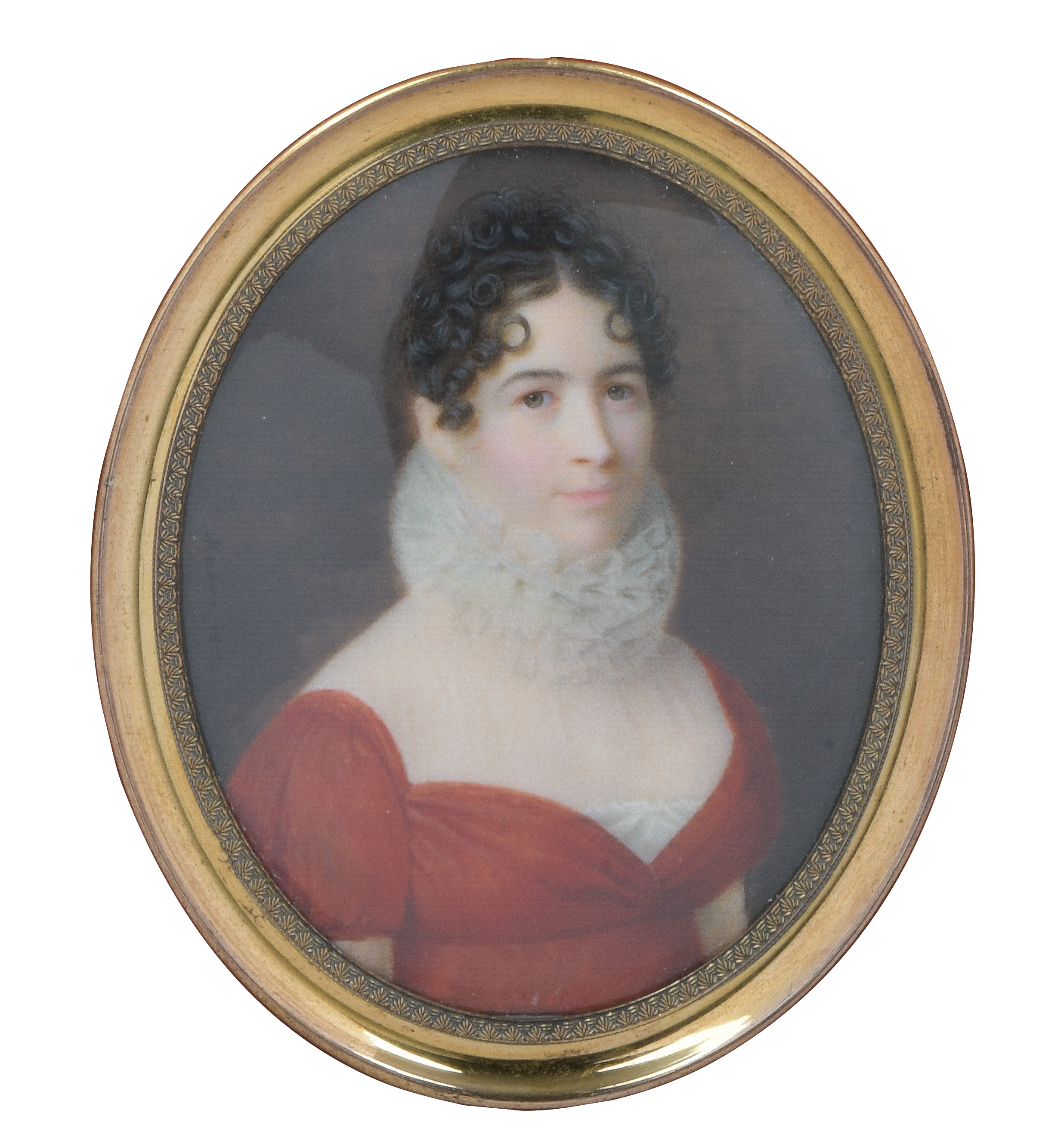 Porträt einer Dame. Bunt gemalt in Puderfarben und aquarelliert auf Elfenbeinplatte, li./mittig/sign./dat. 1813, hi./Gl. in schön profiliertem, ziseliertem, goldfarbenem Rahmen. Provenienz: Christie's, London 7. Okt. 1980. Elfenbein-Gutachten und EU-Verkaufsgenehmigung liegen vor und können für EUR 150,00 erworben werden.