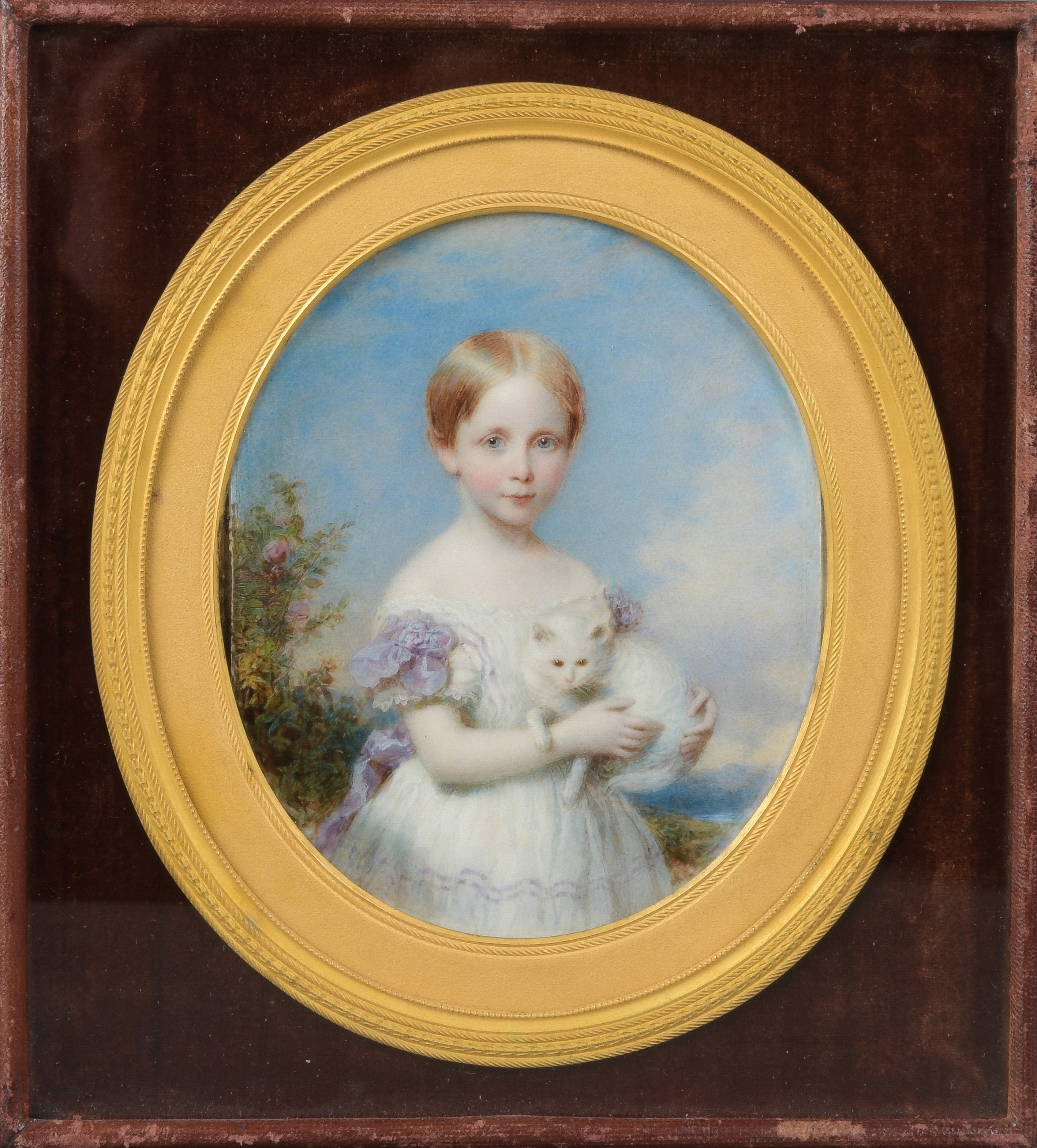 Porträt eines Mädchens mit weißer Katze. Bunt gemalt in Puderfarben und aquarelliert auf Elfenbeinplatte, hi./Gl. in breitem, aufwendig geformtem, feuervergoldetem Bronzerahmen. Provenienz: Christie's, London 14. Okt. 1992. Elfenbein-Gutachten und EU-Verkaufsgenehmigung liegen vor und können für EUR 150,00 erworben werden.