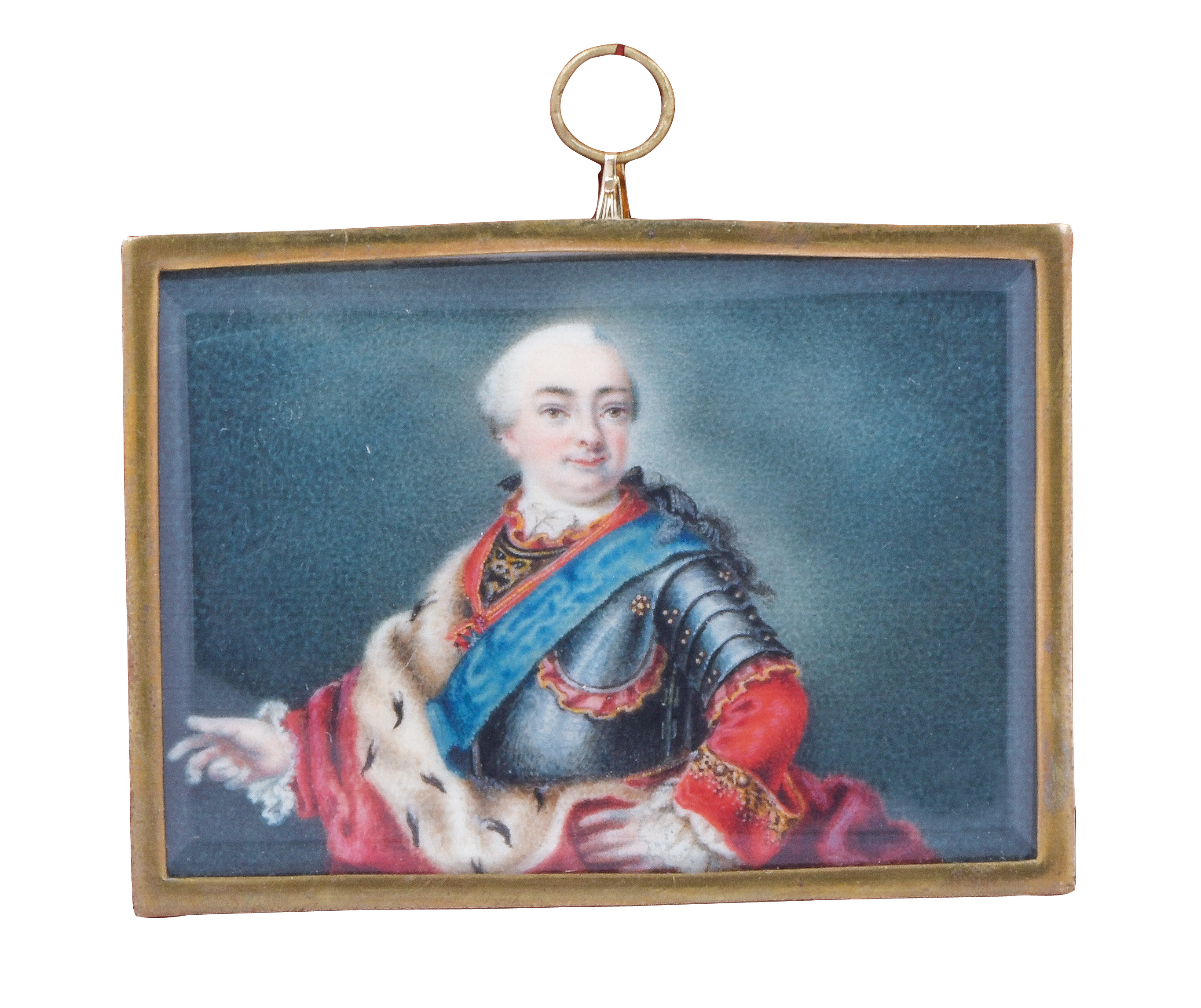 Porträt von Johann Friedrich Fürst von Schwarzburg-Rudolstadt (1721-1767). Bunt gemalt in Puderfarben und aquarelliert auf Elfenbeinplatte, hi./Gl. in schlichtem, poliertem Messingrahmen. Provenienz: Sotheby' s, London 15. Nov. 1982. Elfenbein-Gutachten und EU-Verkaufsgenehmigung liegen vor und können für EUR 150,00 erworben werden.