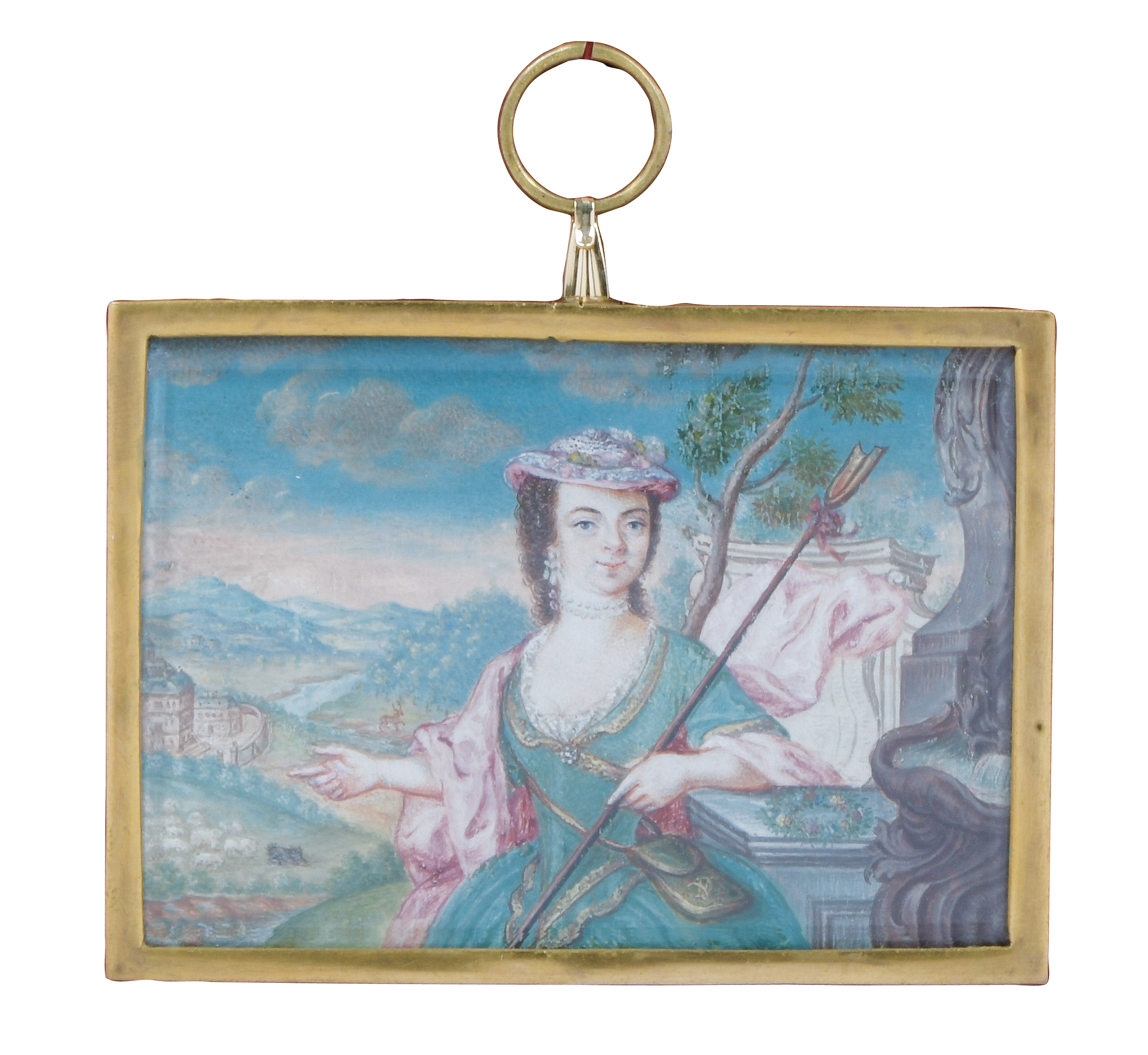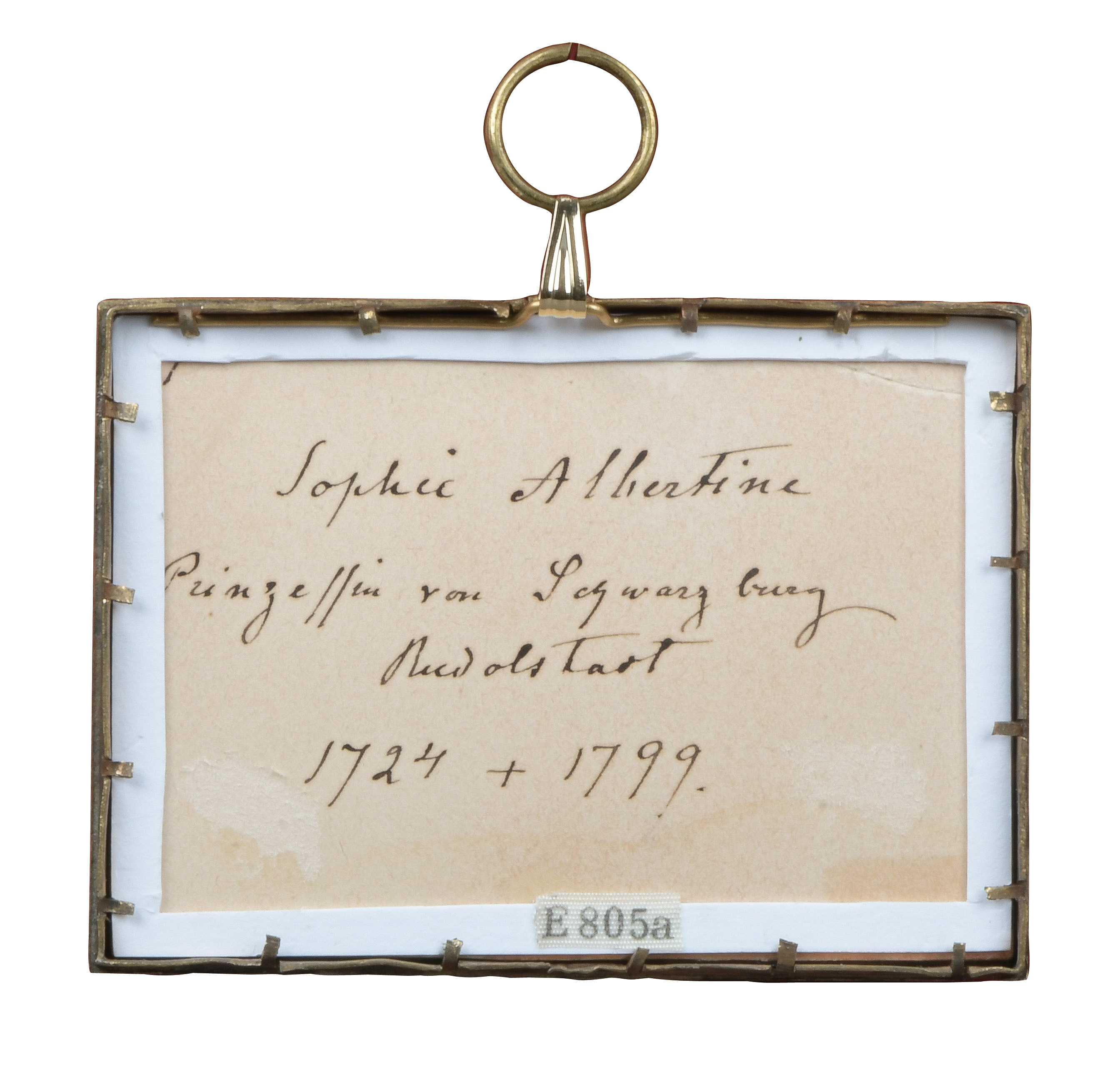 Porträt der Prinzessin Sophie Albertina von Schwarzburg-Rudolstadt (1724-1799). Bunt gemalt in Puderfarben und aquarelliert auf Pergament, hi./Gl. in schichtem, poliertem Messingrahmen. Provenienz: Sotheby's, London 15. Nov. 1982.