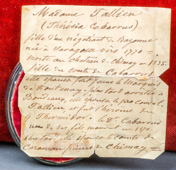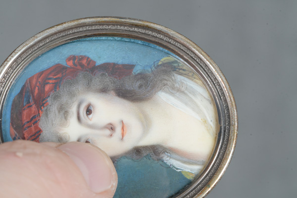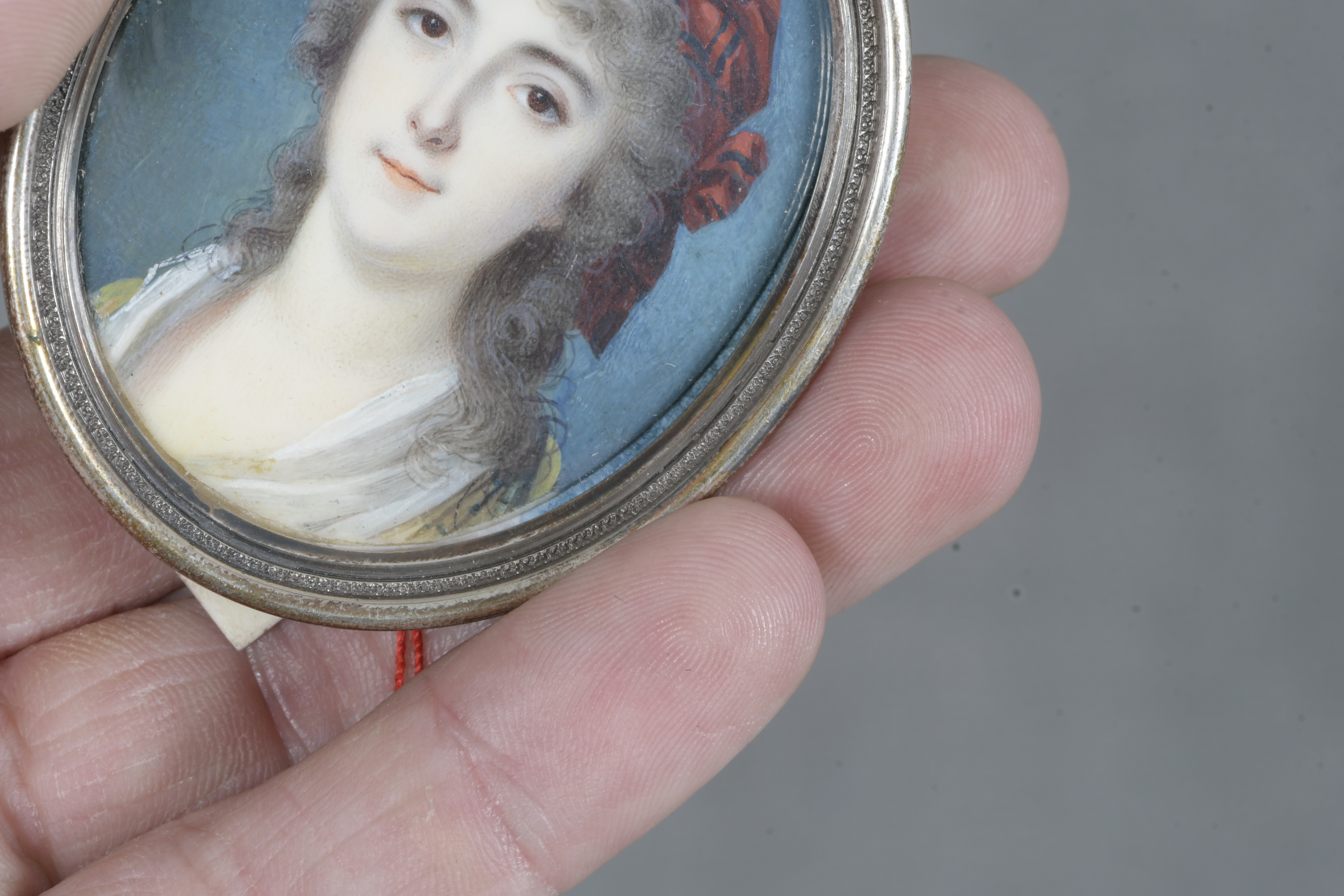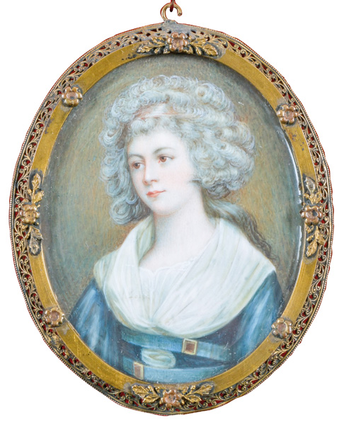Porträt der Madame Tallien (1773-1835). Bunt gemalt in Puderfarben und aquarelliert auf Elfenbeinplatte, re./mittig/sign., hi./Gl. in aufwendig profiliertem Silberrahmen, verso zusammengefaltetes Schreiben. Provenienz: Slg. Ernst Holzscheiter, Meilen; Sotheby's, London 28. März 1977; Christie's, London 6. Juli 2005 für GBP 8.000,00. Ausstellung: Napoleonmuseum, „Miniaturen und Karikaturen“, Arenenberg 1954, Kat.-Nr. 34 (Leihgabe von E. Holzscheiter, Meilen). Vgl. H. Rieben, „Portraits en miniature“, Bern 1952, Abb. Tafel 10. Elfenbein-Gutachten und EU-Verkaufsgenehmigung liegen vor und können für EUR 150,00 erworben werden.