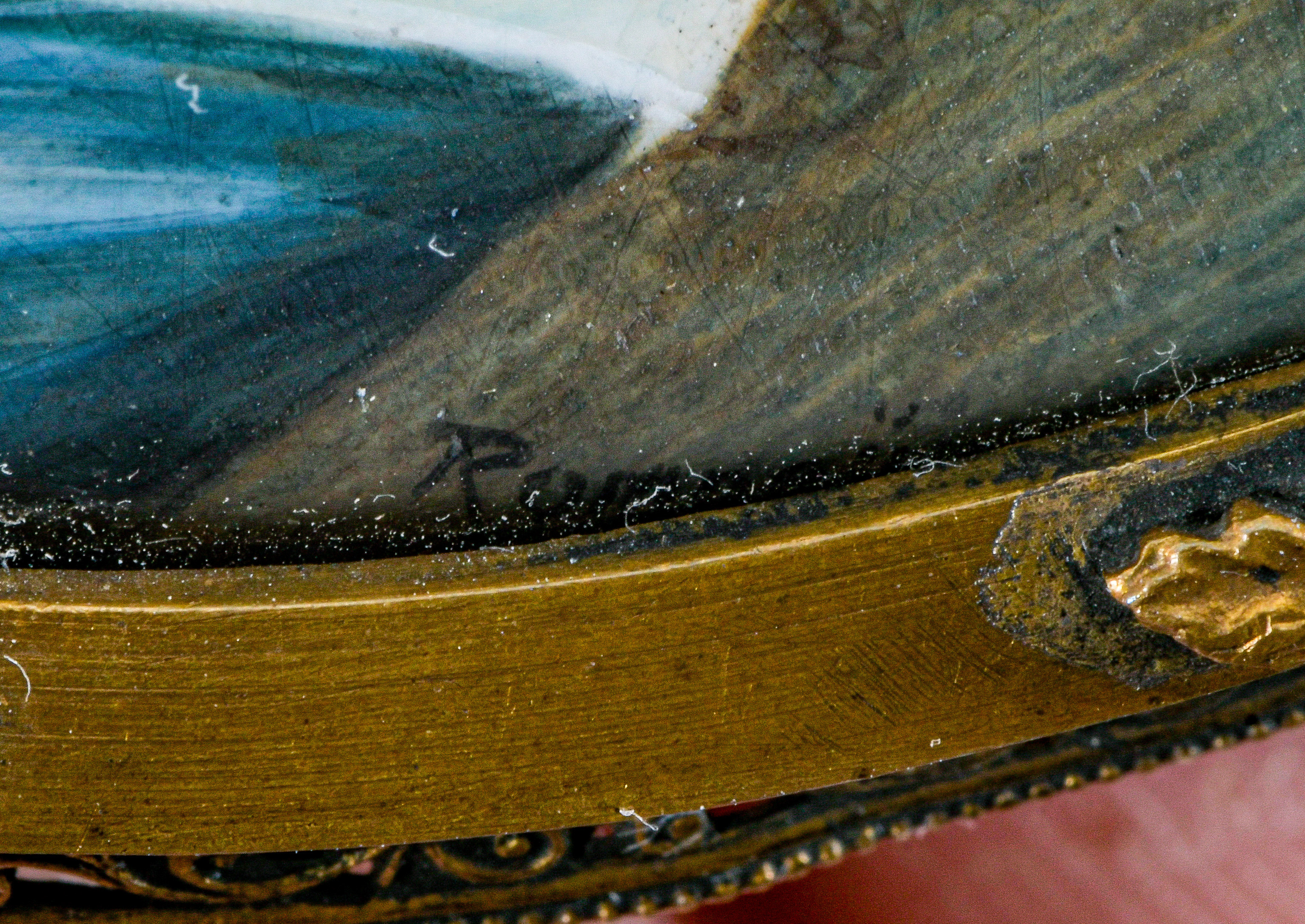 Porträt eines Herren. Bunt gemalt in Puderfarben und aquarelliert auf Elfenbeinplatte, re./u./sign., in oktogonalem Goldrahmen, hi./Gl. gerahmt in runder Schildpattdose eingelassen. Provenienz: Sotheby's, London 1. Mai 1980. Elfenbein-Gutachten und EU-Verkaufsgenehmigung liegen vor und können für EUR 150,00 erworben werden.
