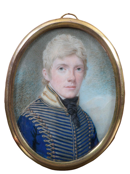 Porträt von William Howe de Lancey (1778-1815), Kornett in den 17. leichten Dragonern und Adjutant von Wellington, 1807. Bunt gemalt in Puderfarben und aquarelliert auf Elfenbeinplatte, hi./Gl. gerahmt. Provenienz: Sotheby's, London 11. Maí 1984. Elfenbein-Gutachten und EU-Verkaufsgenehmigung liegen vor und können für EUR 150,00 erworben werden.