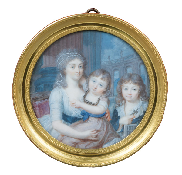 Porträt einer Mutter mit zwei Kindern vor architektonischer Kulisse. Bunt gemalt in Puderfarben und aquarelliert auf Elfenbeinplatte, li./mittig/sign., hi./Gl. in aufwendig ziseliertem, graviertem und feuervergoldetem Bronzerahmen. Provenienz: Slg. Paul Davidsohn, Berlin-Grunewald; Max Perl, Berlin 1924; Christie' s, London 3. Juni 2014, für GBP 17.000,00. Vgl. Leo R. Schidlof, „The Miniature in Europe“, Graz 1964, Bd. I, S. 216. Elfenbein-Gutachten und EU-Verkaufsgenehmigung liegen vor und können für EUR 150,00 erworben werden.