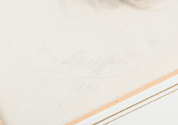 Porträt einer Dame in Trauerkleidung. Bleistift bunt aquarelliert auf Papier, li./u./sign./dat. 1842, mit Passepartout hi./Gl. in schmalem Rahmen. Provenienz: Antiquitäten Karl-Friedrich Schulz, Mannheim 1981.