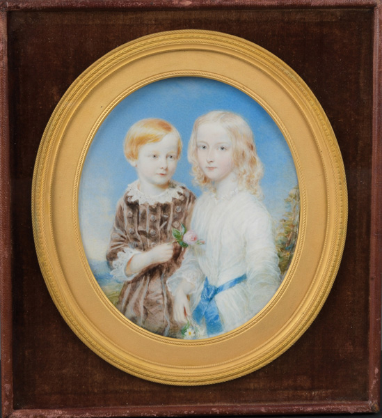Porträt eines Mädchens und Jungen. Bunt gemalt in Puderfarben und aquarelliert auf Elfenbeinplatte, hi./Gl. in breitem, aufwendig geformtem, feuervergoldetem Bronzerahmen. Provenienz: Christie's, London 14. Okt. 1992. Elfenbein-Gutachten und EU-Verkaufsgenehmigung liegen vor und können für EUR 150,00 erworben werden.
