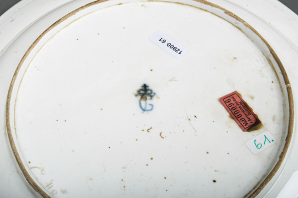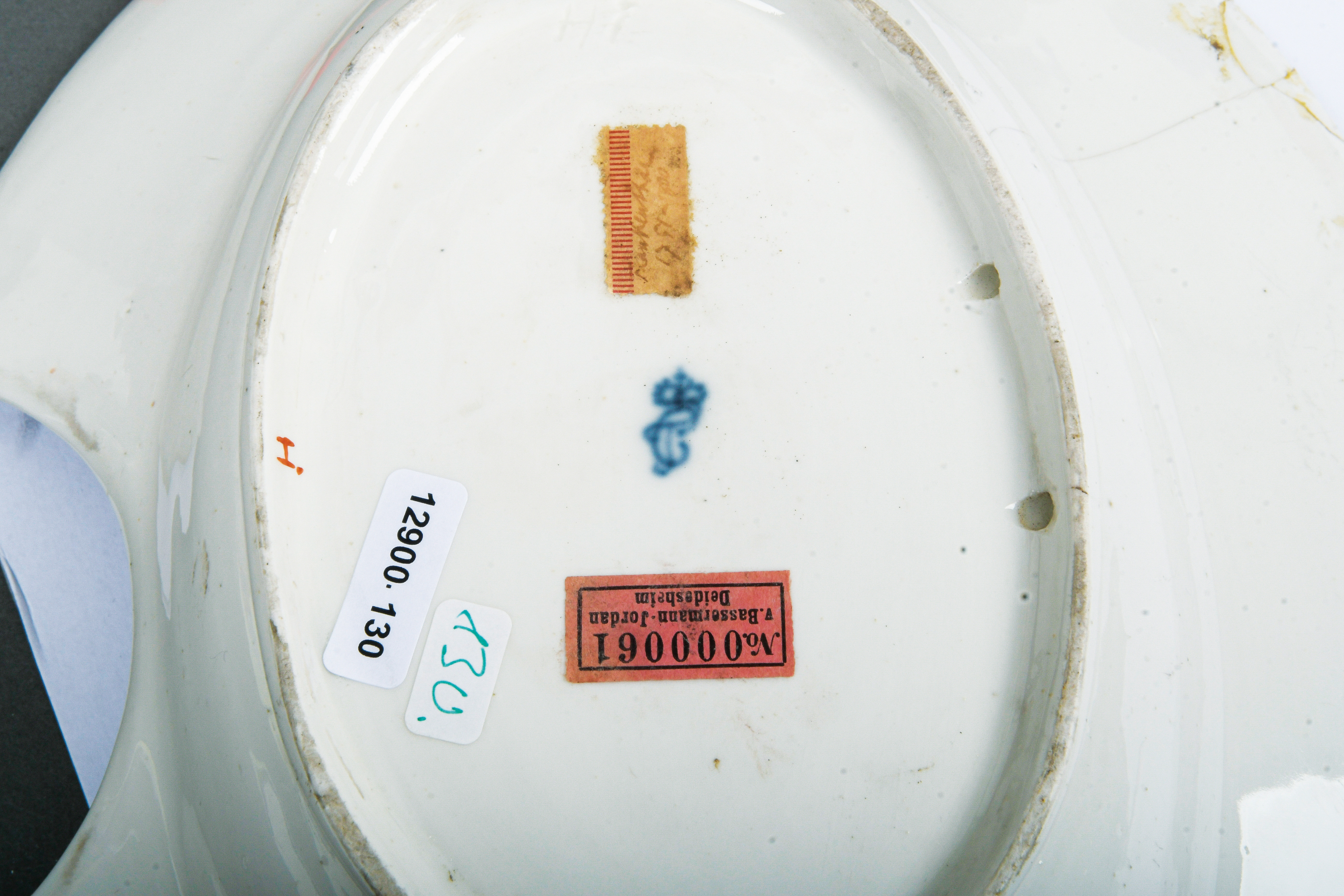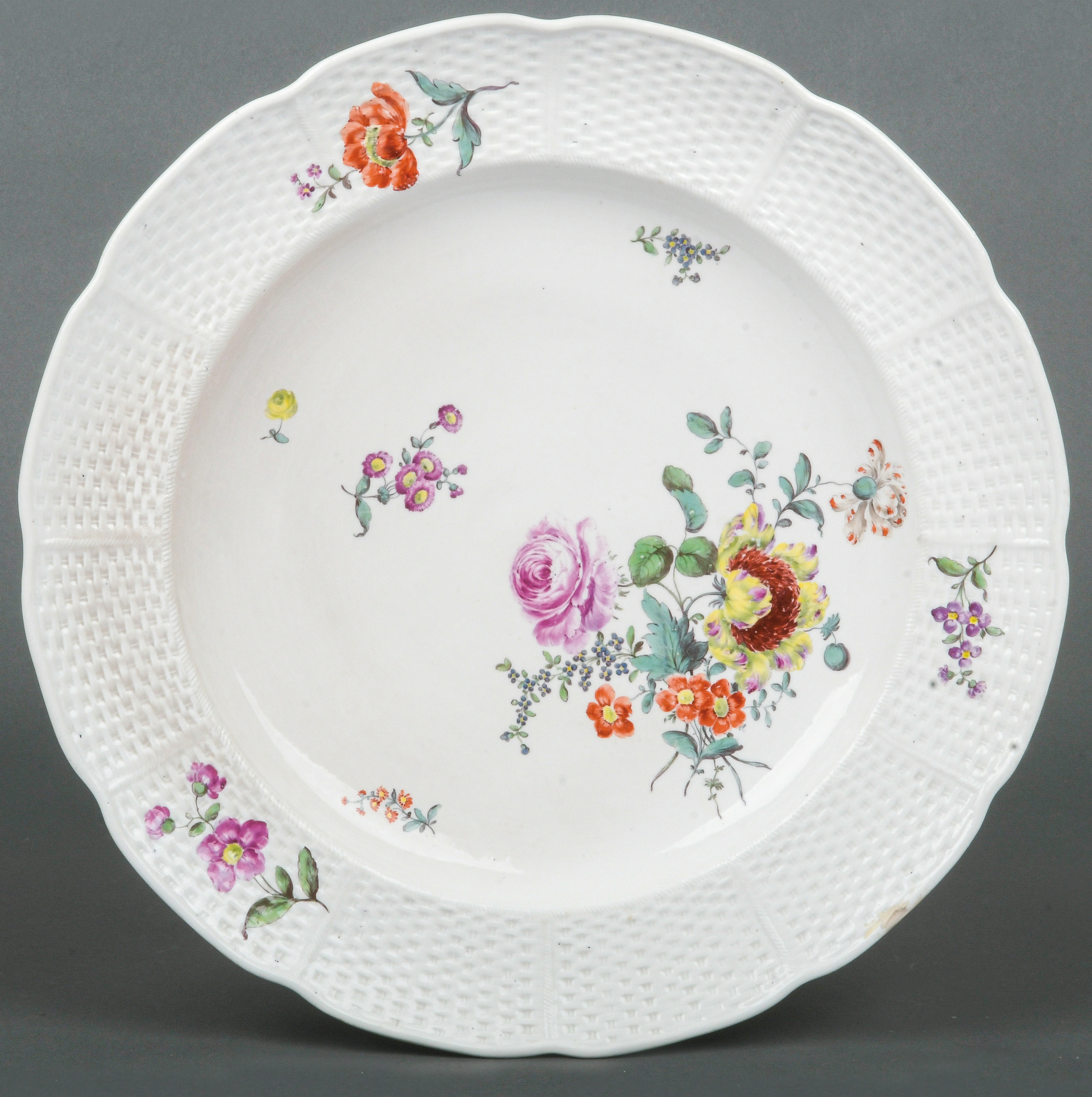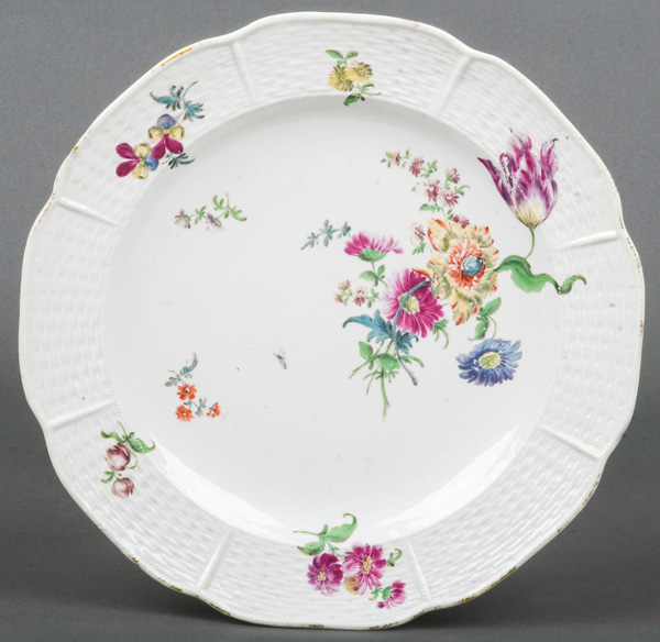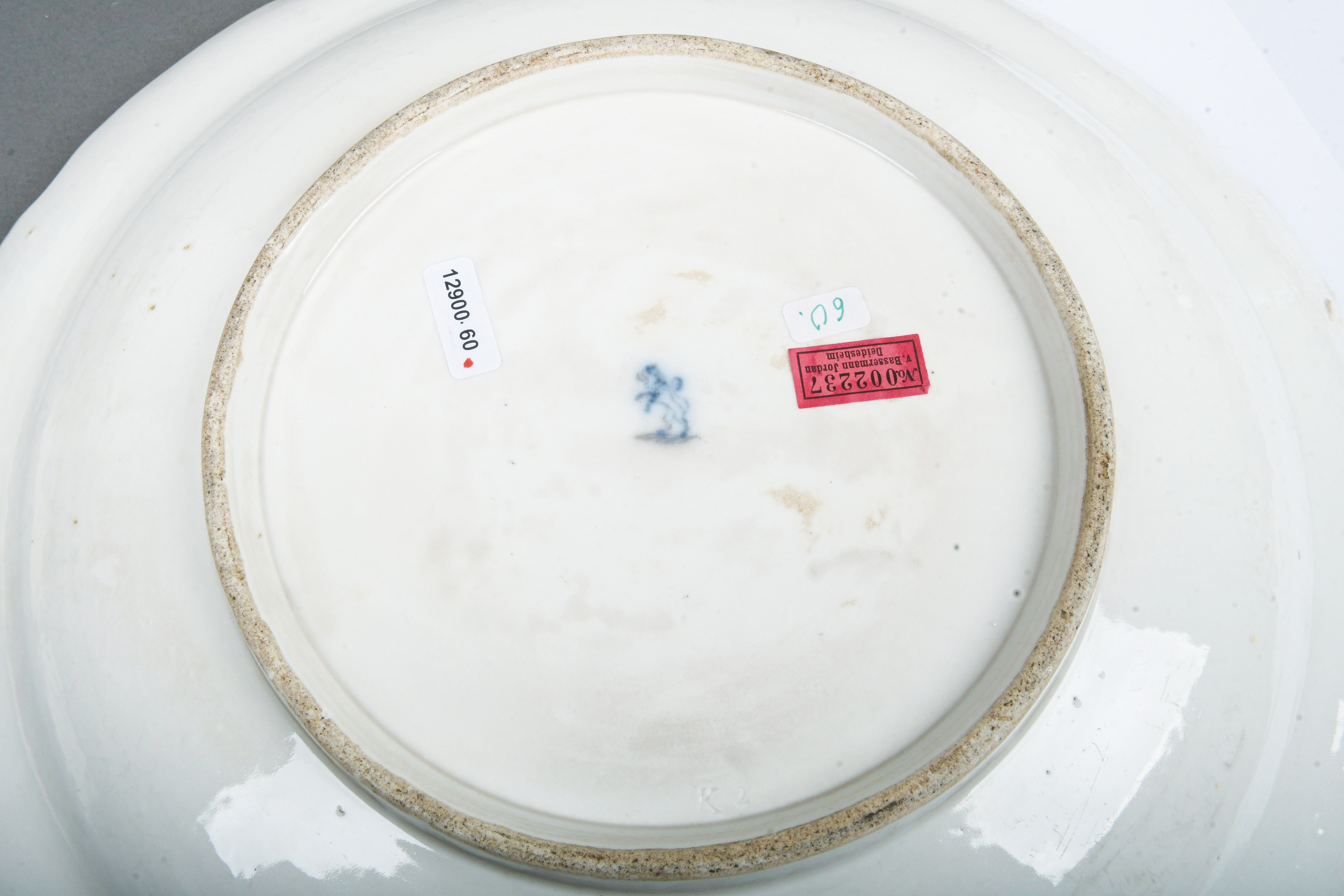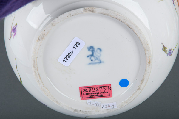 | Rund gemuldet, mit steigender Korbflechtrelieffahne, Spiegel bunt bemalt mit Floraldekor. Porzellan, verso unterglasurblaue steigende Löwenmarke. Vgl. B. Beaucamp-Markowsky, S. 39ff, Nr. 5.
