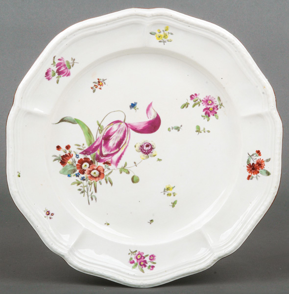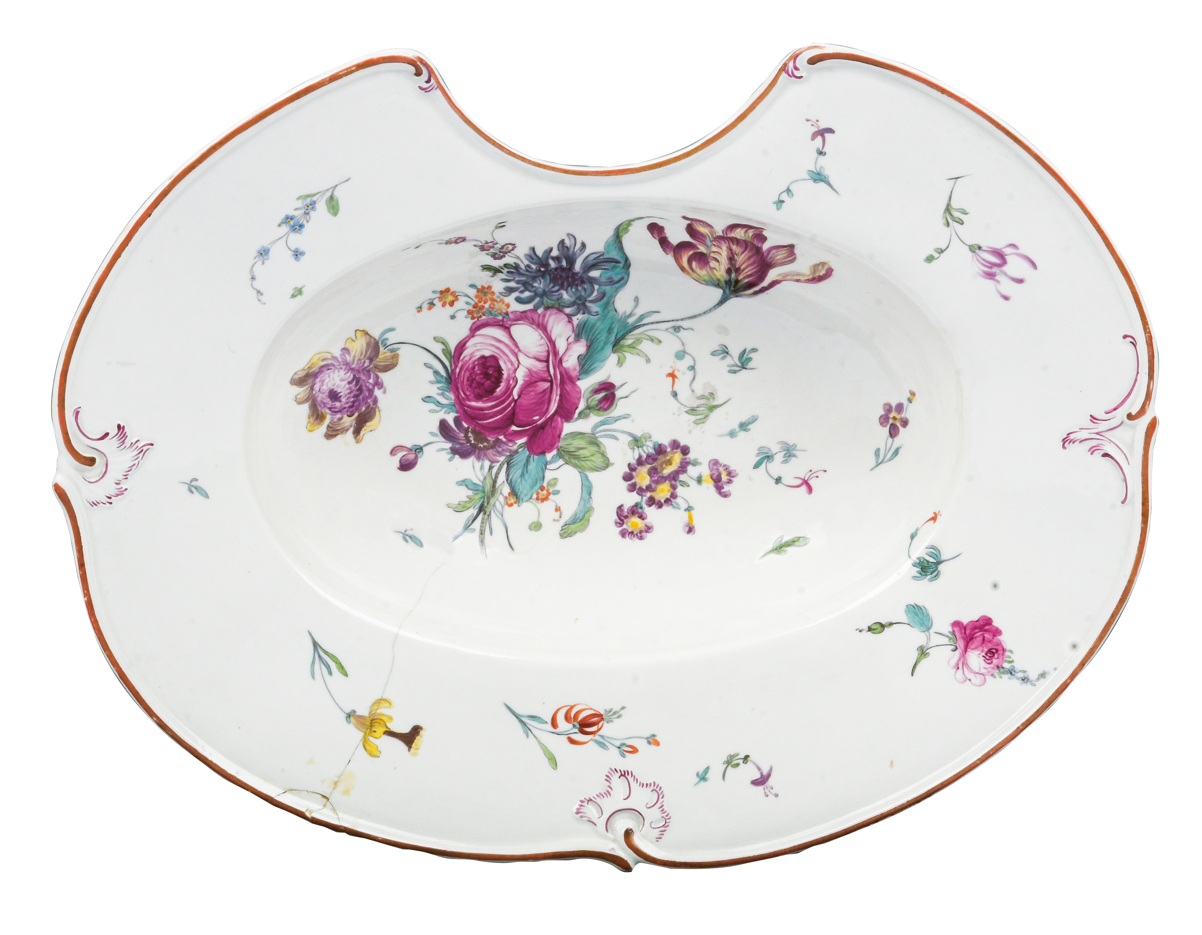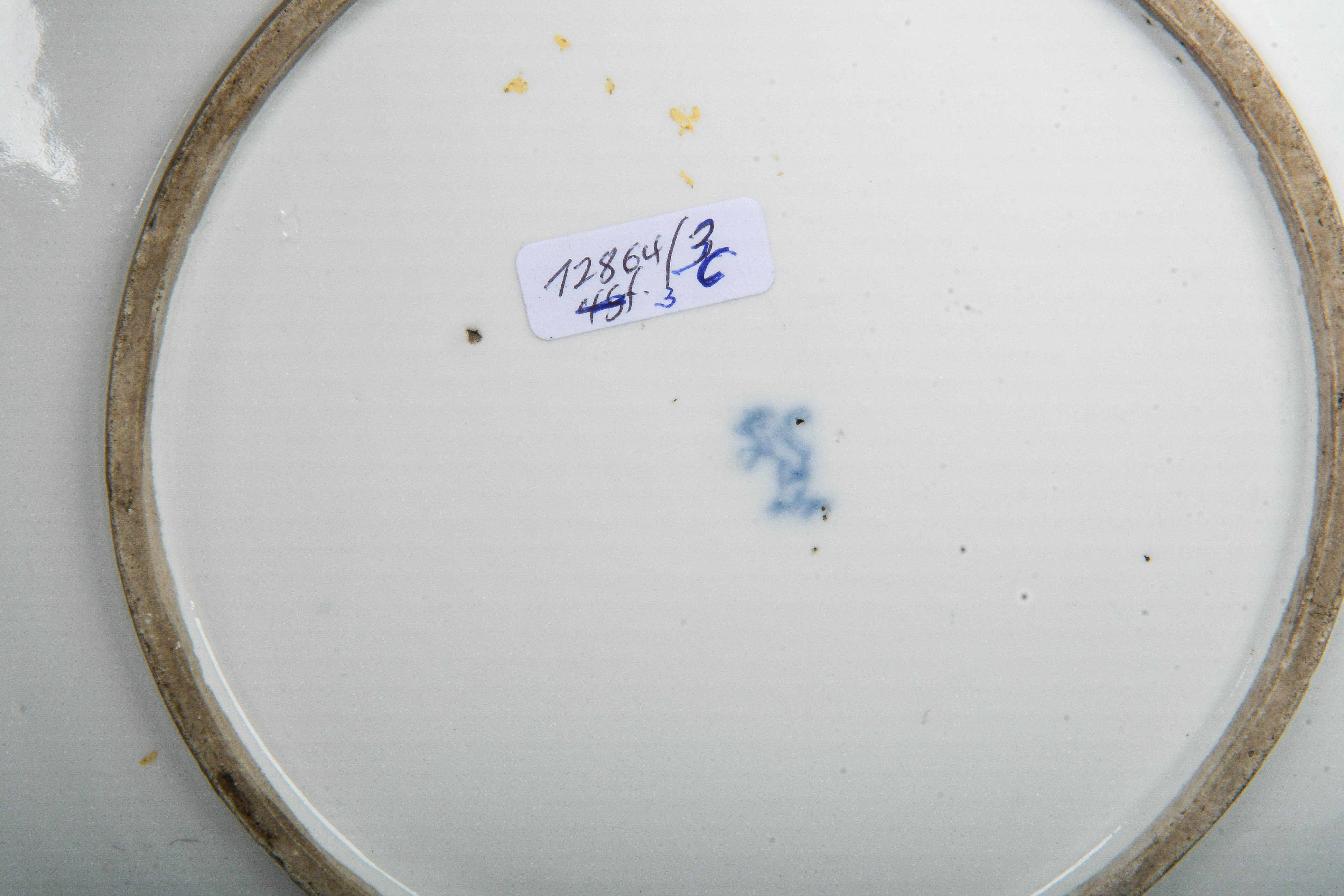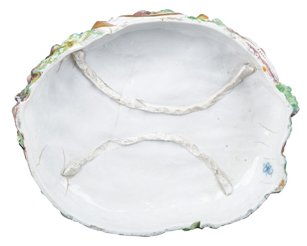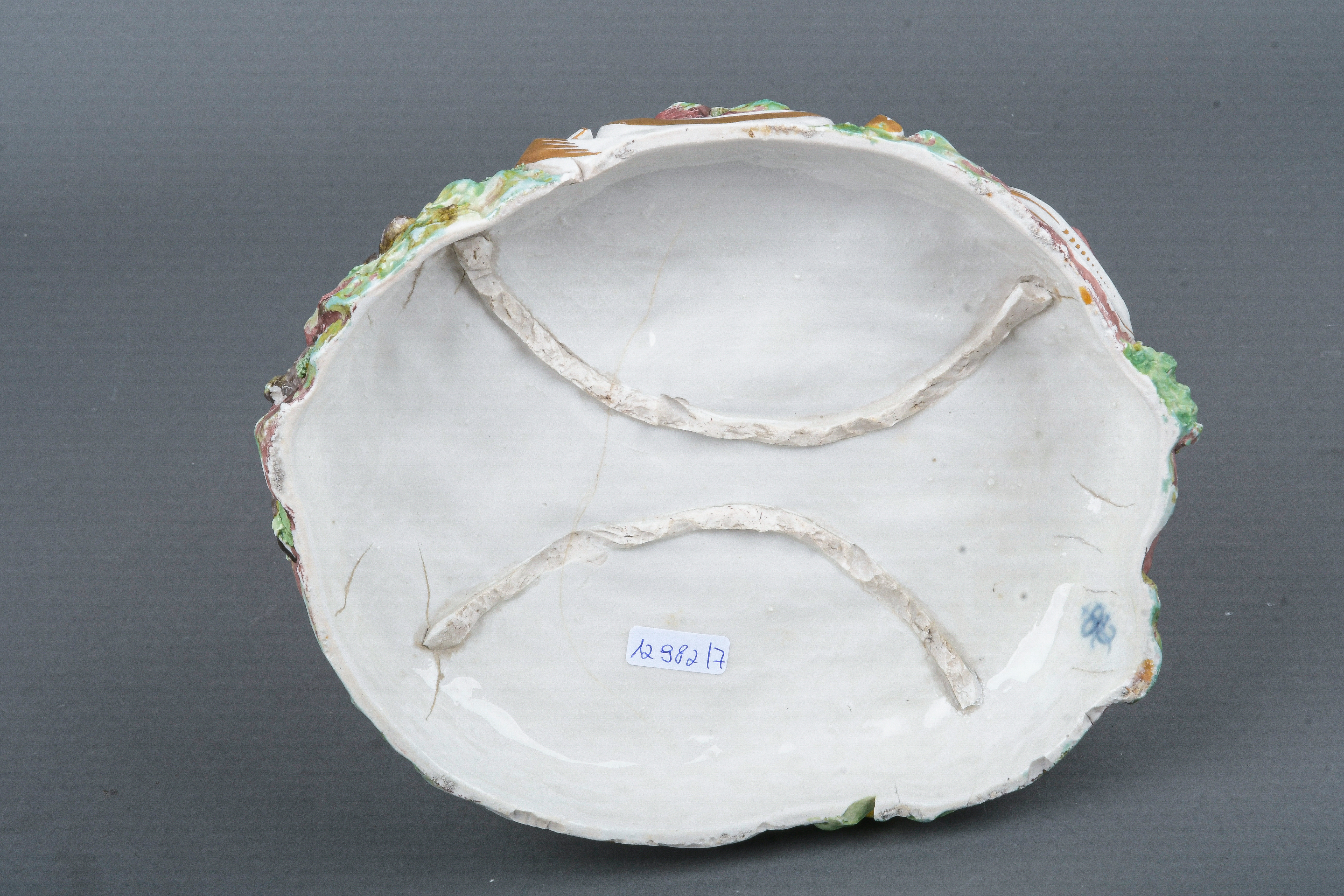 | Rund gemuldet, mit steigender Korbflechtrelieffahne, Spiegel bunt bemalt mit Floraldekor. Porzellan, verso unterglasurblaue steigende Löwenmarke. Vgl. B. Beaucamp-Markowsky, S. 39ff, Nr. 5.