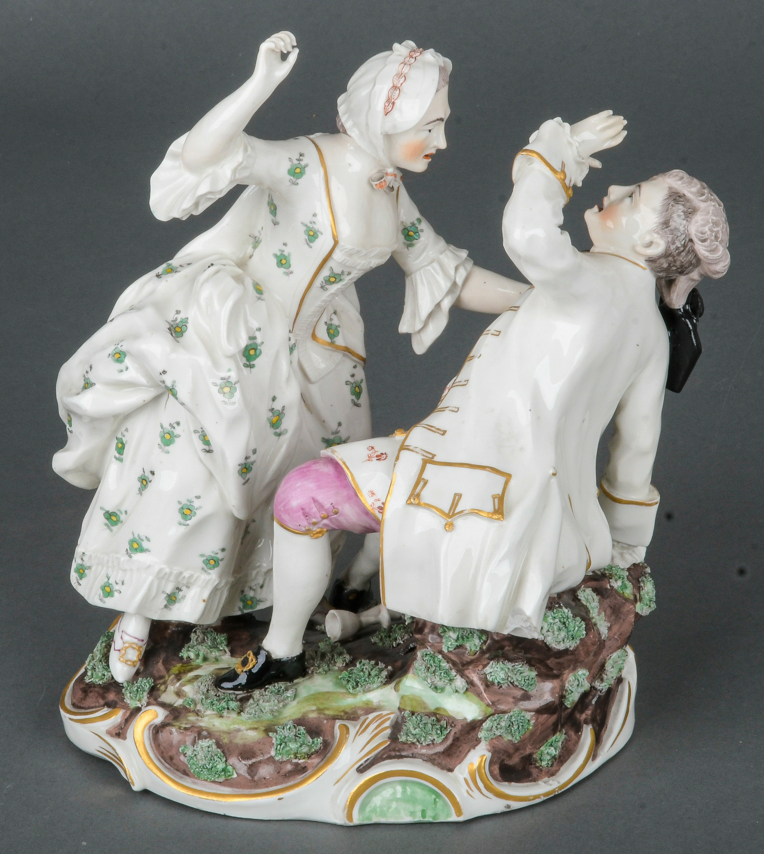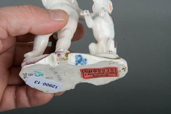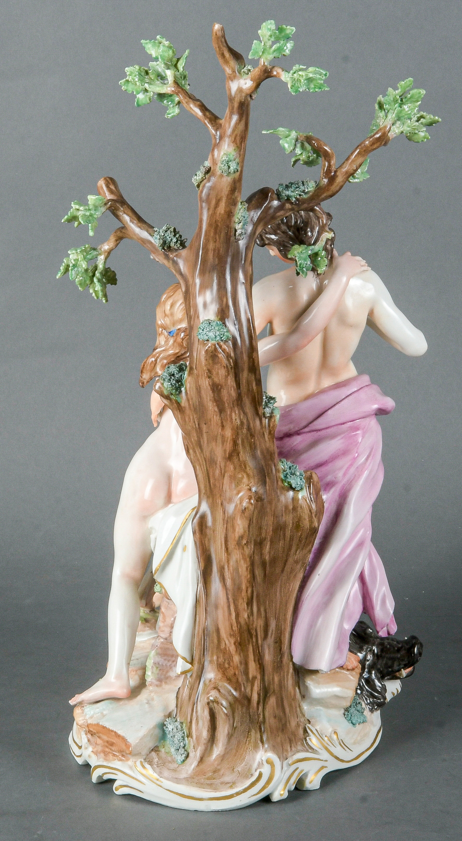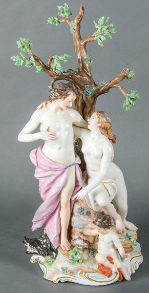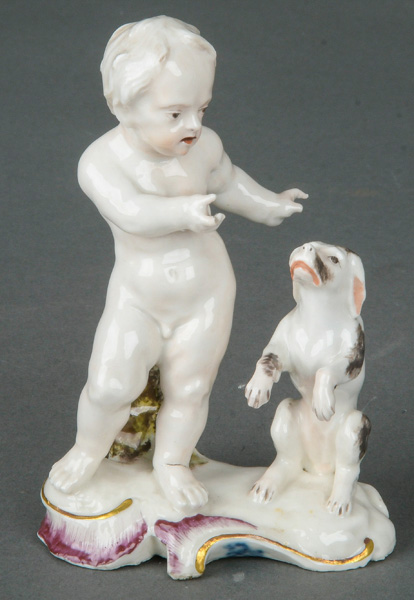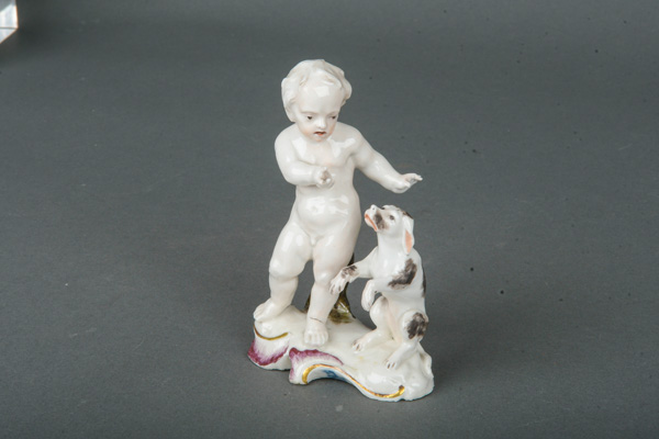 | Nackt stehend, auf ovalem Roccaillesockel, purpurn und gold gesäumt. Seitlich ein Männchen machender Hund. Porzellan, bunt bemalt, am vorderen Sockel unterglasurblaue, steigende Löwenmarke, am Boden Ritzzeichen „PH 3.“, REM Eingangsnr. 16744, Sammlungs-No. 02238. Modell von Johann Wilhelm Lanz. Vgl. B. Beaucamp-Markowsky, S. 128, Nr. 34, id. abgebildet.