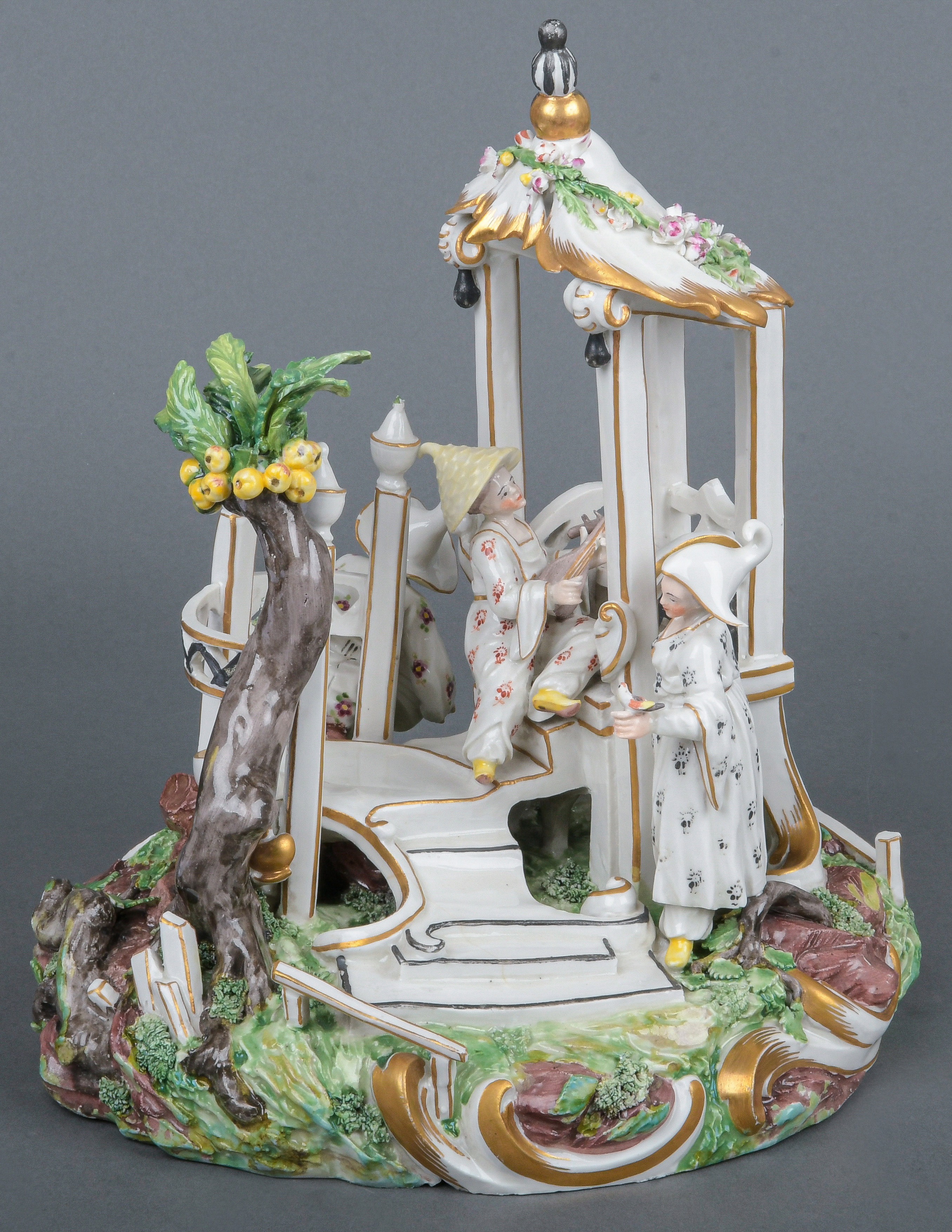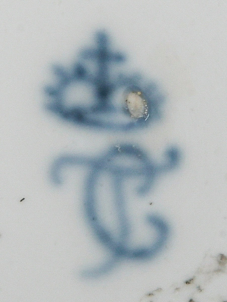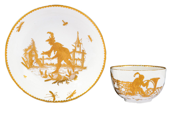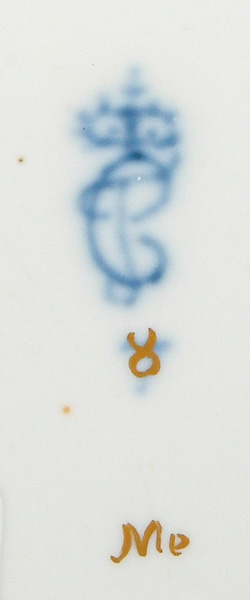 Schauseiten mit Goldchinesen bemalt, teilweise radiert. Ränder mit gezahnter Goldbordüre. Porzellan, am Boden unterglasurblaue, bekrönte, ligierte CT-Marke. Malerei wohl von Johann Michael Apel. Vgl. B. Beaucamp-Markowsky, S. 266ff, Nr. 147.