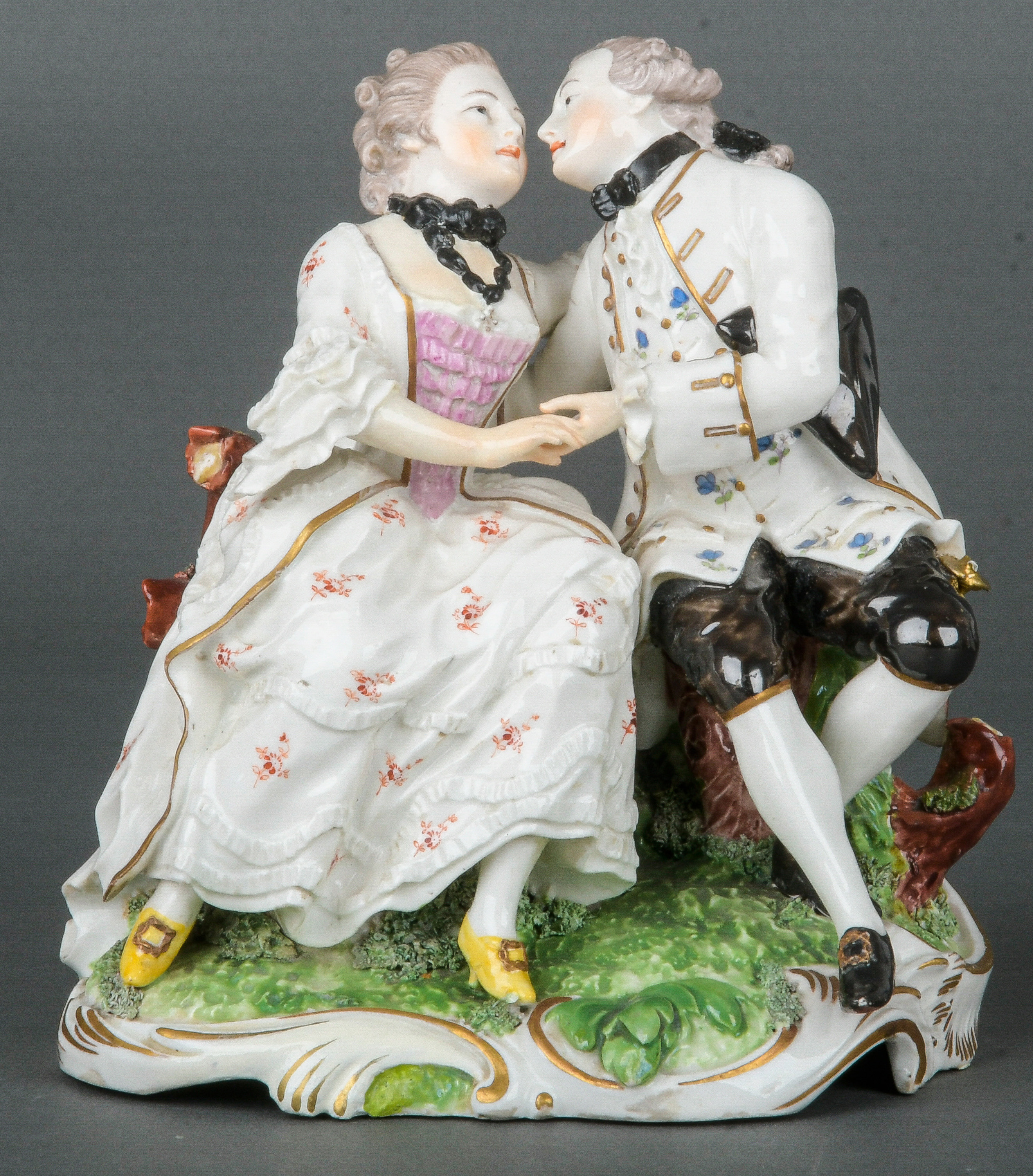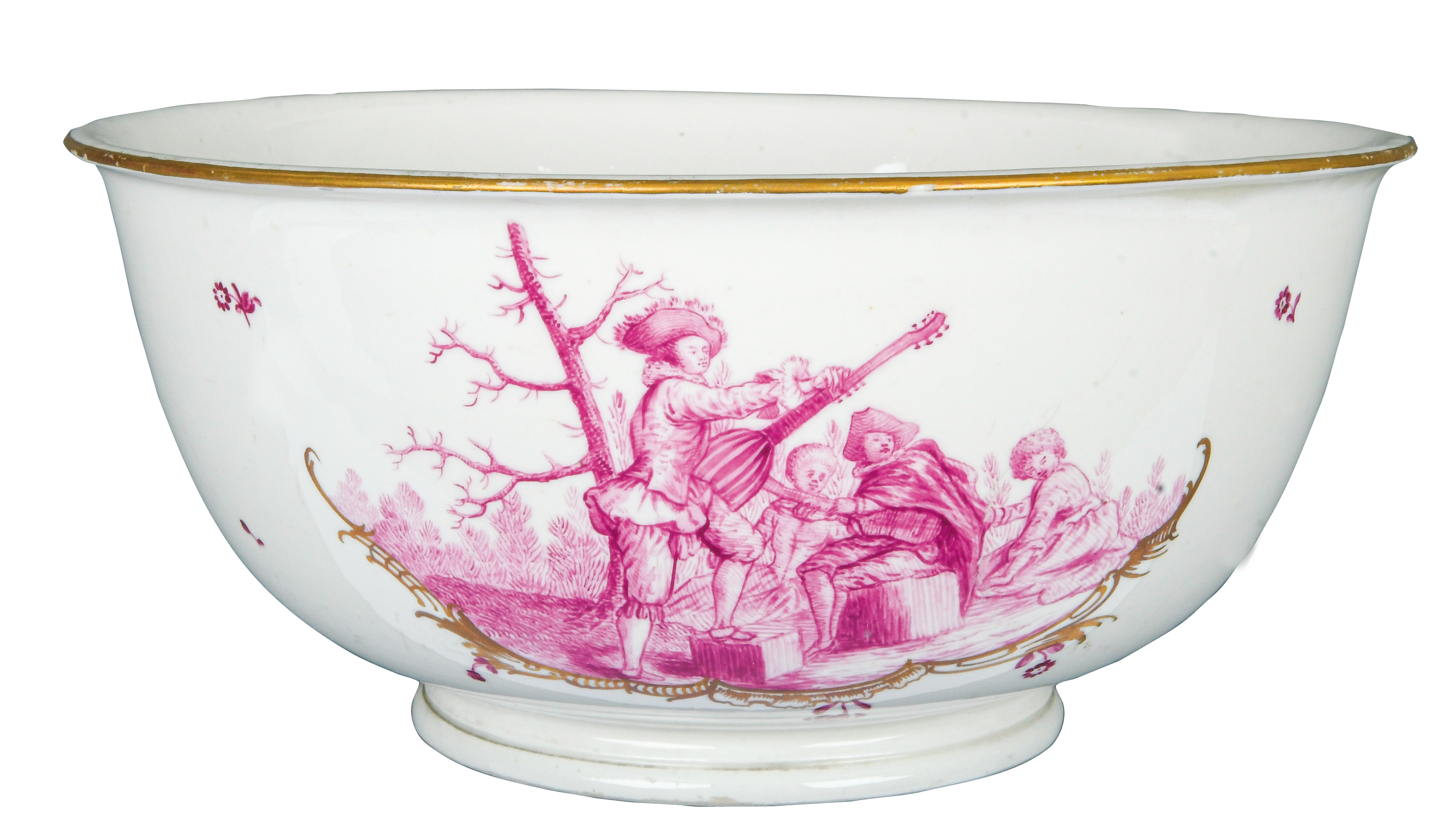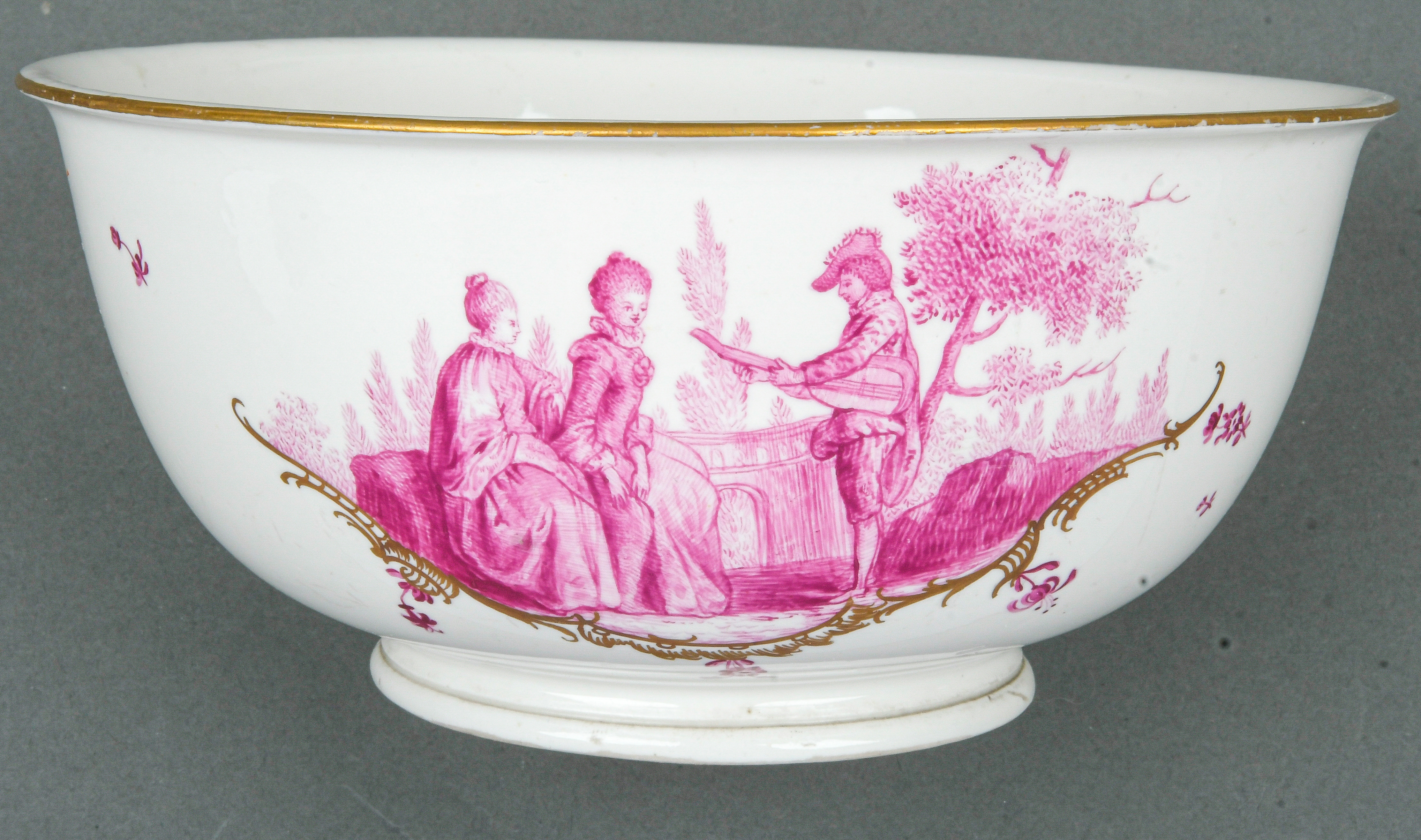 | Malermonogramm „Me 8“, REM Sammlungs-No. 000065. Zugehörig zu einem 19-tlge. Frankenthaler Porzellanservice der Familie Andreas Jordan (1775-1848). Alle Teile exzellent purpurn bemalt mit Figuren, Komödien- und Watteauszenerien in Landschaft auf gold staffierten Rocailleterrassen, teilweise sparsam überdekoriert, Ränder gold gesäumt. Porzellan, am Boden unterglasurblaue, bekrönte, ligierte CT-Marke.Zuerst werden die Serviceteile (Kat.Nr. 371 bis 389) einzeln versteigert. Im Nachgang werden die Einzelbeträge addiert und der höchste Gesamtbetrag erhält den Zuschlag.