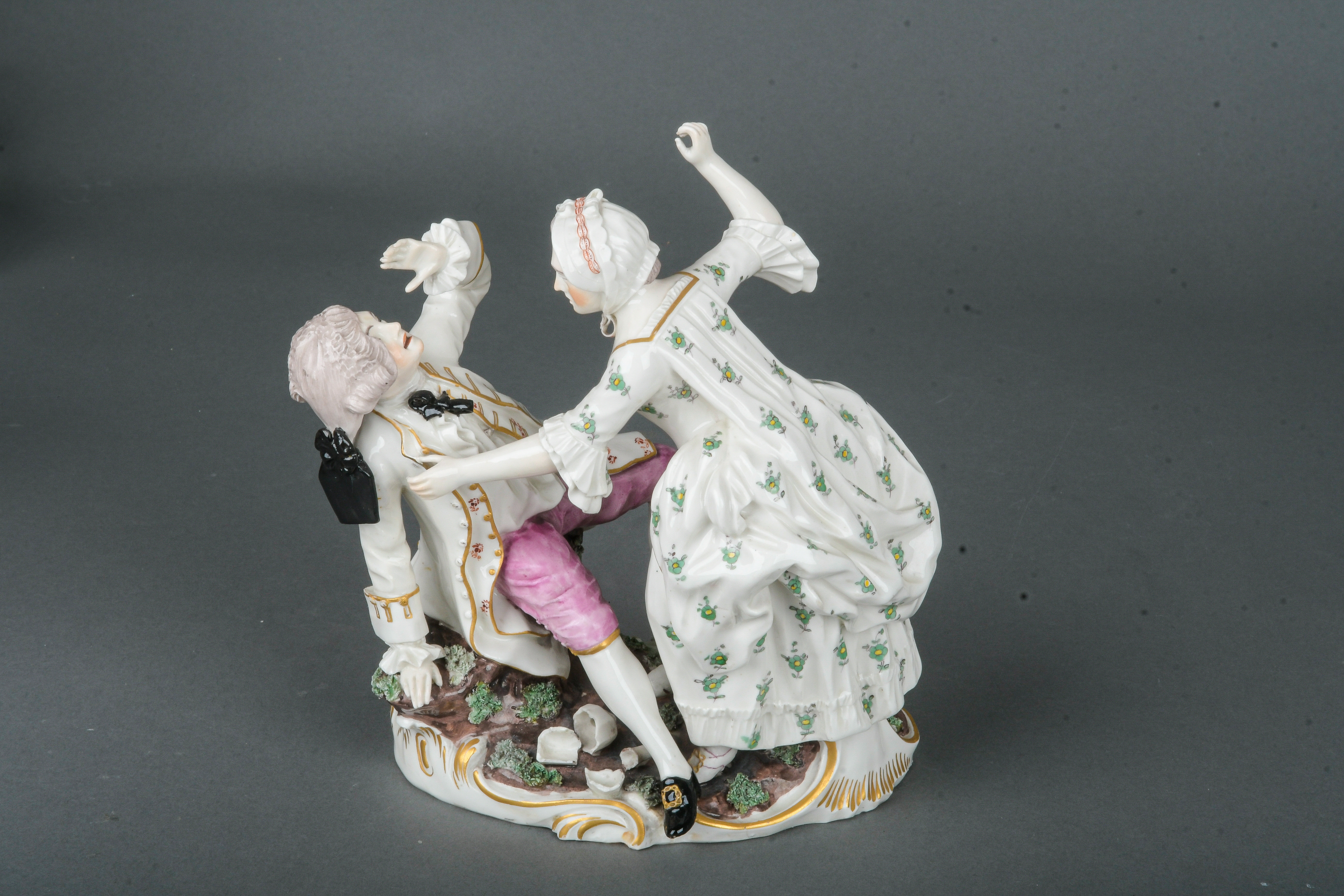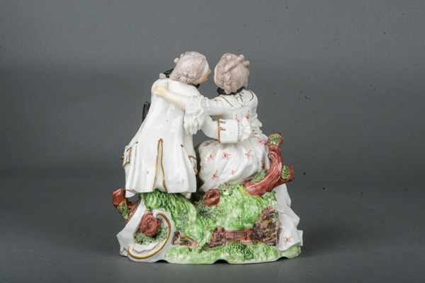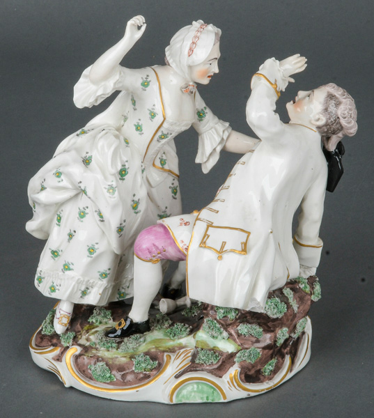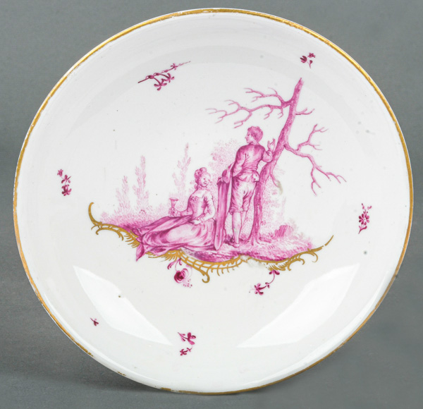 | Malermonogramm „Me 8“, REM Sammlungs-No. 002248. Zugehörig zu einem 19-tlge. Frankenthaler Porzellanservice der Familie Andreas Jordan (1775-1848). Alle Teile exzellent purpurn bemalt mit Figuren, Komödien- und Watteauszenerien in Landschaft auf gold staffierten Rocailleterrassen, teilweise sparsam überdekoriert, Ränder gold gesäumt. Porzellan, am Boden unterglasurblaue, bekrönte, ligierte CT-Marke.Zuerst werden die Serviceteile (Kat.Nr. 371 bis 389) einzeln versteigert. Im Nachgang werden die Einzelbeträge addiert und der höchste Gesamtbetrag erhält den Zuschlag.