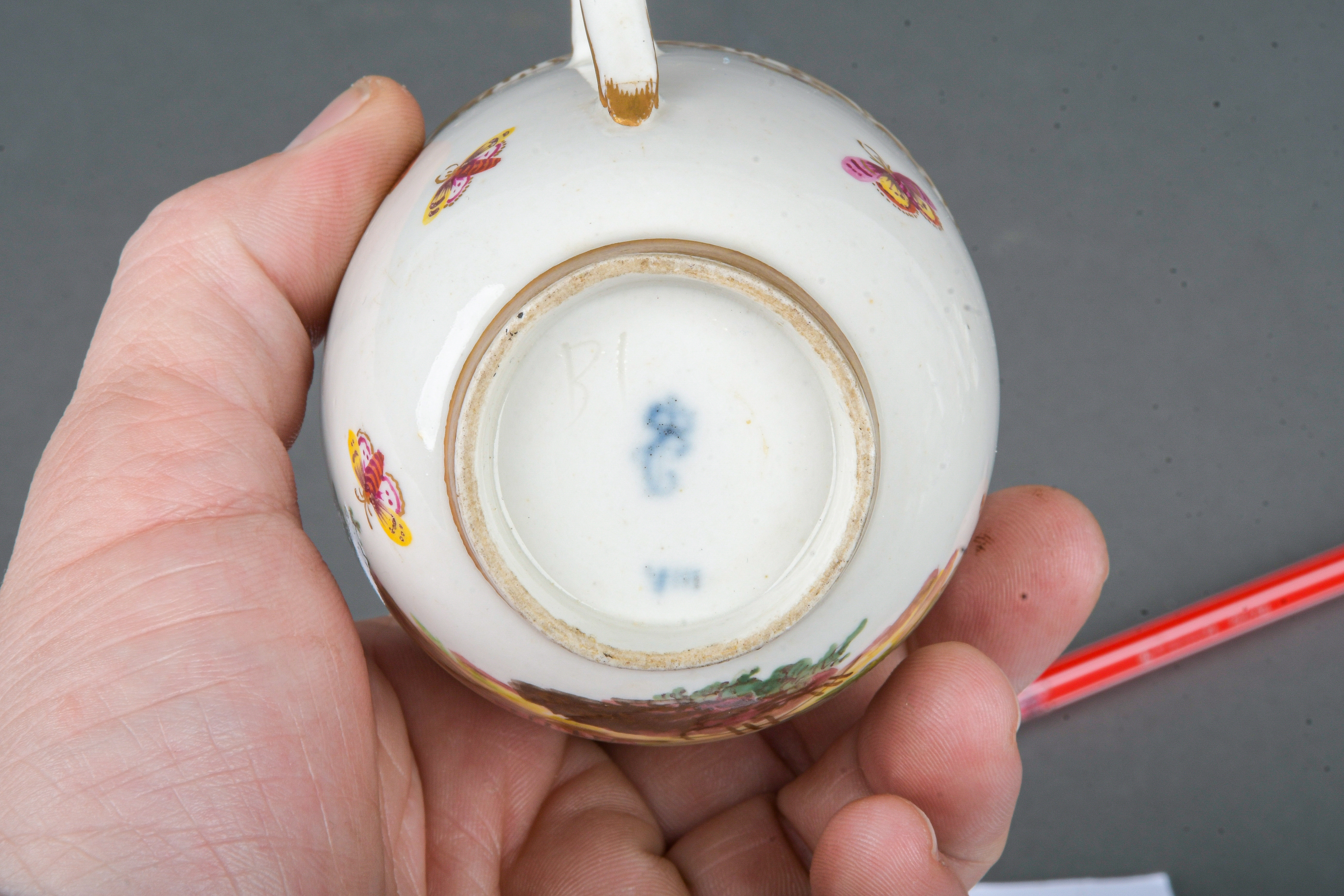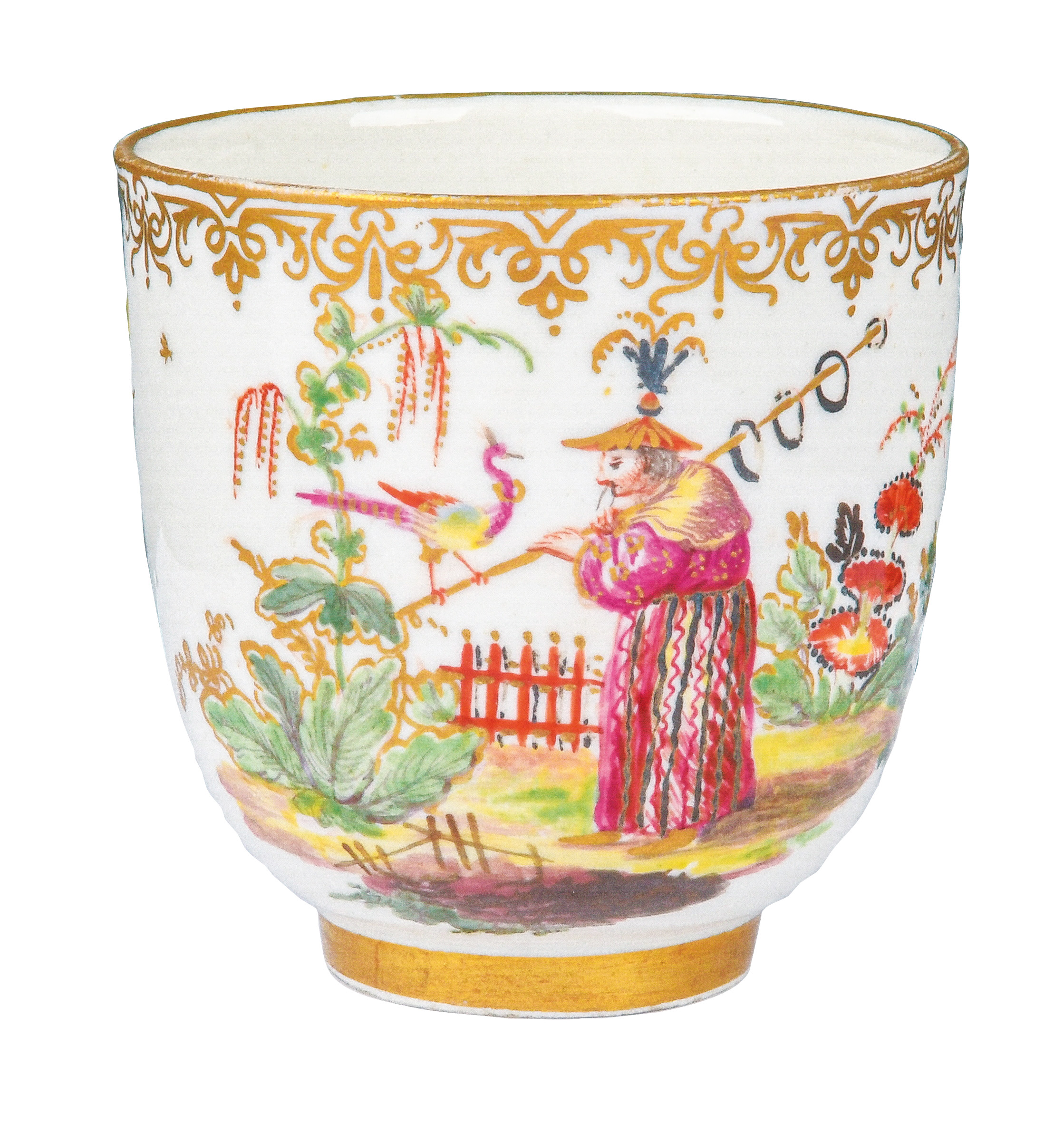 | Walzenförmig, mit seitlichem Ohrhenkel. Breite Goldspitzenbordüre und gold staffierter Standring. Schauseite bunt bemalt mit Chinoiseriendekor, umgeben von Schmetterlingen. Porzellan, am Boden unterglasurblaue, bekrönte, ligierte CT-Marke und „VIII“.