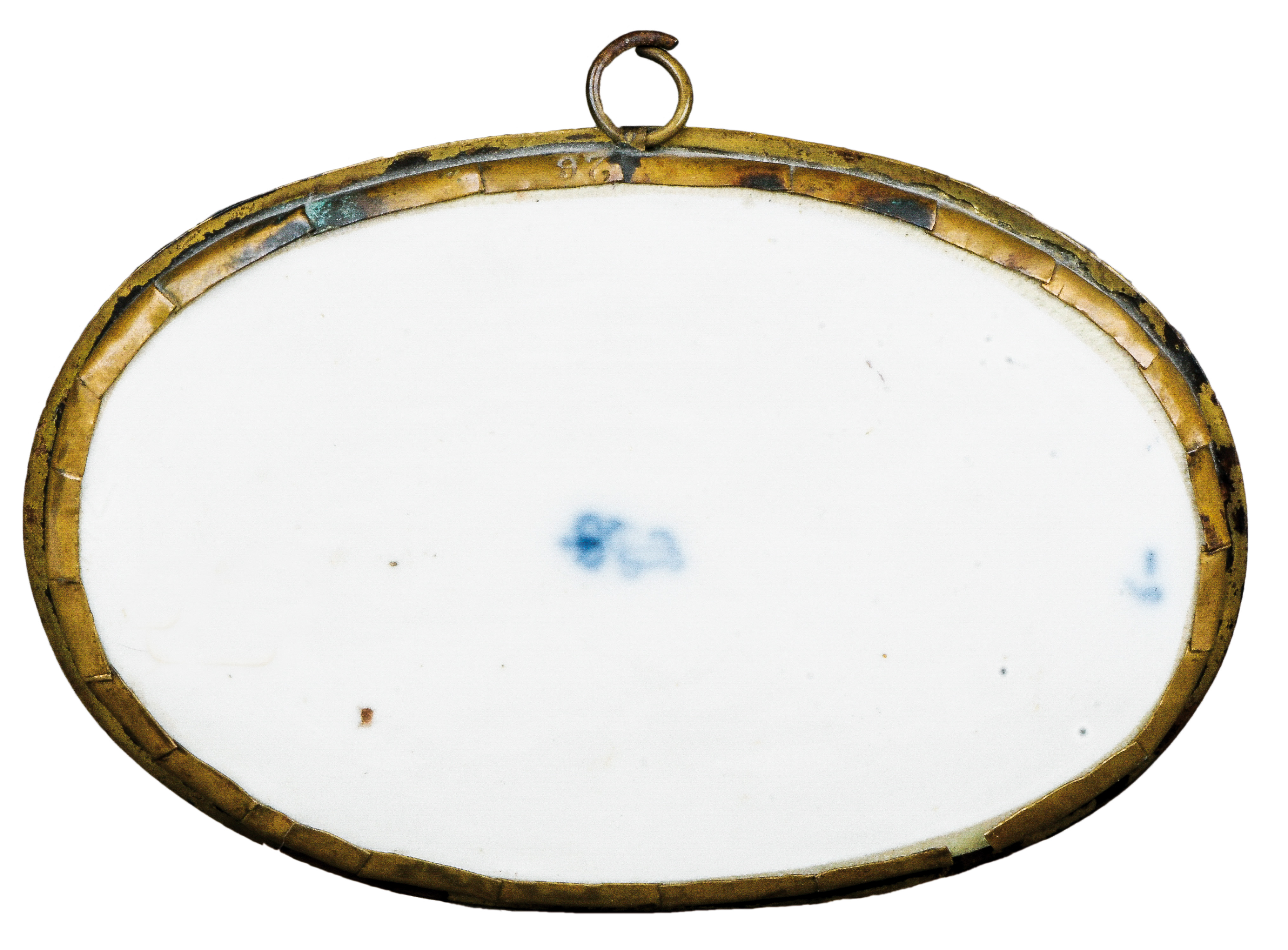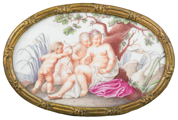 | Exzellent bunt bemalt der mythologischen Szene der Leda, die von Zeus in Gestalt eines Schwanes verführt wird. Porzellan, verso unterglasurblaue, bekrönte, ligierte CT-Marke, in Bronzerahmen. Malerei von Jacob Osterspey.