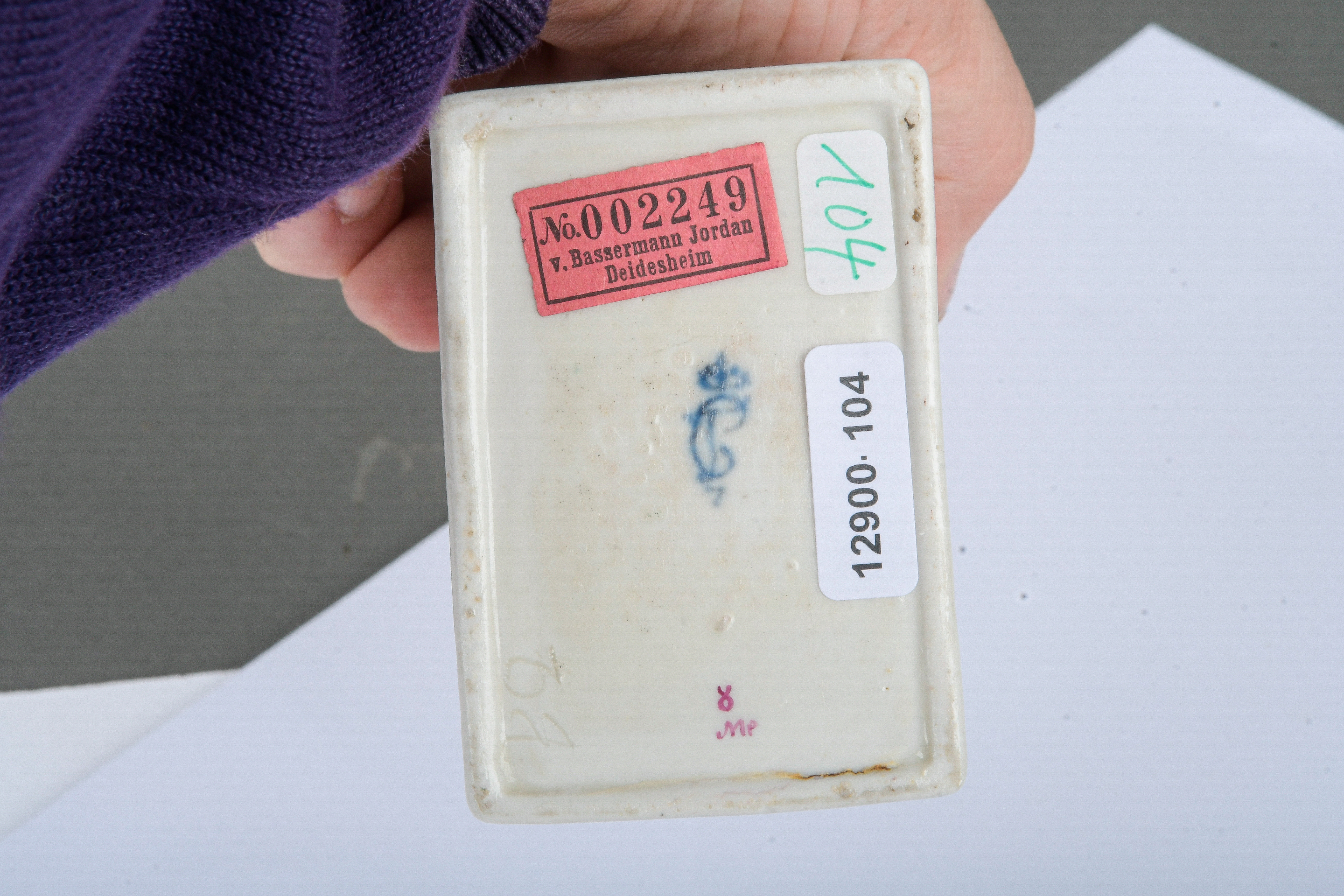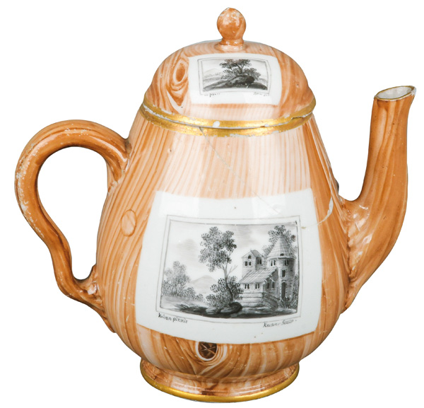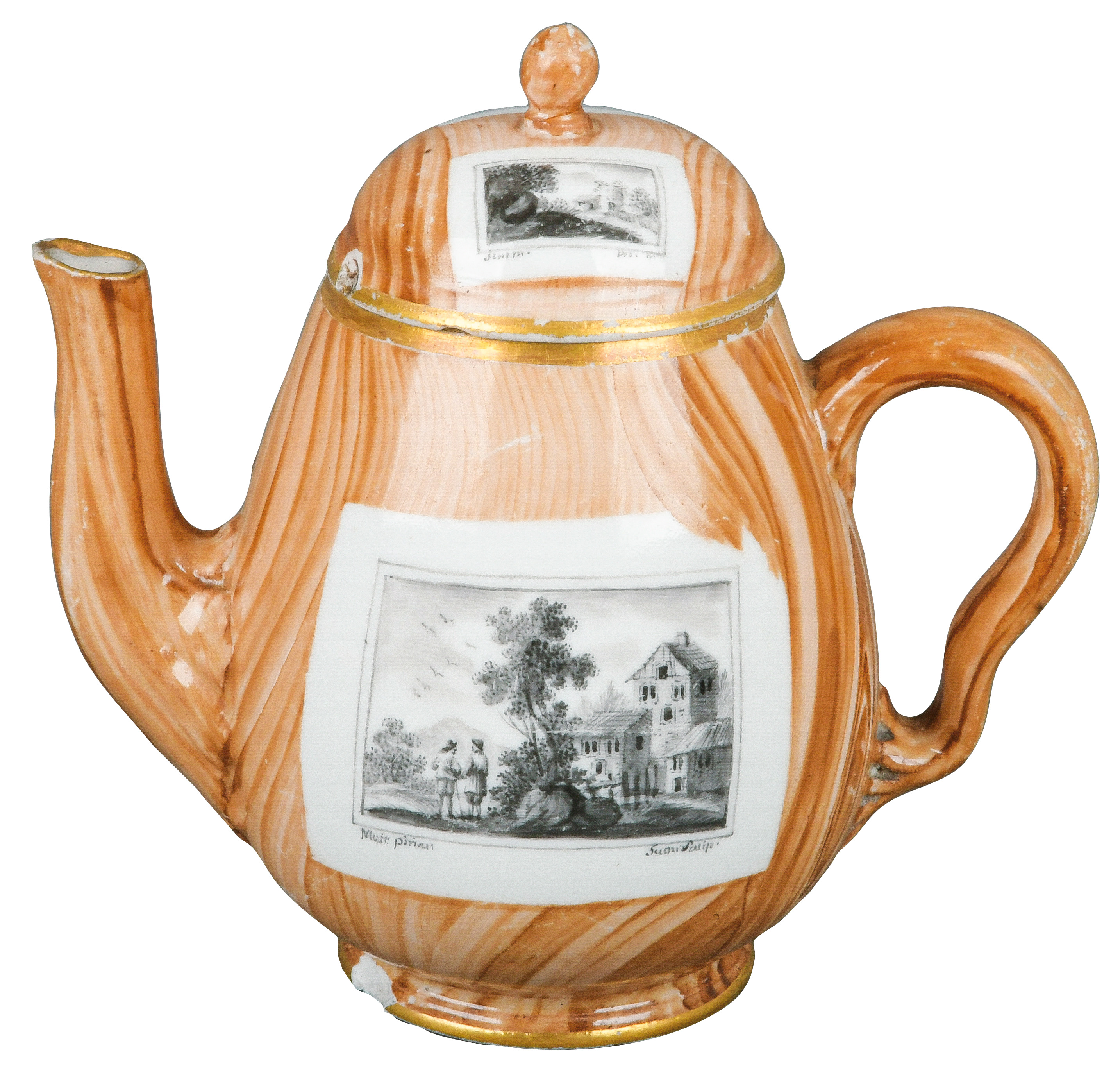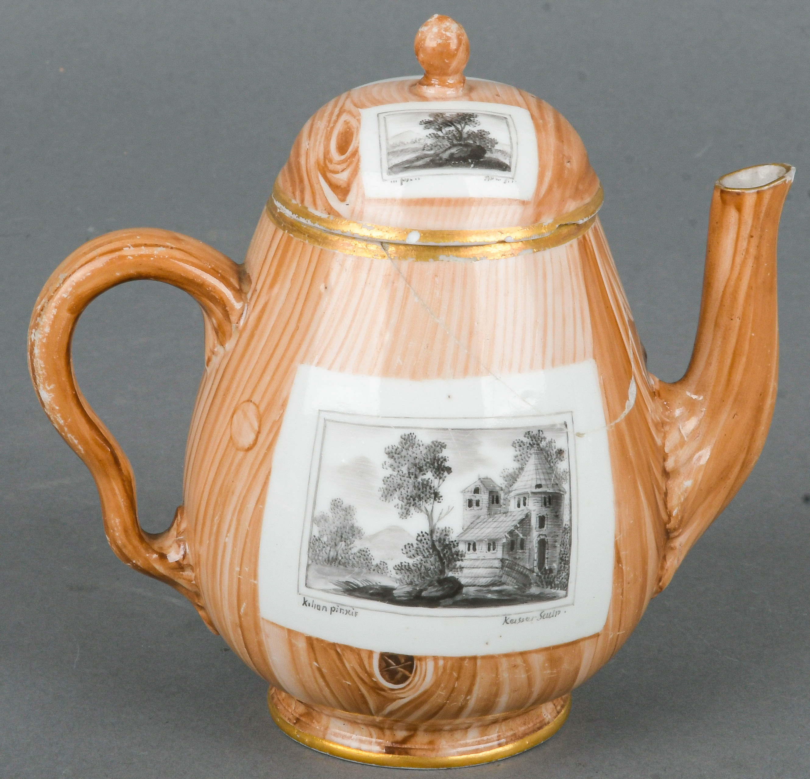 | Birnförmig, mit seitlichem Ohrhenkel und steiler Tülle. Leicht überstehender, gewölbter Deckel mit Pinienzapfenknauf. Beide Teile mit Holzmaserdekor und rechteckigen Aussparungen. Reserven graucamaieu bemalt mit Architekturen und Figurenstaffagen, re./u./sign. Porzellan, am Boden unterglasurblaue, bekrönte, ligierte CT-Marke, REM Sammlungs-No. 000089 (erworben VI 1917). Vgl. B. Beaucamp-Markowsky, S. 298, Nr. 180. (in der Wandung ist ein Stück eingeklebt, best.)