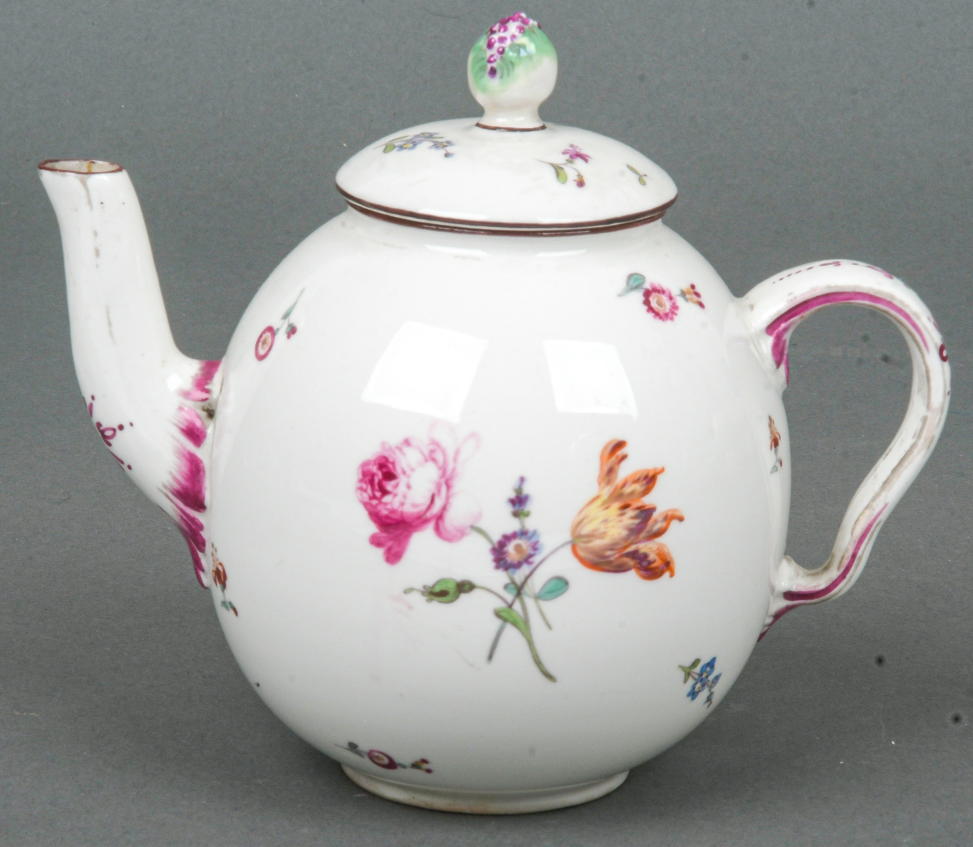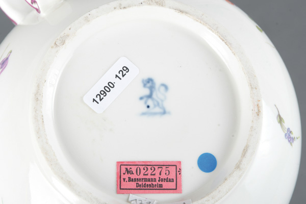| Balusterförmig, mit seitlich gebogtem Ohrhenkel und steiler Röhrentülle. Abgerundete Schultern mit eingezogenem Mündungsrand. Darauf ruhend leicht gewölbter Deckel mit Blütenknauf. Schauseiten bunt bemalt mit Blumenbouquest, umgeben von Streublumen. Porzellan, am Boden unterglasurblaue, bekrönte, ligierte CT-Marke mit „AB“, purpurnes Malerzeichen „fre“, REM Sammlungs-No. 000025. (min. unwesentlich best.)