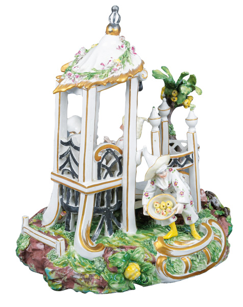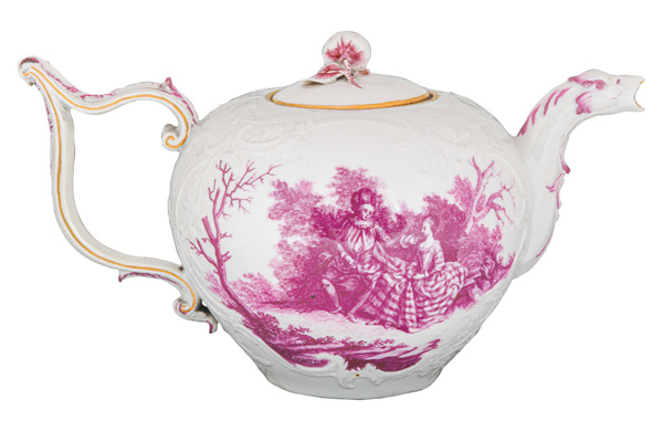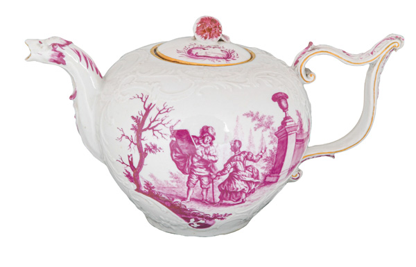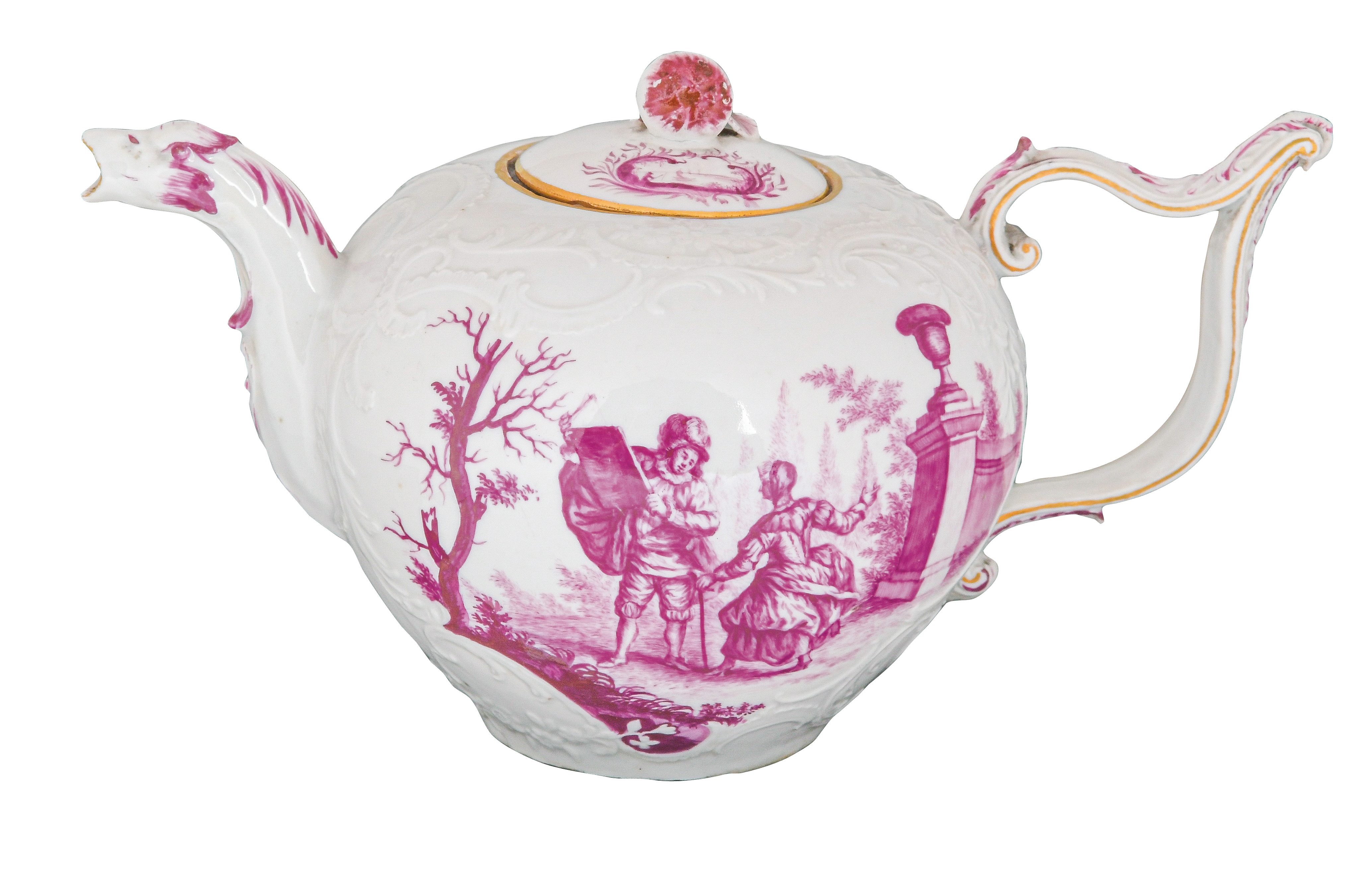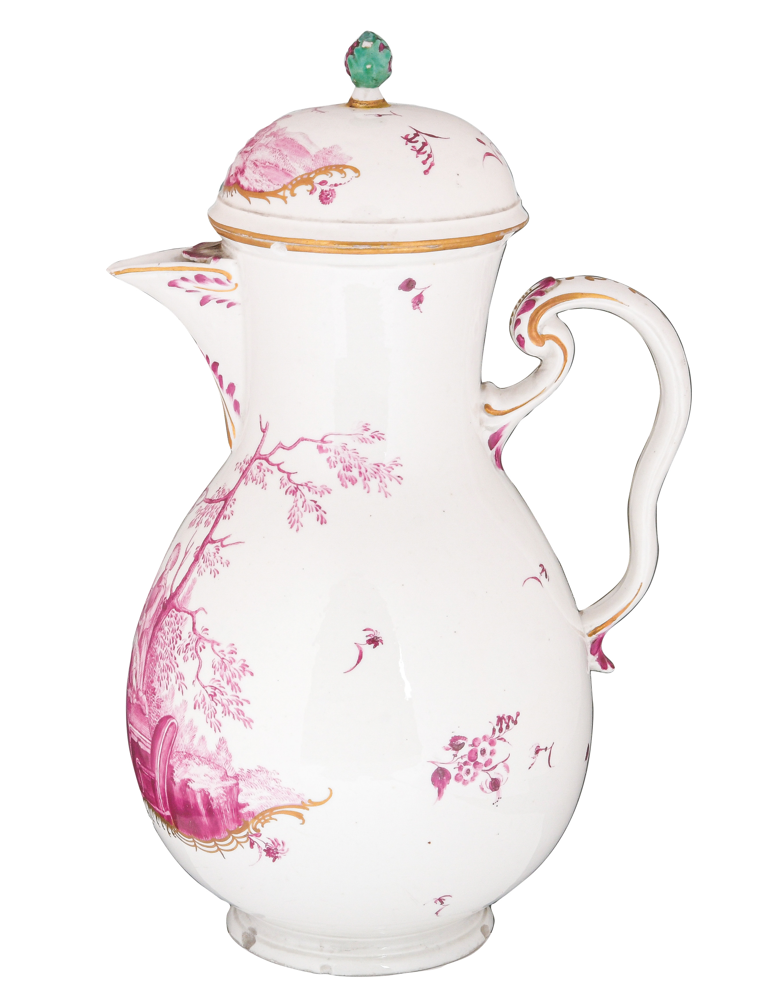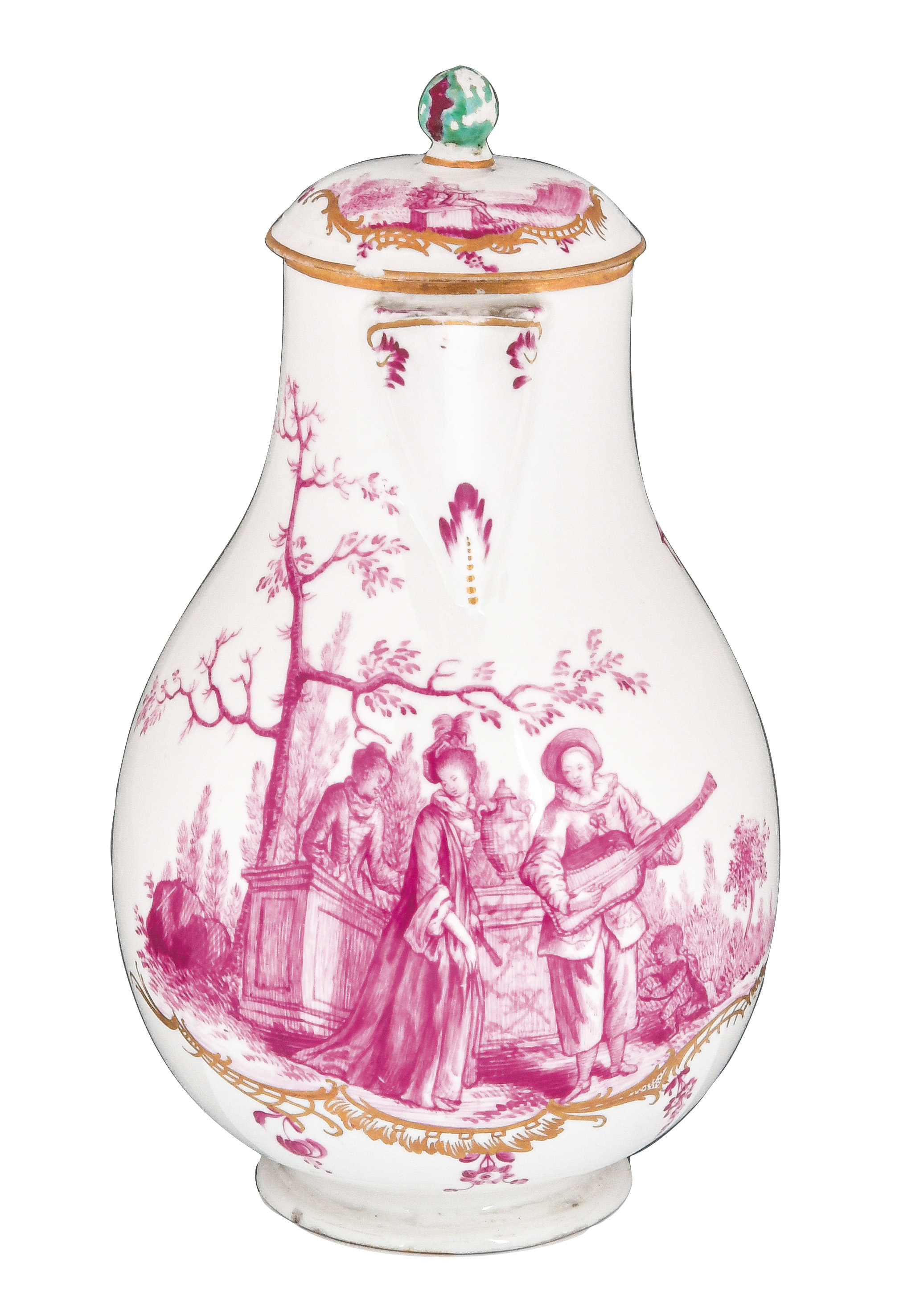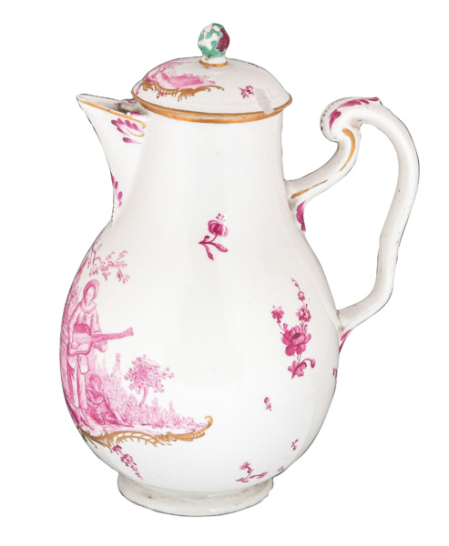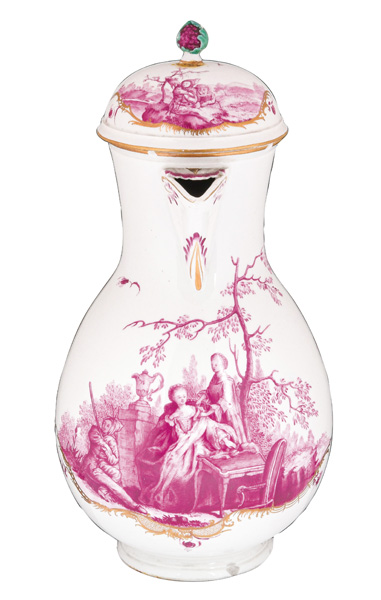 | Balusterförmig, mit seitlichem J-Henkel und Maskaronenausguss. Wandung mit erhabenem Roccaillerelief und Kartuschen. Reserven und Deckel purpurn bemalt mit Komödienfiguren. Porzellan, am Boden eingepresstes „PH“, REM Sammlungs-No. 00028. (min. unwesentlich best.)