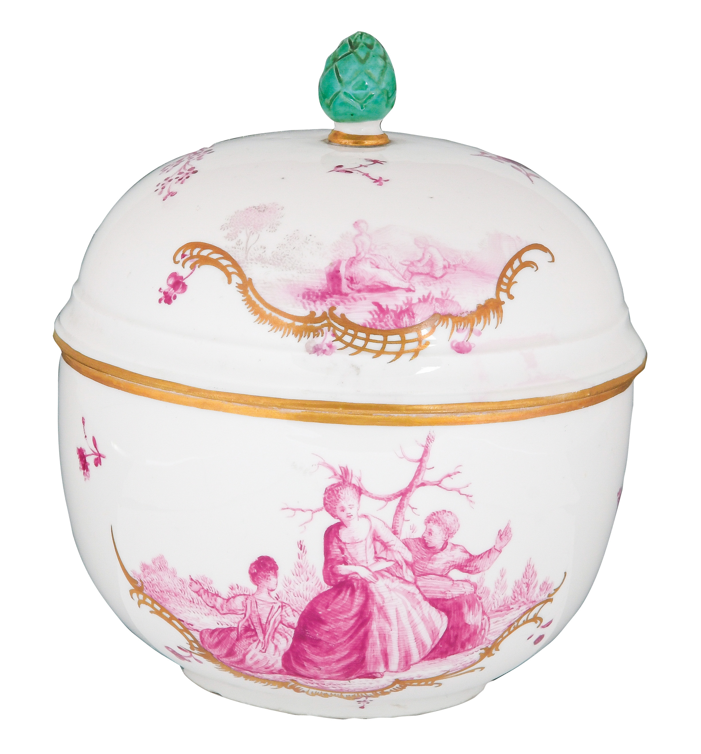 | Malermonogramm „Me“, REM Sammlungs-No. 000064. (best.) Zugehörig zu einem 19-tlge. Frankenthaler Porzellanservice der Familie Andreas Jordan (1775-1848). Alle Teile exzellent purpurn bemalt mit Figuren, Komödien- und Watteauszenerien in Landschaft auf gold staffierten Rocailleterrassen, teilweise sparsam überdekoriert, Ränder gold gesäumt. Porzellan, am Boden unterglasurblaue, bekrönte, ligierte CT-Marke.Zuerst werden die Serviceteile (Kat.Nr. 371 bis 389) einzeln versteigert. Im Nachgang werden die Einzelbeträge addiert und der höchste Gesamtbetrag erhält den Zuschlag.