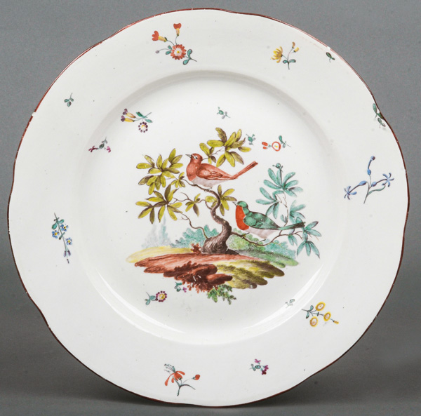 | Rund gemuldet, mit steigender Fahne, kapuzinerbraun gesäumt. Spiegel bunt bemalt mit heimischen Vögeln in Landschaft, umgeben von Streublumen. Porzellan, verso unterglasurblaue, bekrönte, ligierte CT-Marke. Vgl. B. Beaucamp-Markowsky, S. 122, Nr. 52.