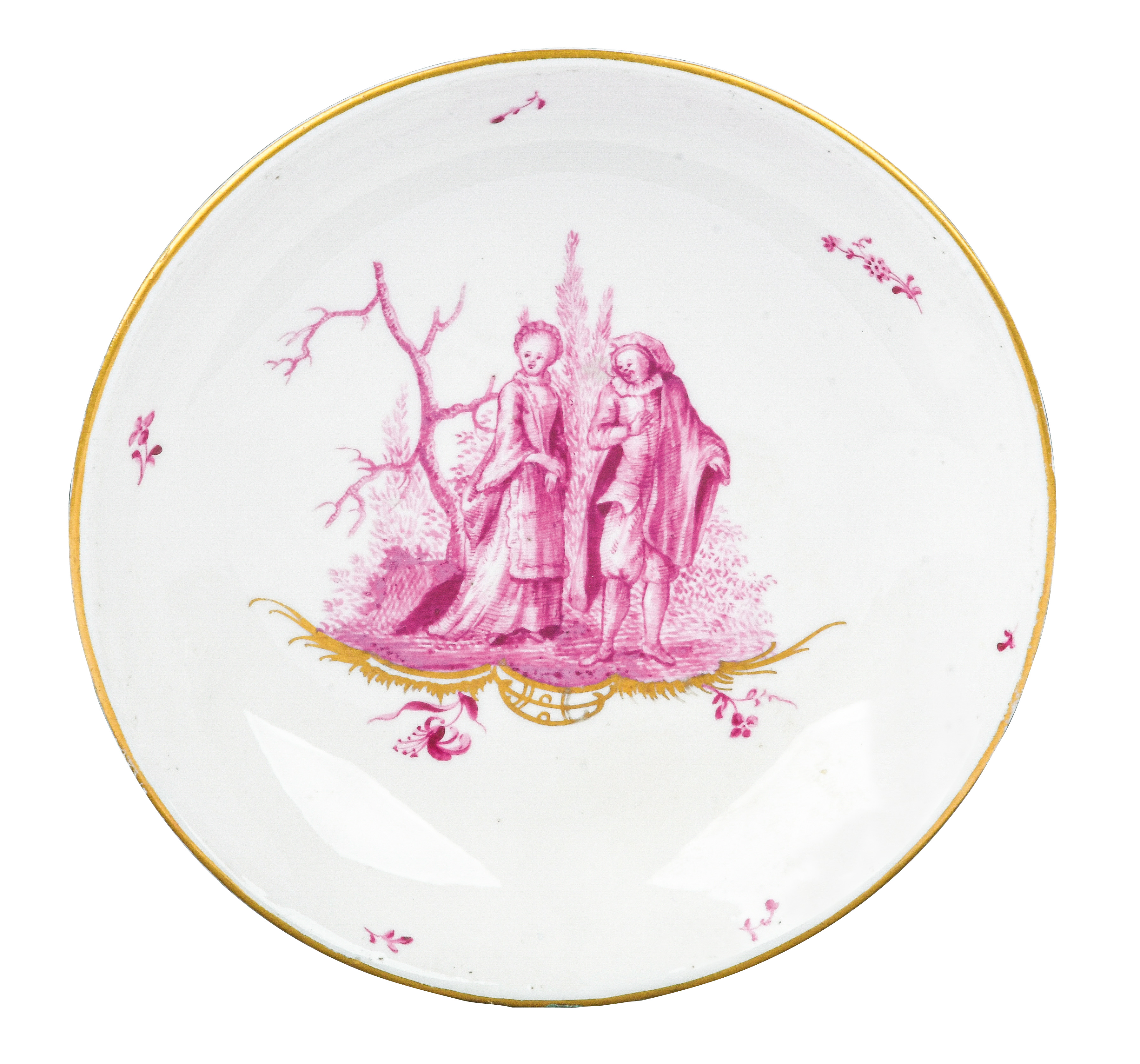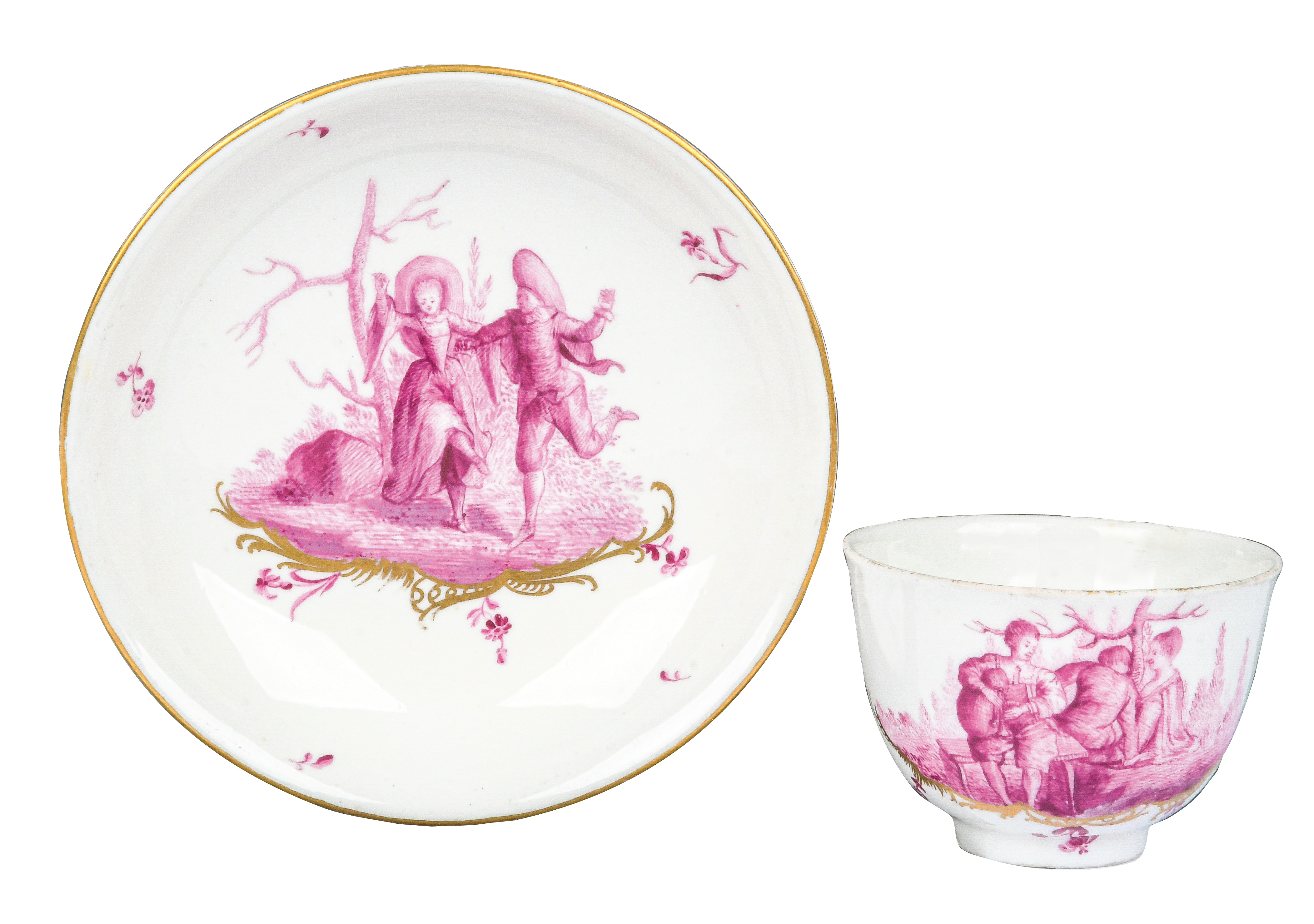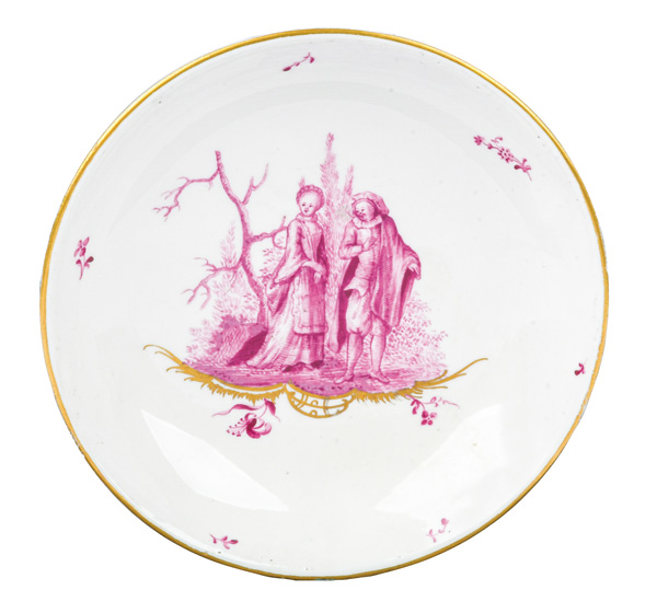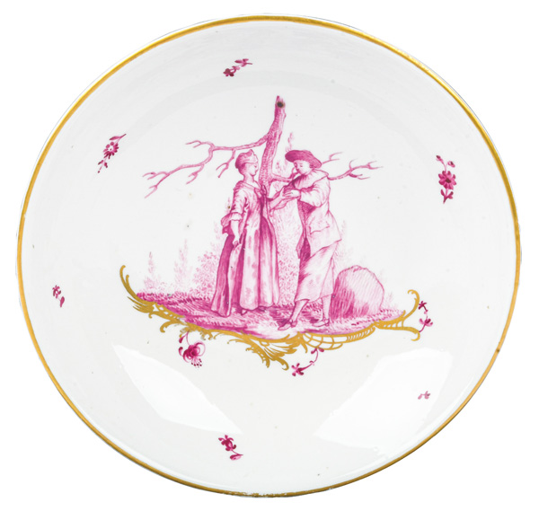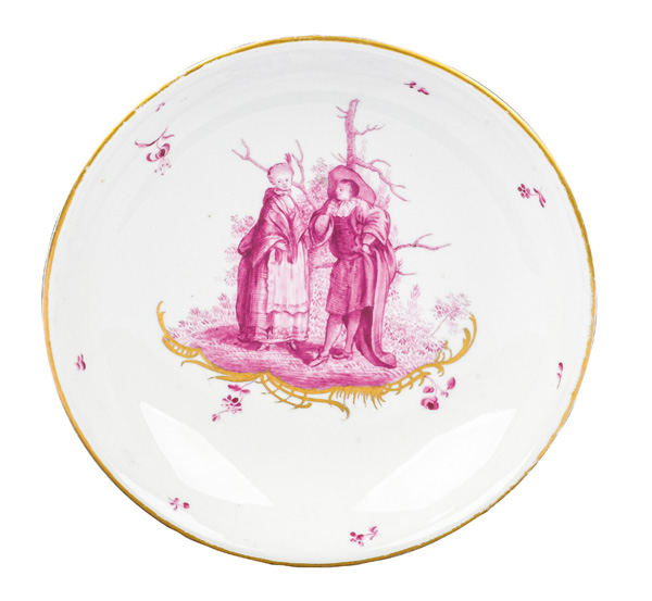 Malermonogramm „R“, Ritzzeichen „B2“, REM Sammlungs-No. 002250. Zugehörig zu einem 19-tlge. Frankenthaler Porzellanservice der Familie Andreas Jordan (1775-1848). Alle Teile exzellent purpurn bemalt mit Figuren, Komödien- und Watteauszenerien in Landschaft auf gold staffierten Rocailleterrassen, teilweise sparsam überdekoriert, Ränder gold gesäumt. Porzellan, am Boden unterglasurblaue, bekrönte, ligierte CT-Marke.Zuerst werden die Serviceteile (Kat.Nr. 371 bis 389) einzeln versteigert. Im Nachgang werden die Einzelbeträge addiert und der höchste Gesamtbetrag erhält den Zuschlag.