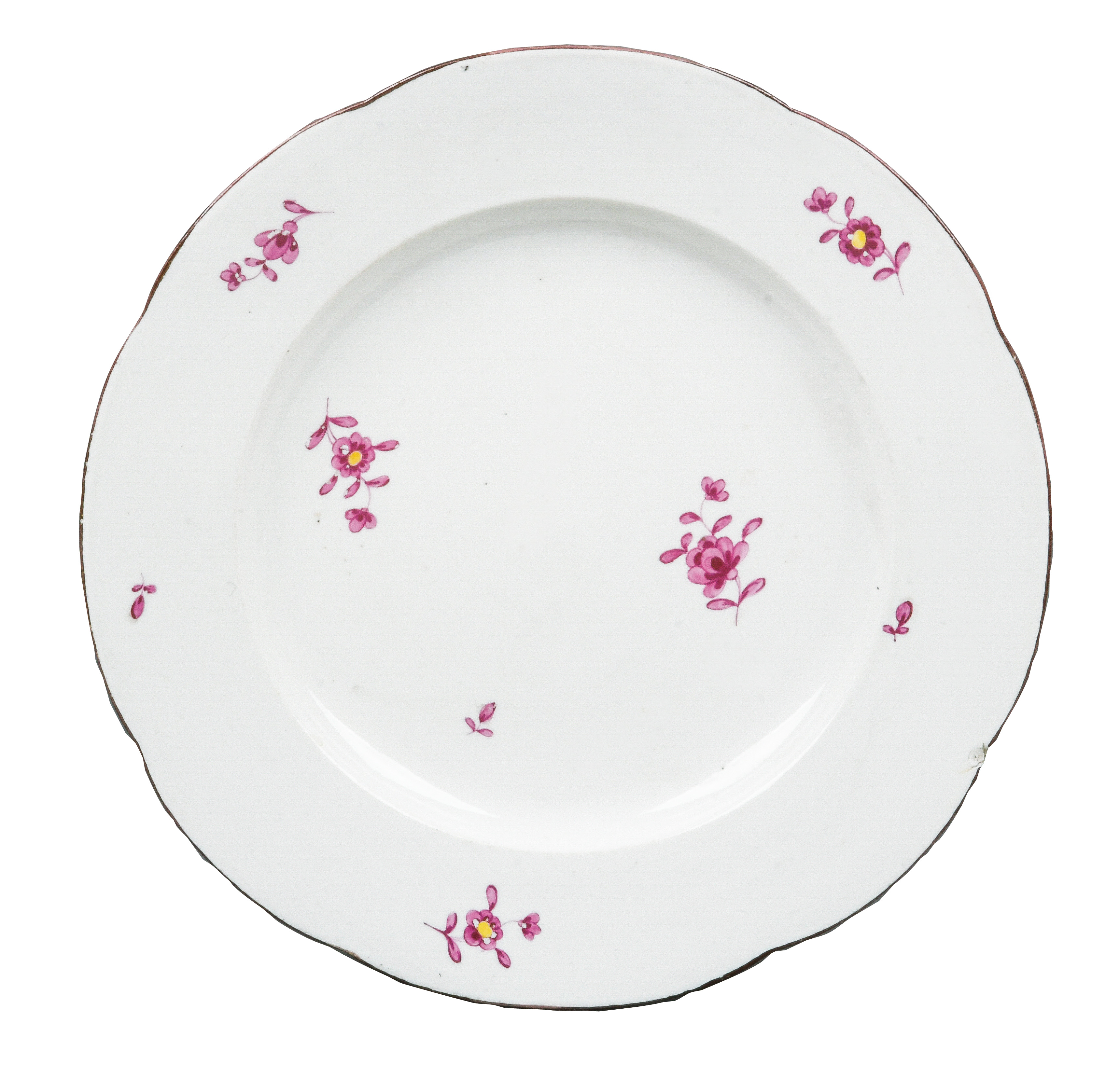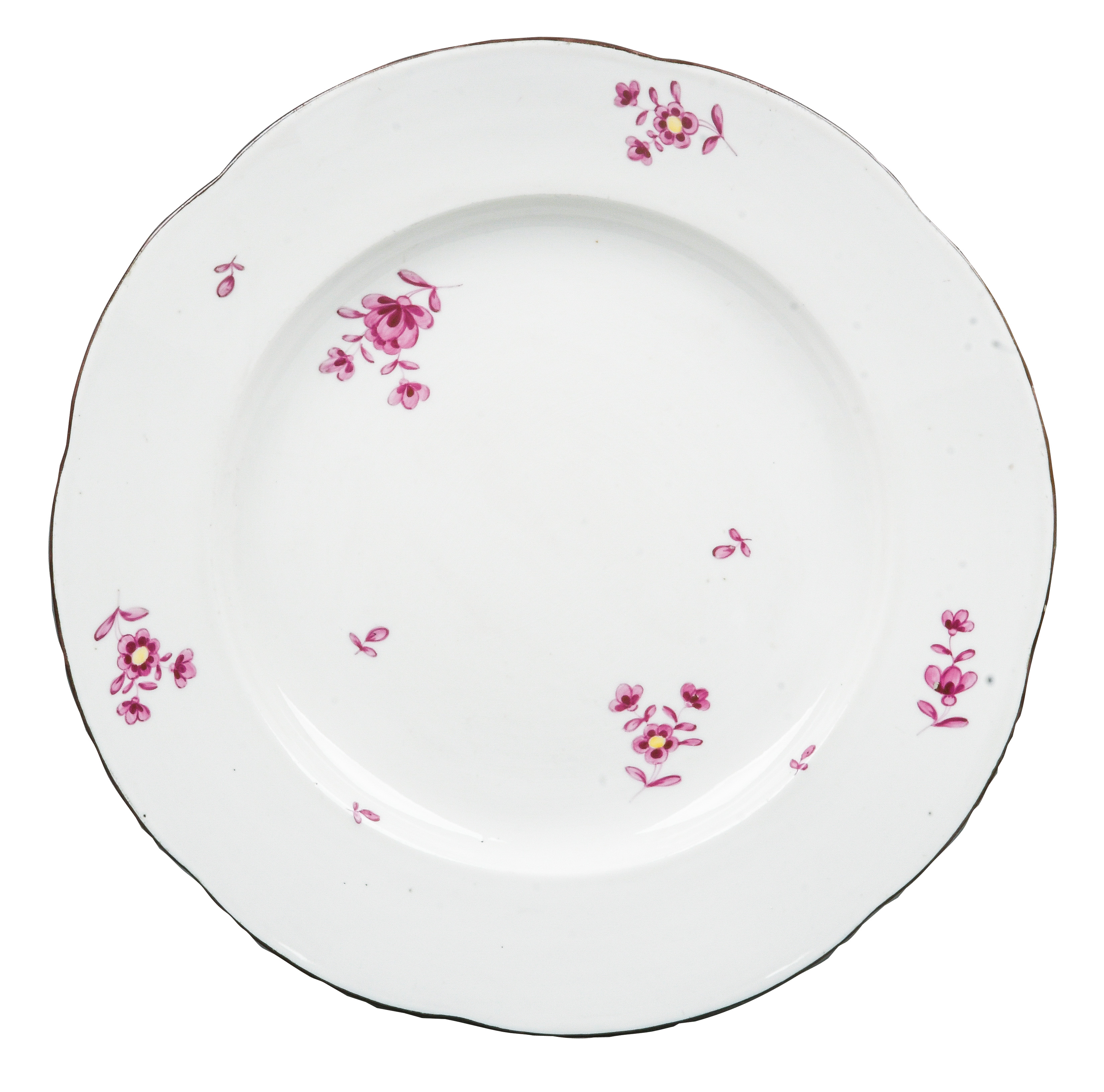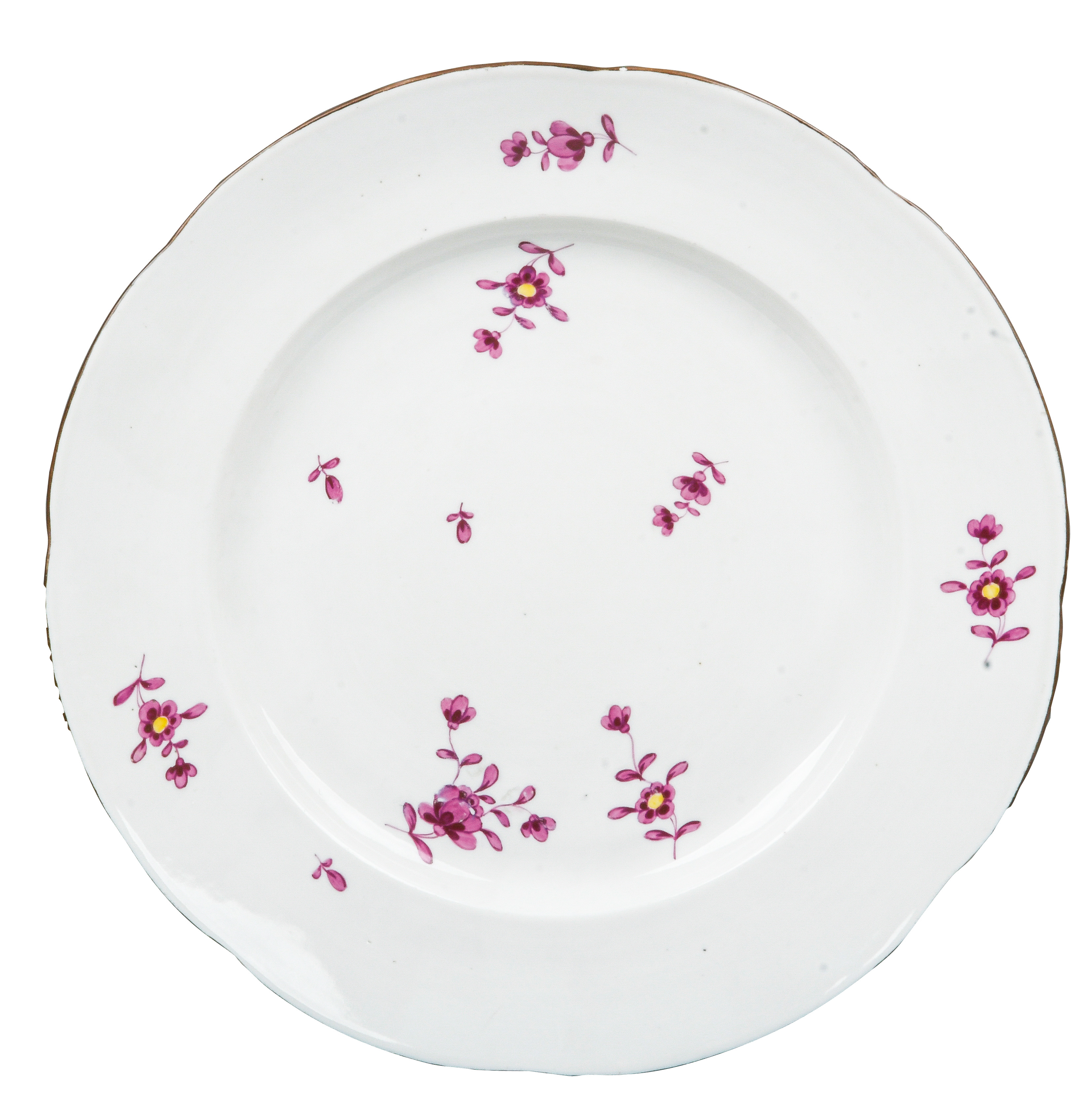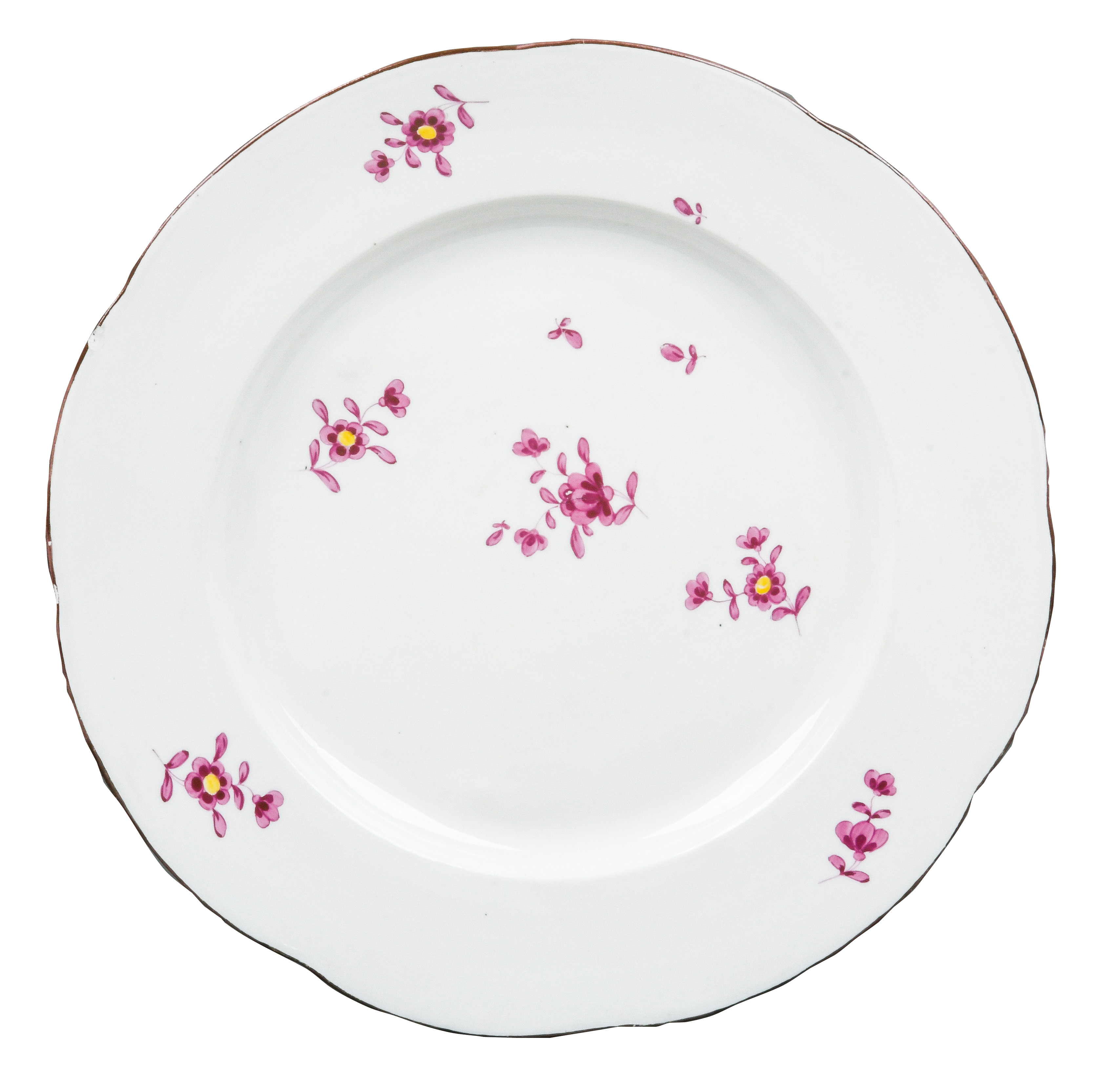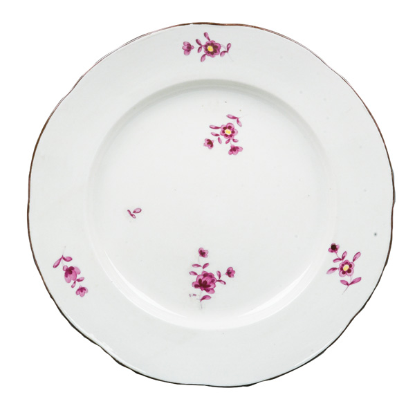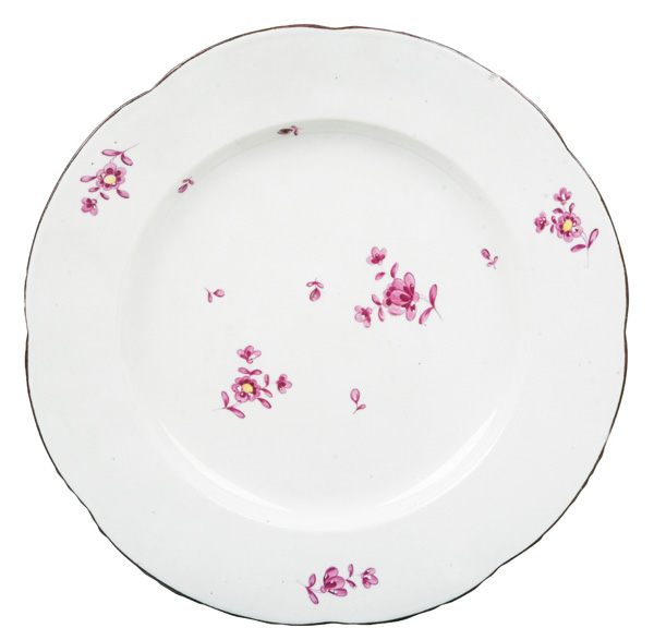 | REM Sammlungs-No. 000047. Zugehörig zu einer Sammlung von neun Tellern. Diese Teller waren bei der Familie Bassermann-Jordan zu Festlichkeiten regelmäßig in Gebrauch. Je rund gemuldet mit steigender Fahne und umlaufend gewelltem, kapuzinerbraun staffiertem Lippenrand. Sparsam purpurn bemalt mit indianischen Streublumen. Porzellan, verso unterglasurblaue, bekrönte, ligierte CT-Marke. Zuerst werden die Teller einzeln aufgerufen. Im Nachgang werden die Einzelbeträge addiert und das höhere Gesamtgebot erhält den Zuschlag.