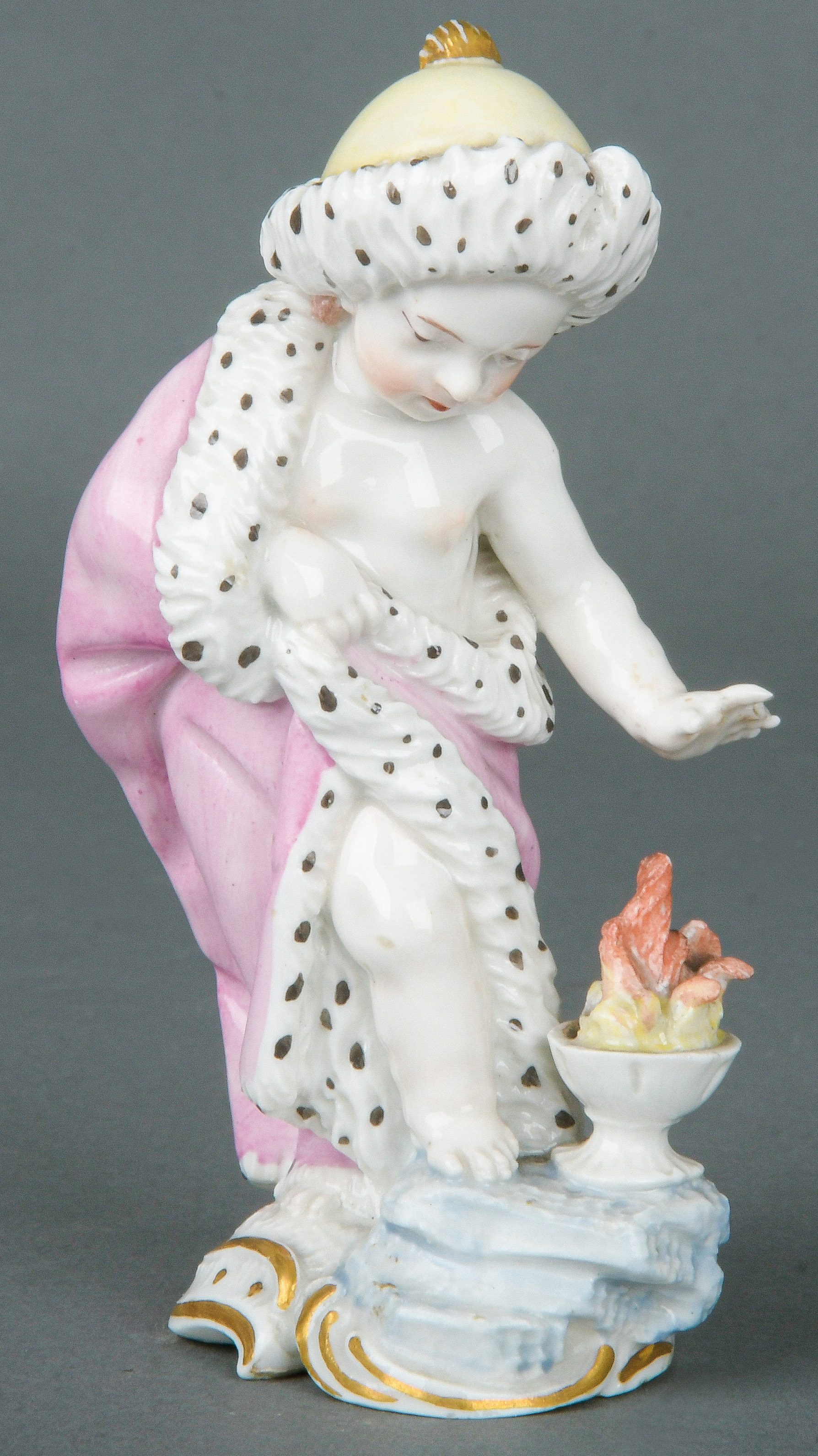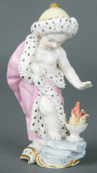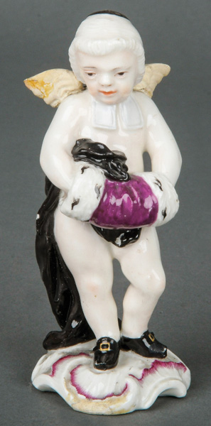 | Leicht bekleidet, in Gewand gehüllt, sich die Hände im Muff wärmend. Auf rundem, unregelmäßigem, reliefiertem Roccaillesockel, purpurn gesäumt. Porzellan, am Boden unterglasurblaue steigende Löwenmarke mit „PH“, REM Sammlungs-No. 002169. Modell von Johann Wilhelm Lanz. Vgl. B. Beaucamp-Markowsky, S. 135, Nr. 37. (Flügel ergänzt, rest.)