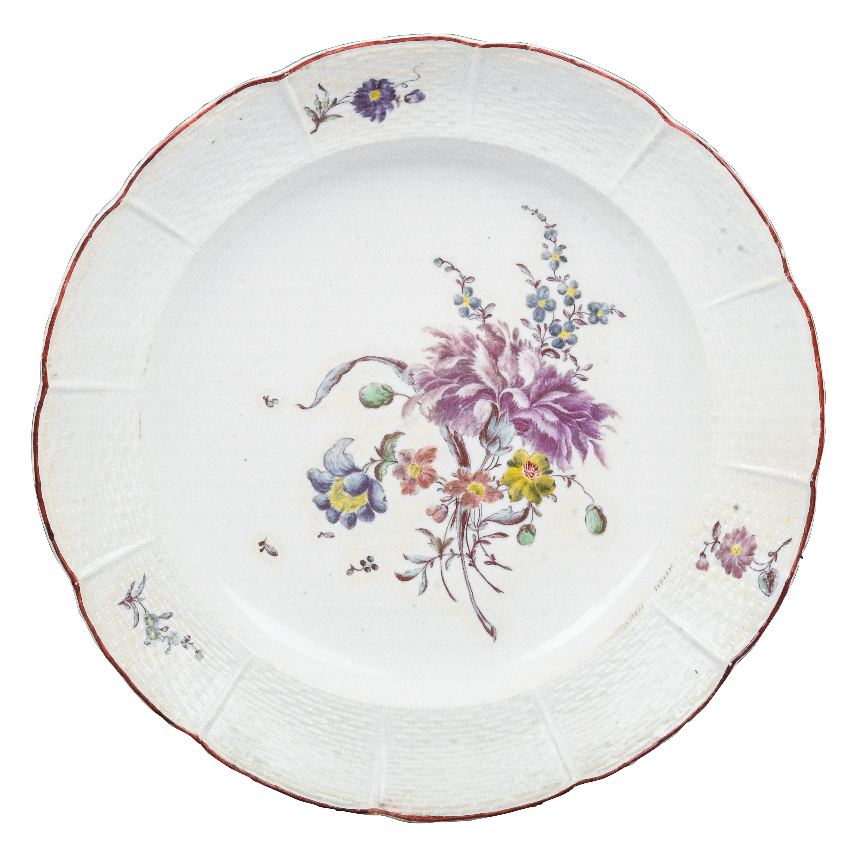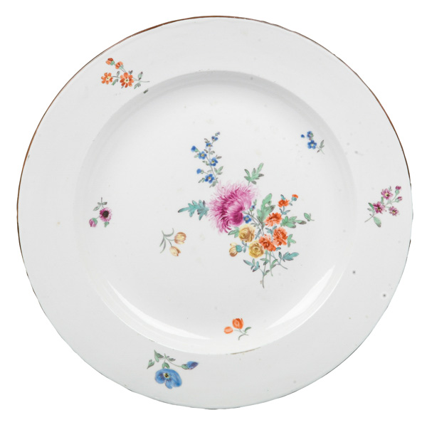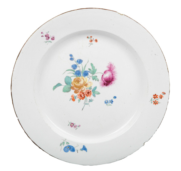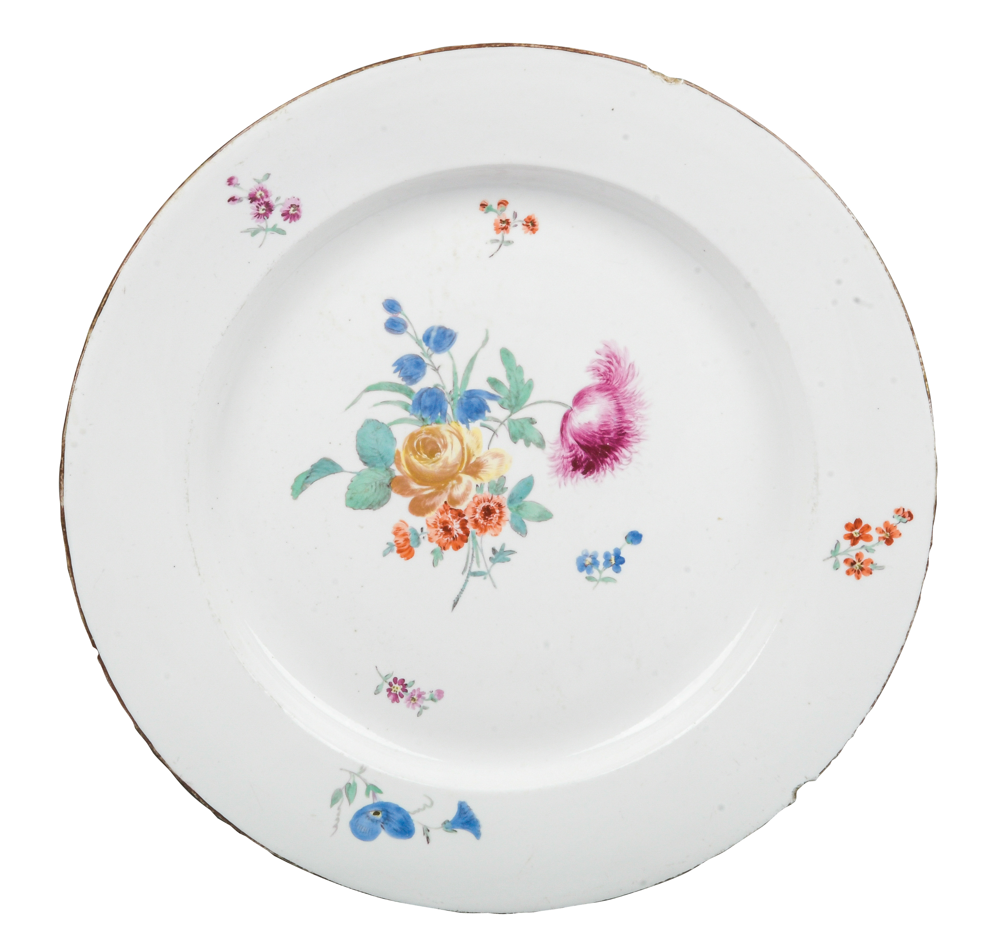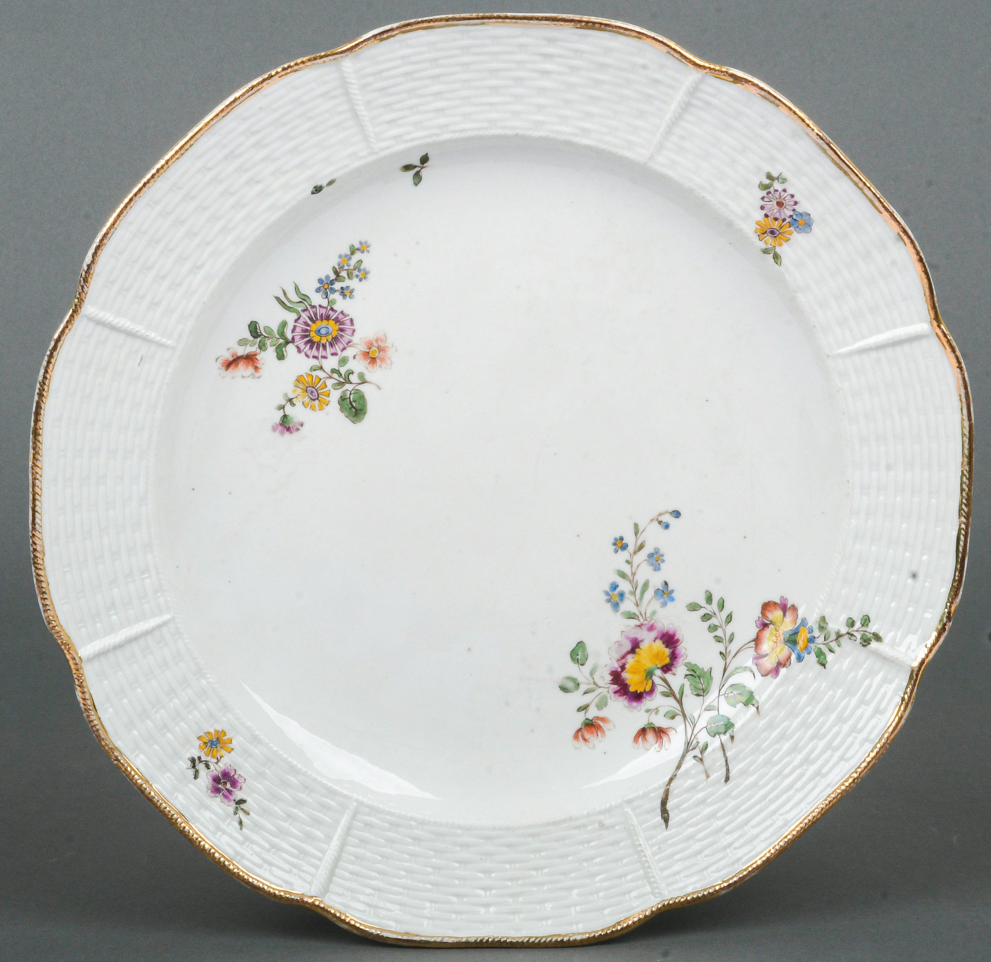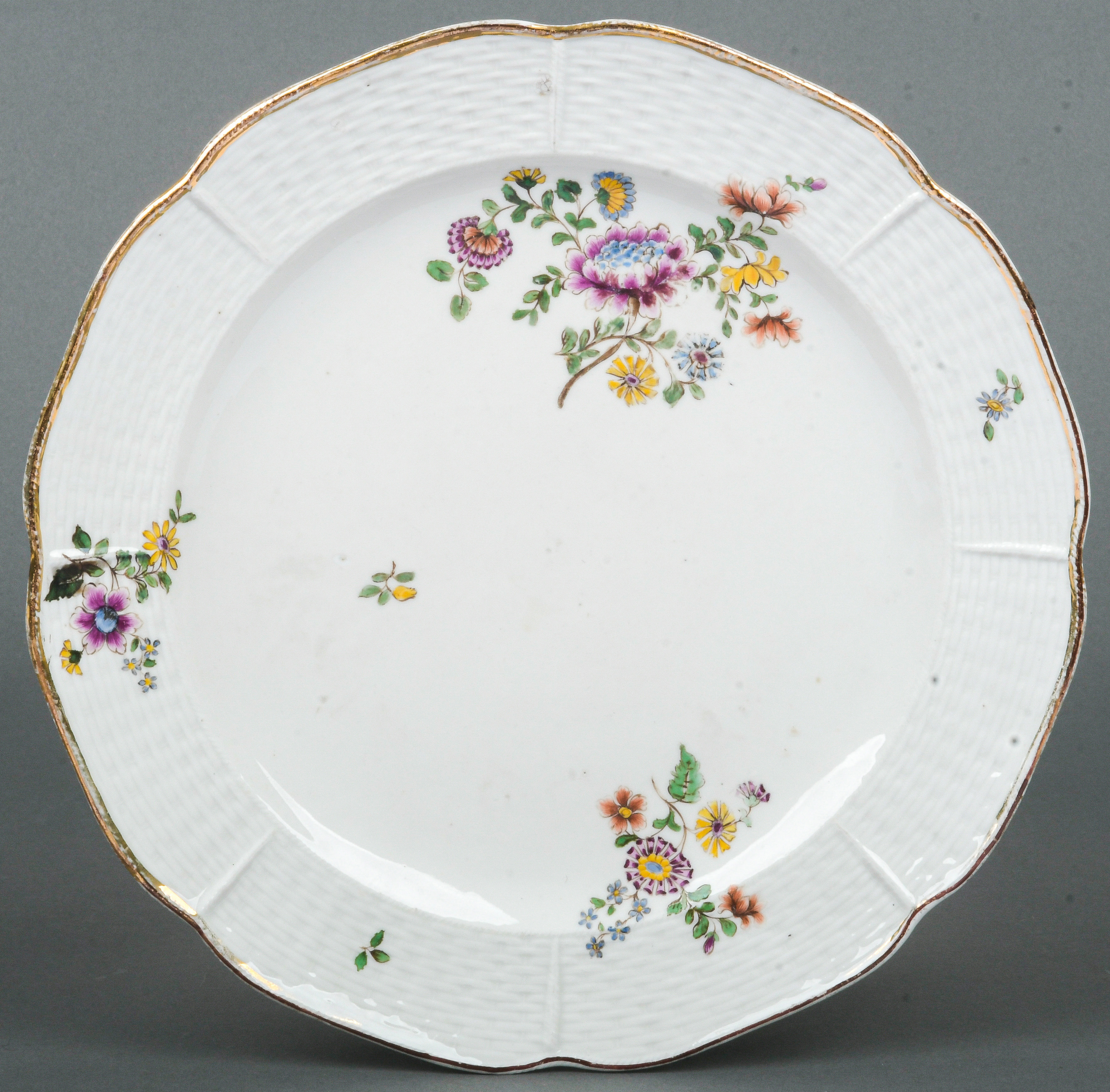 Rund gemuldet, mit Korbflechtrand, gold und kapuzinerbraun gesäumt. Spiegel bunt bemalt mit Straßburger indianischen Blumen. Porzellan, verso sehr seltene unterglasurblaue Rautenschildmarke mit „PH“, Ritzziffer „3“, REM Sammlungs-No. 02284. Vgl. B. Beaucamp-Markowsky, S. 37, Nr. 2.